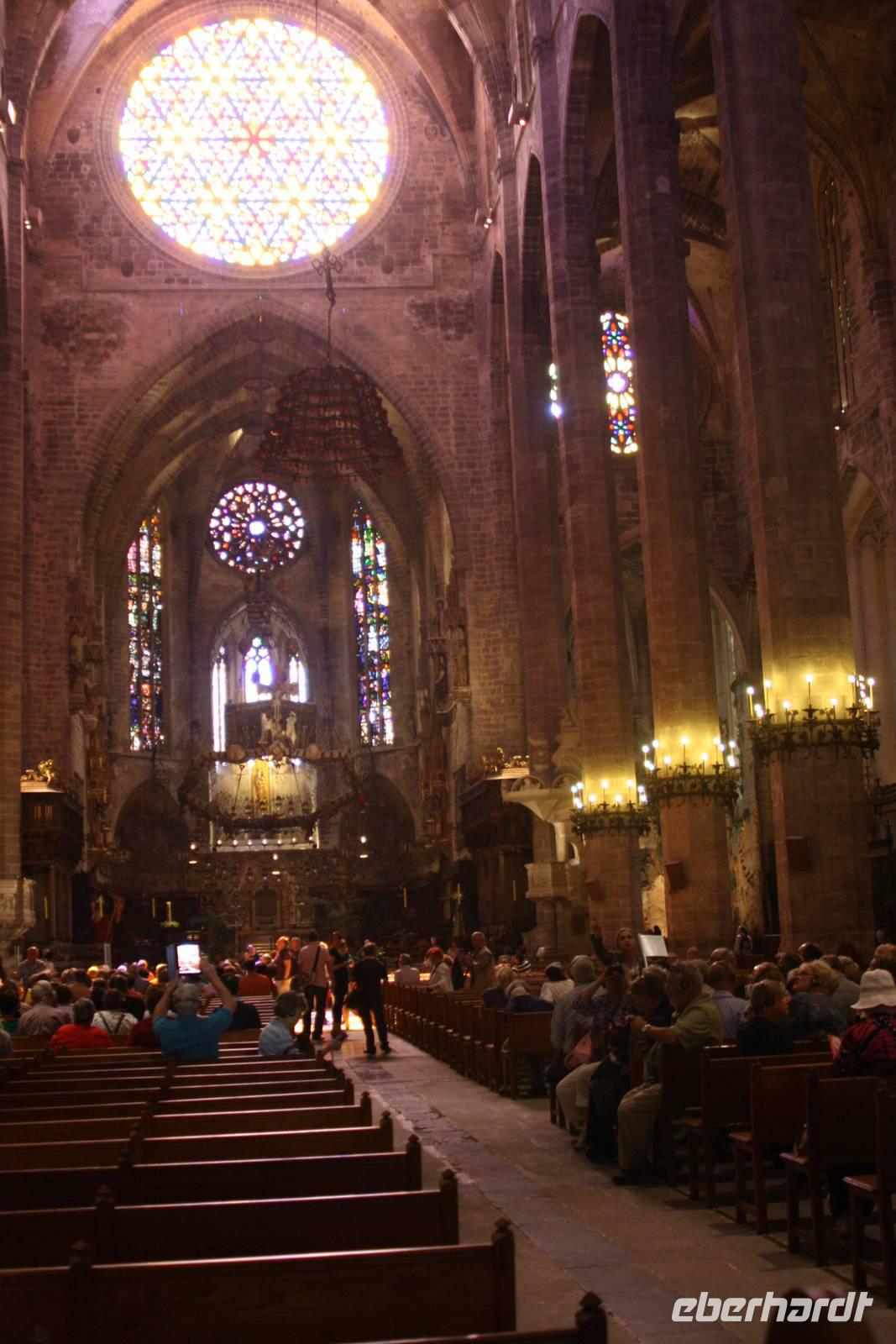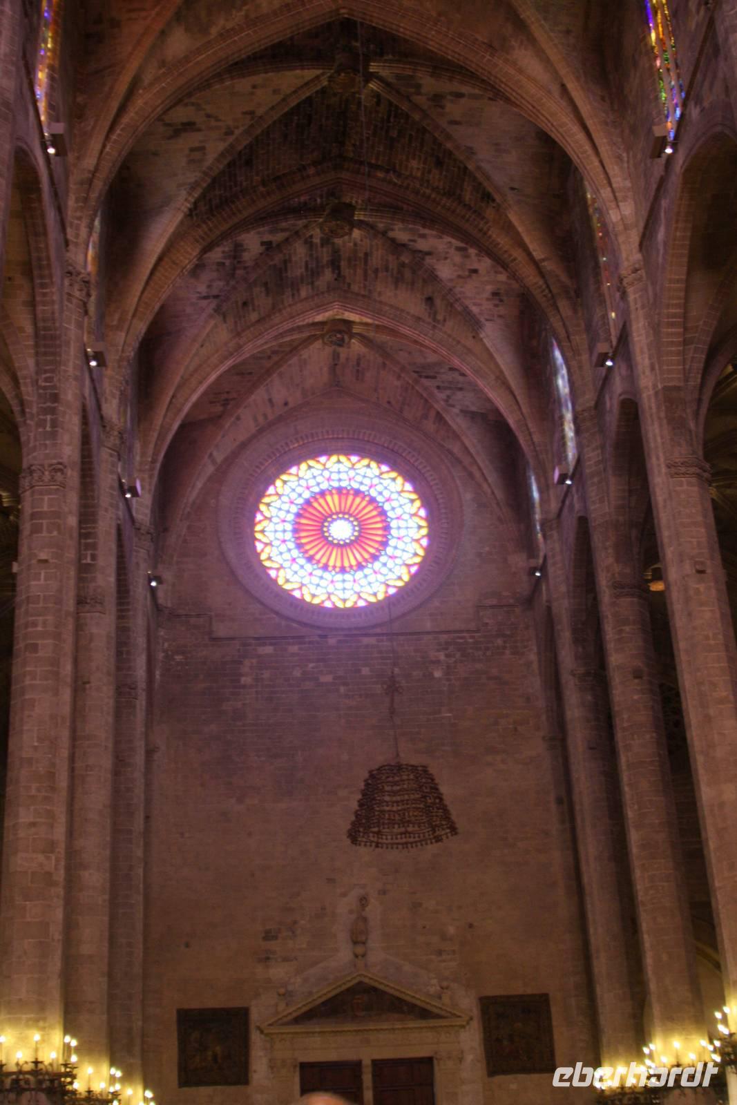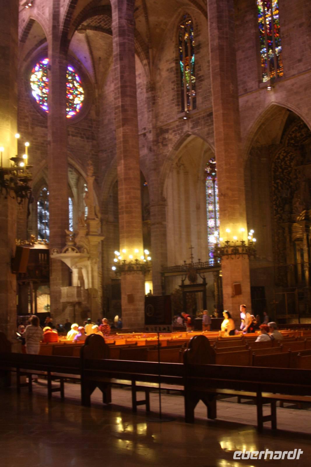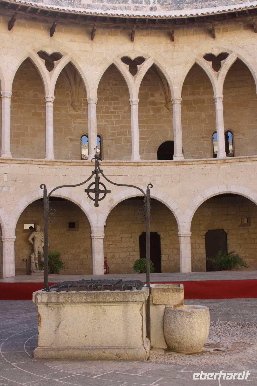 Um kurz vor um neun treffen wir an der Rezeption unsere örtliche Reiseleiterin für die kommende Woche: Magdalena. Markenzeichen: gelber Schirm. So kann ja nichts mehr schief gehen. Auch der Bus wartet schon auf uns und so fahren wir in die Hauptstadt der Balearen, nach Palma de Mallorca. Vorbei an der berühmten Kathedrale erreichen wir das Hard Rock Cafe Mallorca. Noch ist nicht sehr viel los in der Stadt. Nur einige Kreutzer liegen schon im Hafen und deren Ausflüge werden sicher auch bald los gehen. Unser erstes Ziel am heutigen Tag ist Schloss Bellver, welches auf einer Höhe von 113 Metern über der Stadt thront und von einem grünen Pinienwald umgeben ist. Magdalena holt unsere Eintrittskarten und führt uns im Schloss Bellver, dem einstigen Sommersitz der spanischen Könige. Mit ihrem kreisrunden Grundriss ist das Schloss einzigartig in Spanien. Magdalena erklärt uns die wechselhafte Geschichte des Castells und wir bestaunen die zweigeschossigen Arkandengänge. Über Treppen gelangen wir auf die Dachplattform und bewundern von hier den schönen Blick auf Palma mit seinem Jachthafen und der Kathedrale. Anschließend nutzen wir die Zeit, auch die Innenräume des Castells zu besichtigen. Zwar ist das Schloss wenig möbliert oder gar dekoriert aber der Thronsaal und das Kaminzimmer sind eindeutig erkennbar. Zurück am Bus bringt uns José entlang des Hafens zur gewaltigen Kathedrale, dem Wahrzeichen Palma de Mallorcas. Auch hier erfahren wir eine Führung durch Magdalena. Zunächst teilt sie uns Kopfhörer aus, damit wir sie besser durch ihr Mikrofon verstehen können. Der Dom, oder La Seu, wie sie die Mallorquiner nennen, ist auch als „Kathedrale des Lichts" bekannt. Insbesondere die große Fensterrossette mit ihren über 1.000 bunten Einzelscheiben sorgt für ein einmaliges Farbenspiel im Inneren des Doms. Ganz besonders beeindruckend ist der Altar, der von Antoni Gaudi stammt und stark an den Altar in der La Sagrada Familia in Barcelona erinnert. Die Kathedrale ist wirklich sehr imposant und eindrucksvoll. Gegen Mittag spazieren wir zusammen mit Magdalena durch die engen Gassen der Stadt und werfen einen kurzen Blick in die Innenhöfe der Stadt. Weiter geht es über den Placa Major zu einem der drei großen Märkte der Stadt. Heute ist Montag und die Stände sind aufgrund des Wochenendes nicht alle besetzt und besonders die Fischstände haben geschlossen, dennoch erhalten wir einen guten Einblick in das alltägliche Leben der Mallorquiner. Frisches Obst und Gemüsestände finden sich neben zahlreichen Fleischereien, die saftigen Schinken, Salamis und weitere Wurstsorten. Wer einen Hunger verspürt, kann sich an den Tapas-Ständen eine Kleinigkeit holen, eben typisch spanisch. Der restliche Nachmittag steht uns frei zur Verfügung. Ein Großteil der Gruppe fährt zusammen mit Magdalena zurück zu unserem Hotel in Playa de Palma und verbringt die Zeit beim Schwimmen im Mittelmeer oder bei einem Spaziergang entlang der Promenade. Gemeinsam mit Familie Hauswald bleibe ich noch in der Stadt. Zunächst bestellen wir uns in einem kleinen Restaurant einen Kaffee. Danach spazieren wir durch die Straßen der Hauptstadt, unter anderem auch über die Blumenstraße und der La Rambla. Wir bestaunen die Pflanzenpracht, ein Institut und die Hinterhöfe der vielen Gassen. Zum Abschluss unseres Aufenthaltes nehmen wir in einem Restaurant gegenüber der Kathedrale Platz und bestellen uns einen typischen Sangria, der uns sehr gut schmeckt. Mit dem Linienbus Nummer 15 gelangen wir schließlich zurück zu unserem Hotel, wo wir wieder gemeinsam mit der Gruppe zu Abend essen.