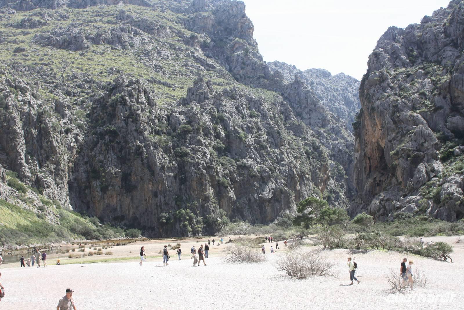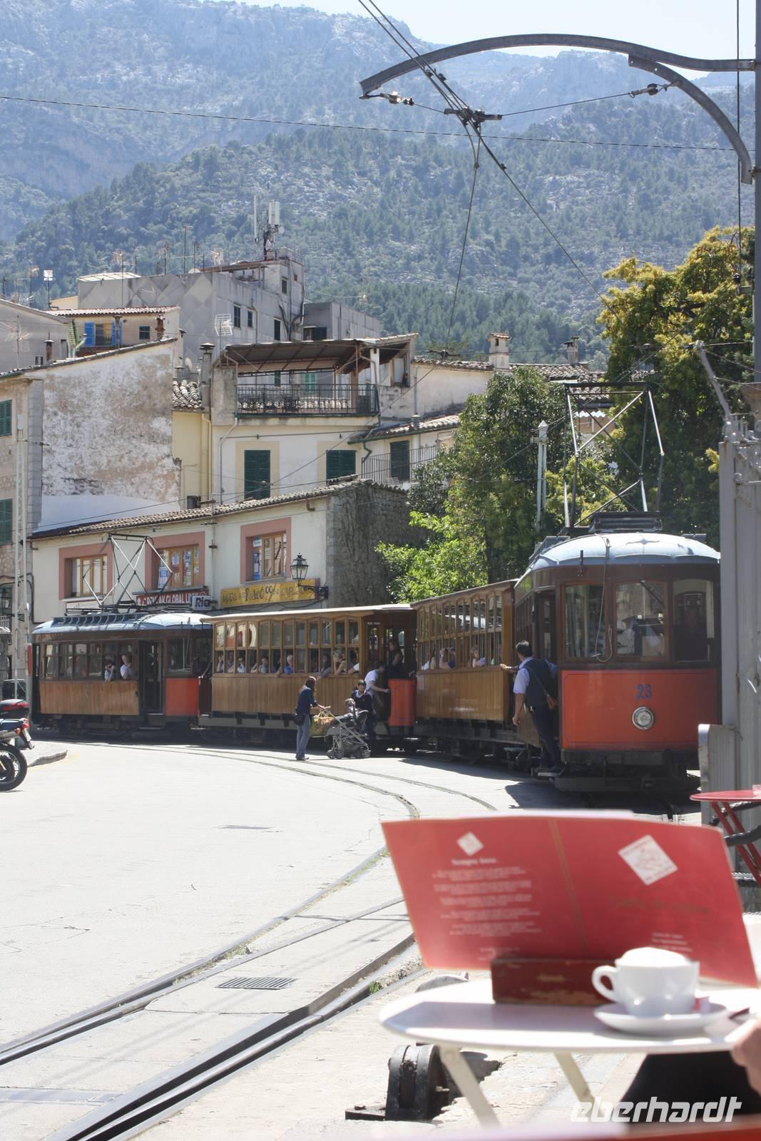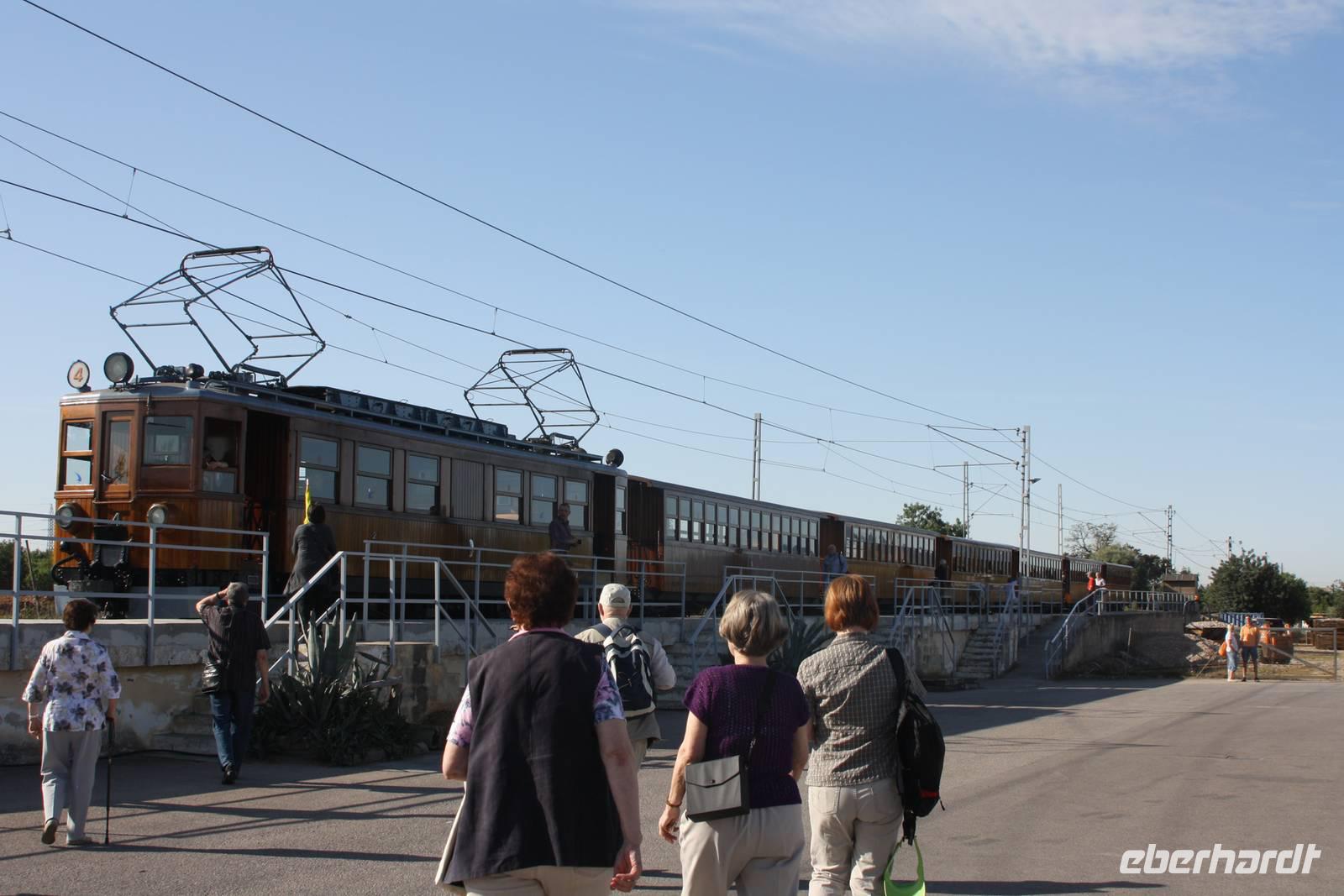 Auch unser heutiger Ausflug, die Inselrundfahrt, startet pünktlich um neun Uhr mit Magdalena. Neu an Bord begrüßen wir unseren Bus-Chauffeur Toni. Da wir die Fahrkarten für den „Roten Blitz" schon für heute Vormittag bekommen haben, stellen wir das Programm um. Noch haben wir Zeit bis zur Abfahrt und daher unternehmen Toni und Magdalena noch eine kleine Rundfahrt durch Palma mit uns. Wir fahren vorbei an der teuersten Einkaufsstraße Mallorcas und dem Theater Palmas zur La Rambla, der Straße, auf der wahnsinnig viele, bunte und schöne Blumensträuße verkauft werden. Anschließend erreichen wir die Bahnstation des „Roten Blitz". Unsere Gruppe hat sogar einen Wagon für sich allein. Pünktlich 10:00 Uhr legt der „Rote Blitz" los in Richtung Soller. An uns ziehen fabelhafte mallorquinische Villen, Olivenhaine und kleine Städtchen vorbei. Durch mehrere Tunnel erreichen wir nach rund einer halben Stunde einen Stopp, von dem wir ein einzigartiges Fotomotiv auf Soller haben. Angekommen am Bahnhof von Soller steigen wir auch gleich in die Straßenbahn um, die uns zum Hafen von Soller bringt. Während unserer Fahrt weht uns der erfrischen Duft von Orangen, die Sonne strahlt vom azurblauen Himmel - besser kann es uns nicht gehen. Im Hafen von Soller besteigen wir den Katamaran, der uns nach Sa Calobra bringt. Mit einem Jäckchen begleitet sitzen wir auf dem Oberdeck des Schiffes und lassen die Felsformationen der Küste an uns vorbeiziehen. In Sa Calobra, einem kleinen touristischen Ort mit vielen Restaurants und Souvenirläden verbringen wir unsere Mittagspause. Wer sich nicht an typischen Tapas stärken möchte, unternimmt eine kleine, leichte Wanderung zur nahegelegenen Paradiesschlucht, Torrent de Pareis. Am zeitigen Nachmittag erwartet uns Chauffeur Toni am Bus und wir gelangen über die Serpentinen des Tramuntana-Gebirges nach Inca. Zwischendurch eröffnen sich immer wieder neue Ausblicke auf das mallorquinische Gebirge und das Mittemeer. In Inca, bekannt für Lederwaren, halten wir für eine letzte Kaffeepause. Die Lederwaren, die hier angepriesen werden, sind doch nicht die günstigsten im Kaufpreis und daher bringen uns Magdalena und Toni ohne neue Lederwarenartikel zurück zu unserem 4-Sterne-Hotel „Acapulco Playa" in Playa de Palma.