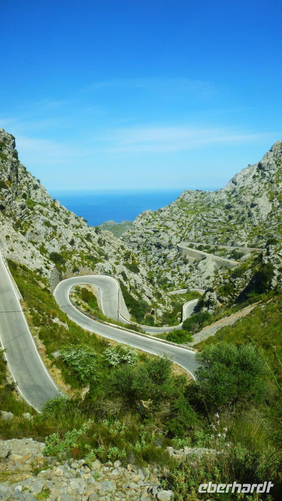 Wer Serpentinen mag, für den ist der heutige Tag ein großes Abendteuer, denn wir überqueren das Tramuntana Gebirge auf der wohl kurvigsten Straße der Insel. Auch der höchste Berg Mallorcas, der Puig Mayor, wird sich heute wieder blicken lassen. Pedro schlägt sich wie immer tapfer und bringt uns sicher zu unserem ersten Zwischenstopp, einem Kiosk, bei dem man unter anderem Kräuterschnaps und frisch gepressten Orangensaft erwerben kann. Für viele Radfahrer sind diese Verkaufsstände im Gebirge ein Segen. Der anstrengenste Teil der Fahrt ist für diese hiermit überwunden, denn nun geht es nur noch bergab Richtung Sa Calobra.