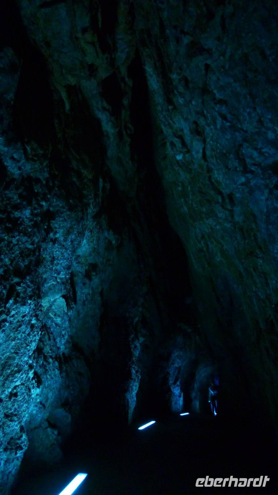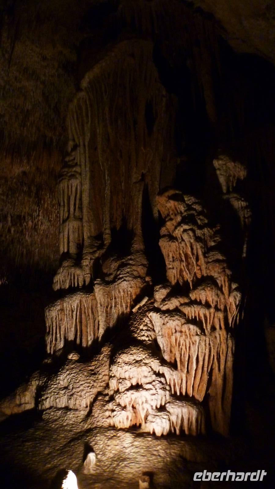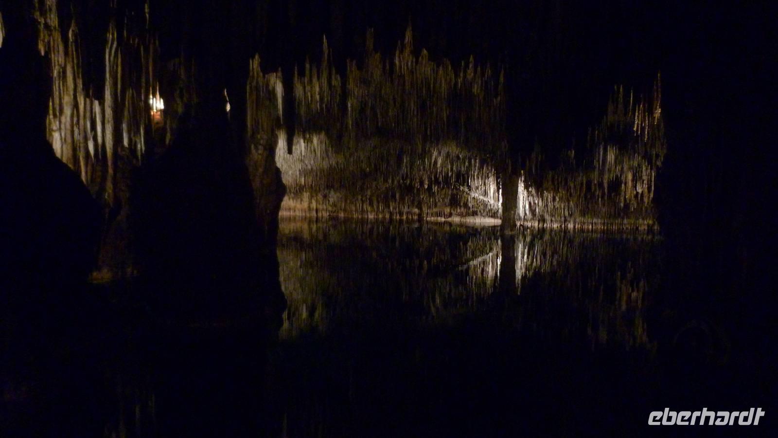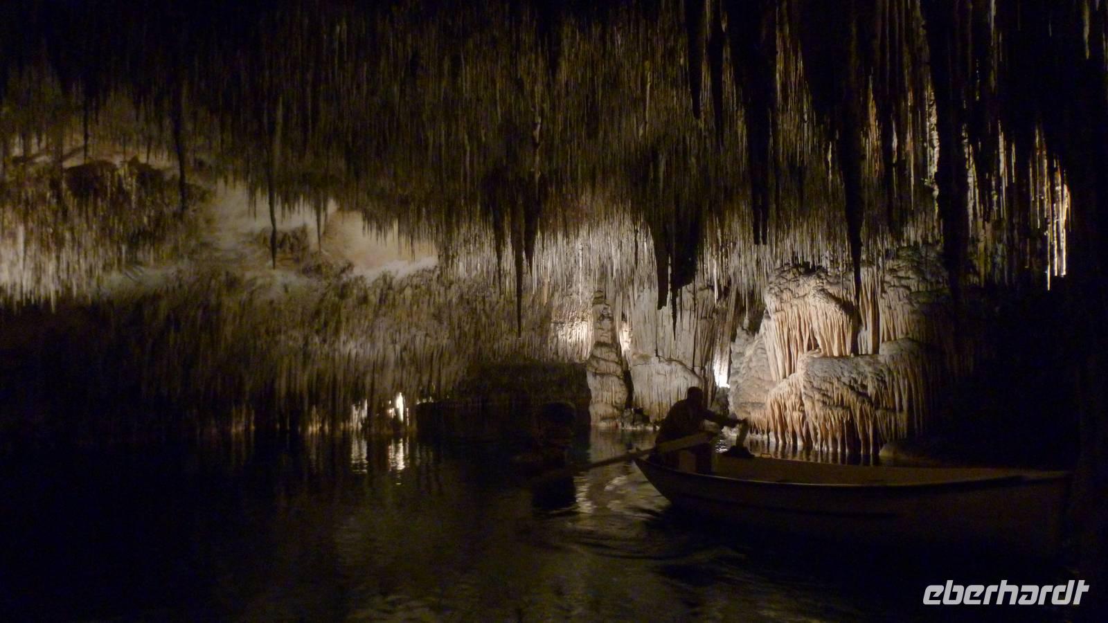 Nach einer Stunde Aufenthalt darf unser Bus wieder die schmalen Serpentinen hinunter fahren und bringt uns direkt zu den Drachenhöhlen „Cuevas del Drac" südlich des Ortes von Porto Cristo. Diese Tropfsteinhöhle ist eine der größten und berühmtesten der unterirdisch durchlöcherten Insel. Bizarre Formationen aus Kalkstein und glasklare Seen ruhen schon seit Jahrtausenden in diesen Höhlensystemen. Auf dem längsten unterirdischen See Mallorcas, dem Llac Martel (177m), wird uns ein ganz besonderes Schauspiel geboten. Nur ein wenig Licht erhellt den See als wie aus dem Nichts eine Musikerbesatzung aus drei Streichern und einem Pianisten auf Booten treibend die Stille bricht.
