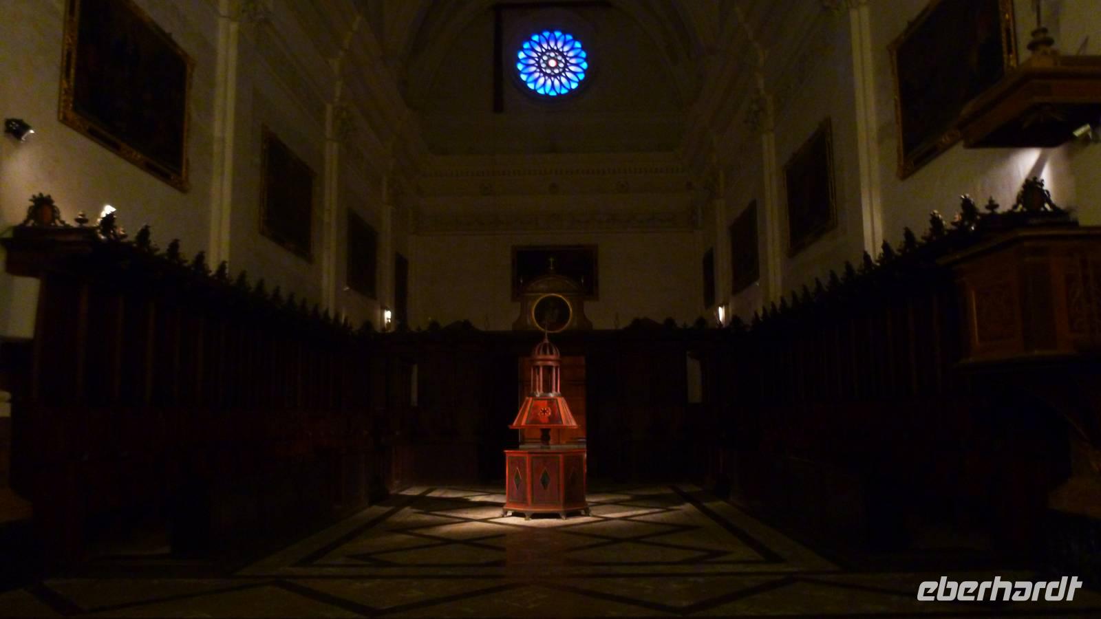 Unser letzter gemeinsamer Ausflugstag mit Magdalena bricht an und wir machen uns wie gewohnt nach dem Frühstück auf den Weg. Erster Halt ist das auf dem gleichnamigen Berg am Rande der Inlandsebene gelegene Kloster von San Salvador. Magdalena erzählt uns von der damaligen Pilgerkirche und der Statue der „kleinen Madonna", welche nun den Chor der Klosterkirche prägt. Wir lassen die Atmosphäre etwas auf uns wirken als plötzlich Musik ertönt. Ein beeindruckendes Orchesterstück mit Männerchor füllt den Raum und dazu aufbauende Lichteffekte untermalen die Architektur des Klangkörpers. Vom Berg San Salvador aus können wir trotz leicht dunstiger Sicht über das weite Flachland Mallorcas schauen.