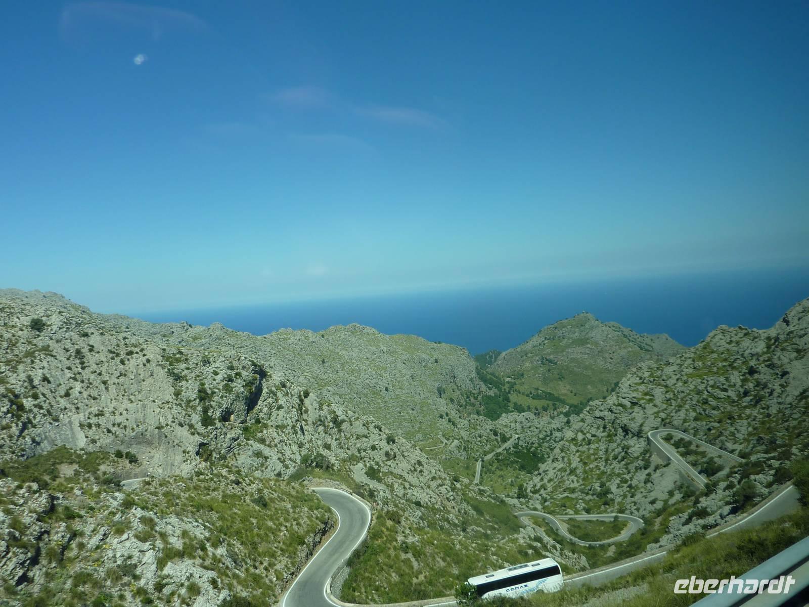 Zum vorerst letzten Mal begrüßten wir Magdalena und Pedro an unserem Bus. Bei strahlendem Sonnenschein und blauem Himmel starteten wir unsere Inselrundfahrt. Wir fuhren durch die Gebirgskette des Tramuntana in Richtung Sa Calobra. Unterwegs stoppten wir an zwei wunderschönen Fotoplätzen. Von der Natur und der Schönheit des Tramuntana beeindruckt fuhren wir weiter zu einem Stausee. An dem Embalse de Gorg Blau haben wir eine kleine Kostprobe des klassischen Herbas genommen. Dies ist ein Kräuterlikör der Insel Mallorca zu dem wir auch kleine Mandelplätzchen probierten. Nach dieser kleinen Überraschung führen wir weiter die Straße hinauf um dann eine beeindruckende Küstenstraße hinab nach Sa Calobra zu fahren. Auf dem Gipfel angekommen bot sich uns ein atemberaubender Blick auf die Schlucht sowie die Küstenstraße, welche ein Gefälle von bis 10% hat. Pedro meisterte die erste Kurve, den „Krawattenknoten" mit Bravour. Nach einer atemberaubenden Abfahrt erreichten wir Sa Calobra. Nach etwa 10 Minuten Spazierweg erreichten wir die atemberaubende Schlucht. 13:40 Uhr startete unsere Bootsfahrt entlang der Küste bis nach Port de Soller. Vom Meer aus konnten wir den Aussichtspunkt, welchen wir an den Vortagen in Port de Soller besuchten, wiedererkennen. Nach 60 Minuten verließen wir das Schiff und stiegen in die Straßenbahn. Nach einer 20-minütigen Fahrt erreichten wir Soller. Bei einem Café ließen wir das Flair der Stadt auf uns wirken, bevor es mit dem „RotenBlitz" nach Palma ging. Auf der 40-minütigen Fahrt passierten wir den Ort Bunyola, welches eines der anmutigsten Dörfer im Herzen des Tramuntana ist. Es war ein beeindruckendes Landschaftserlebnis welches von 13 Tunneln unterbrochen wurde. Am Ende der Fahrt wartete schon Pedro auf uns, um uns in das Hotel Gran Fiesta zu chauffieren. Bei einer emotionalen Rede verabschiedeten sich Magdalena und Pedro von uns. Am heutigen Abend wartete noch ein typisch mallorquinisches Abendessen auf uns. Gemeinsam spazierten wir in das Restaurant Rancho Picadero. Wir probierten Kostproben, wie Datteln in Schinken, Paprikaschoten mit Meersalz, Kroketten mit Spinat, Fleisch und Fisch sowie Leber vom Lamm. Passend dazu genossen wir mallorquinischen Rosé- und Rotwein. Eine wunderschöne Reise mit traumhaftem Wetter und unzähligen Erlebnissen ging nun zu Ende...