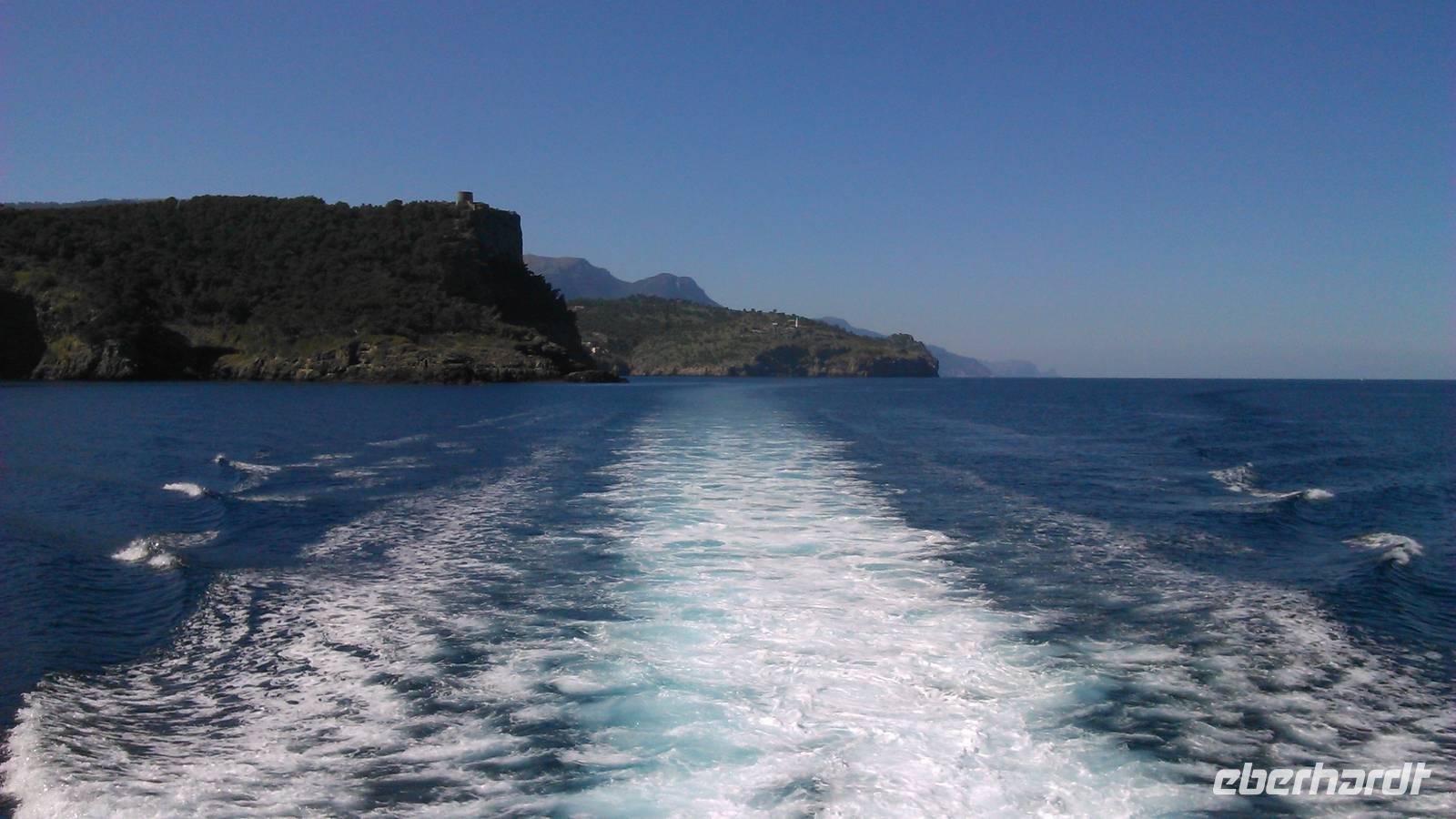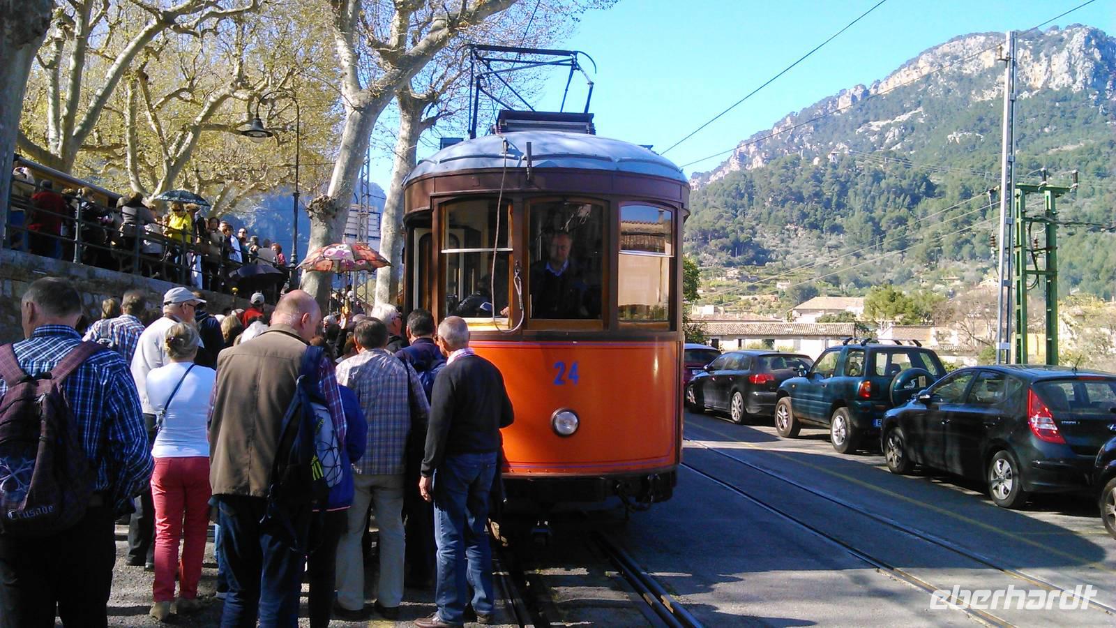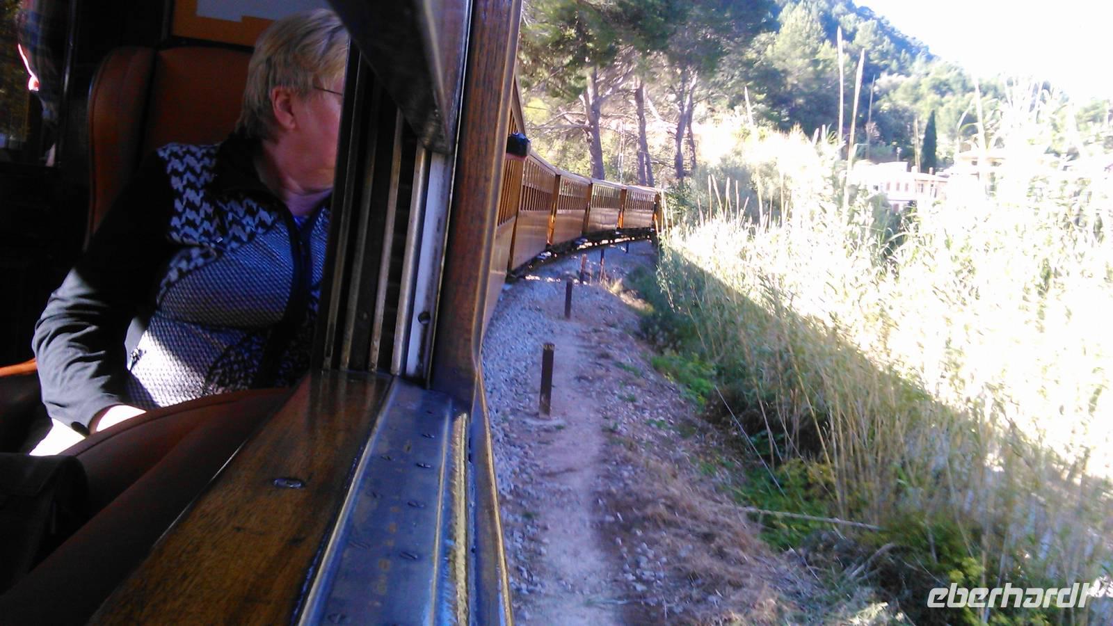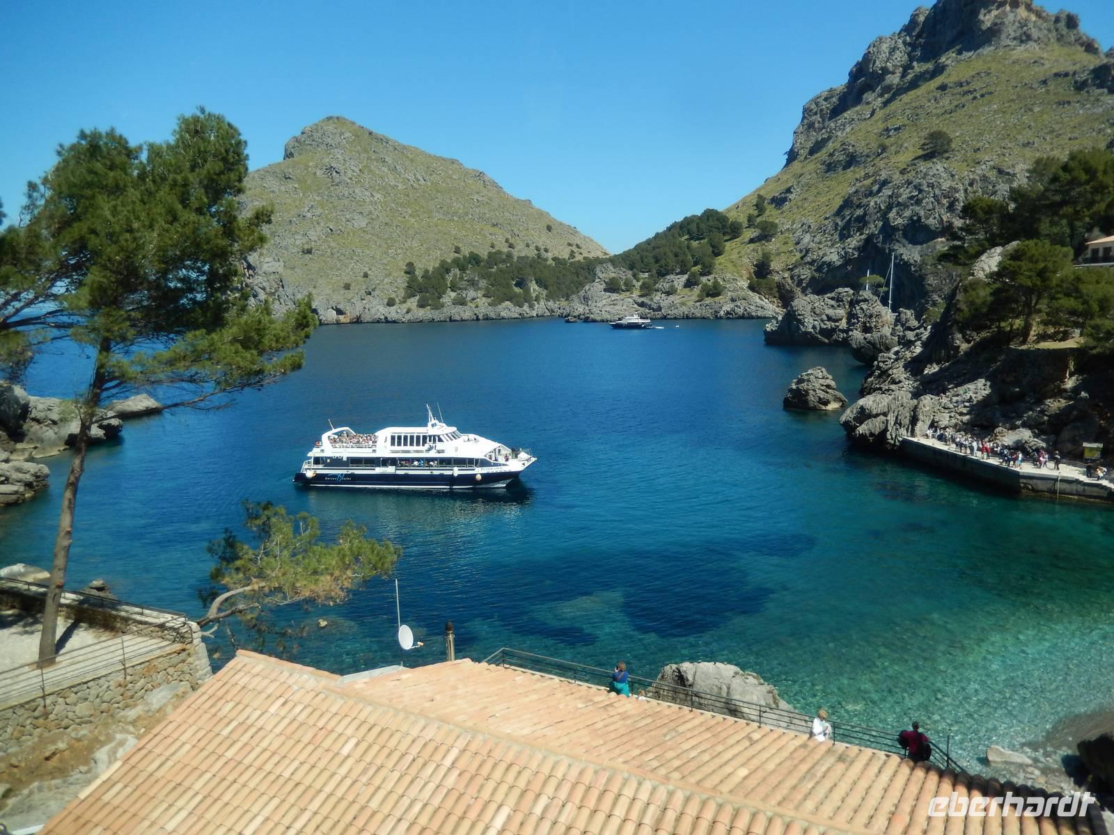 Nach einem kräftigen Frühstück ging es nun auf eine aufregende Reise. Vier verschiedene und zum Teil auch nostalgische Beförderungsmittel konnten wir an einem Tag benutzen. Zuerst brachte uns Christopher, unser Chauffeur, zu einem Bahnhof außerhalb der Stadt, wo der berühmte „Rote Blitz" auf uns wartete. Eine, mit rötlich, schimmernden Holz verkleidete Eisenbahn, brachte uns durch das Gebirge nach Sollér wo wir in die traditionelle Straßenbahn umstiegen welche uns zum Hafen von Port Sollér brachte. Erinnerungen an vergangene Zeiten wurden in den teilweise mit Holzbänken oder Ledersitzen bestückten Wagons wach. Am Hafen angekommen ging es sofort auf einen Katamaran. Das Meer glich einer blauen Ebene und so war die Überfahrt in den Naturhafen von Sa Calobra, vorbei an den malerisch aus dem Meer steigenden Felsmassiven einfach nur zum genießen.