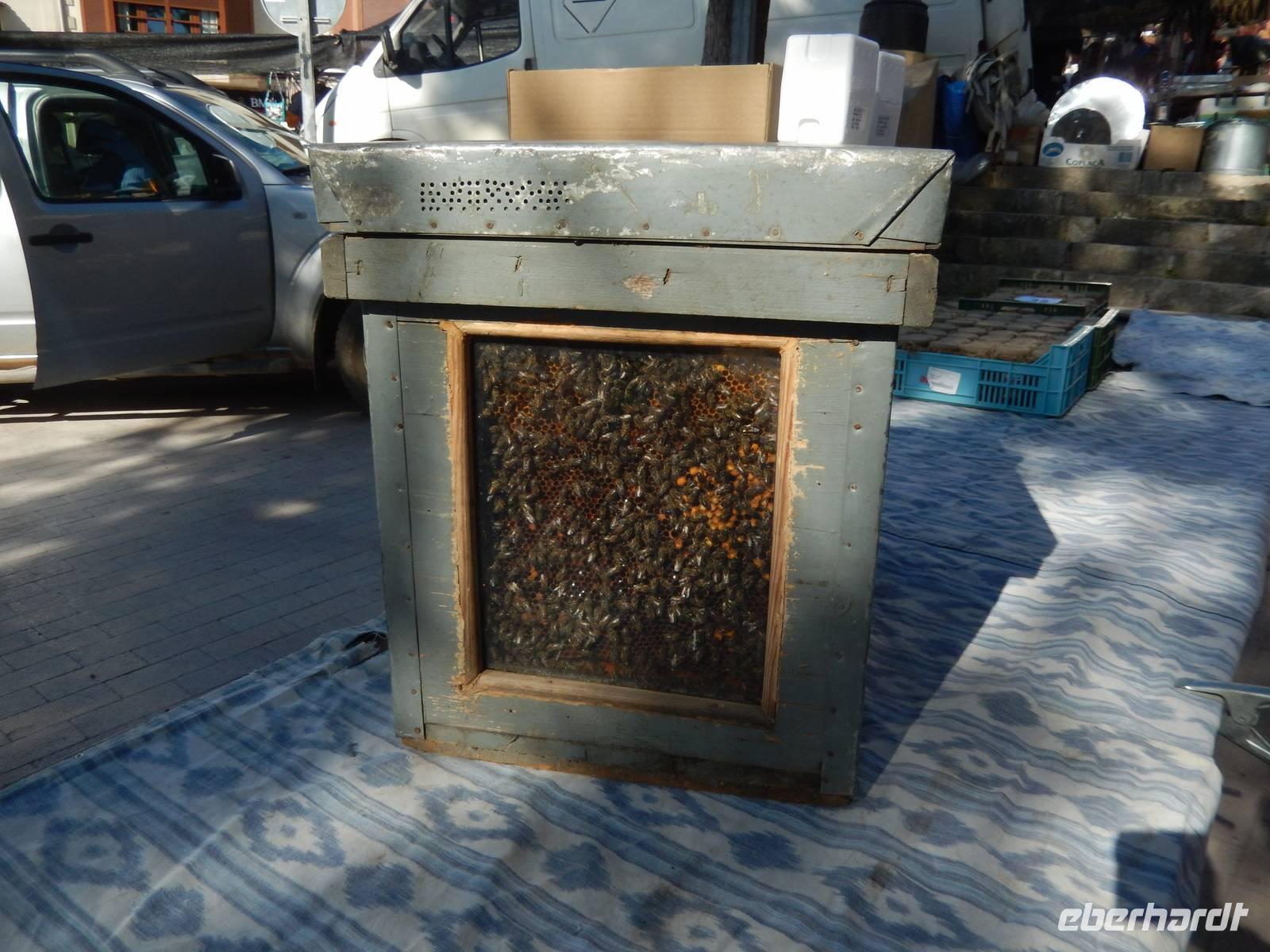 Es war genau das Wetter, welches man sich für diesen Tag wünschen konnte. Angenehme und vor allem sonnige 18 Grad im Schatten und klare Sicht über die komplette Insel. Pünktlich um neun holte uns Magdalena und unser Buschauffeur Christopher am Hotel ab. Zuerst ging es in die kleine Stadt Sineu im Norden Mallorcas. Hier konnten wir am regen Treiben der Händler auf dem jeden Mittwoch stattfindenden Wochenmarkts Teil haben. Vom lebenden Tier bis hin zur Ledertasche, vom Brot bis hin zur Süßigkeit, alles war hier zu bekommen.