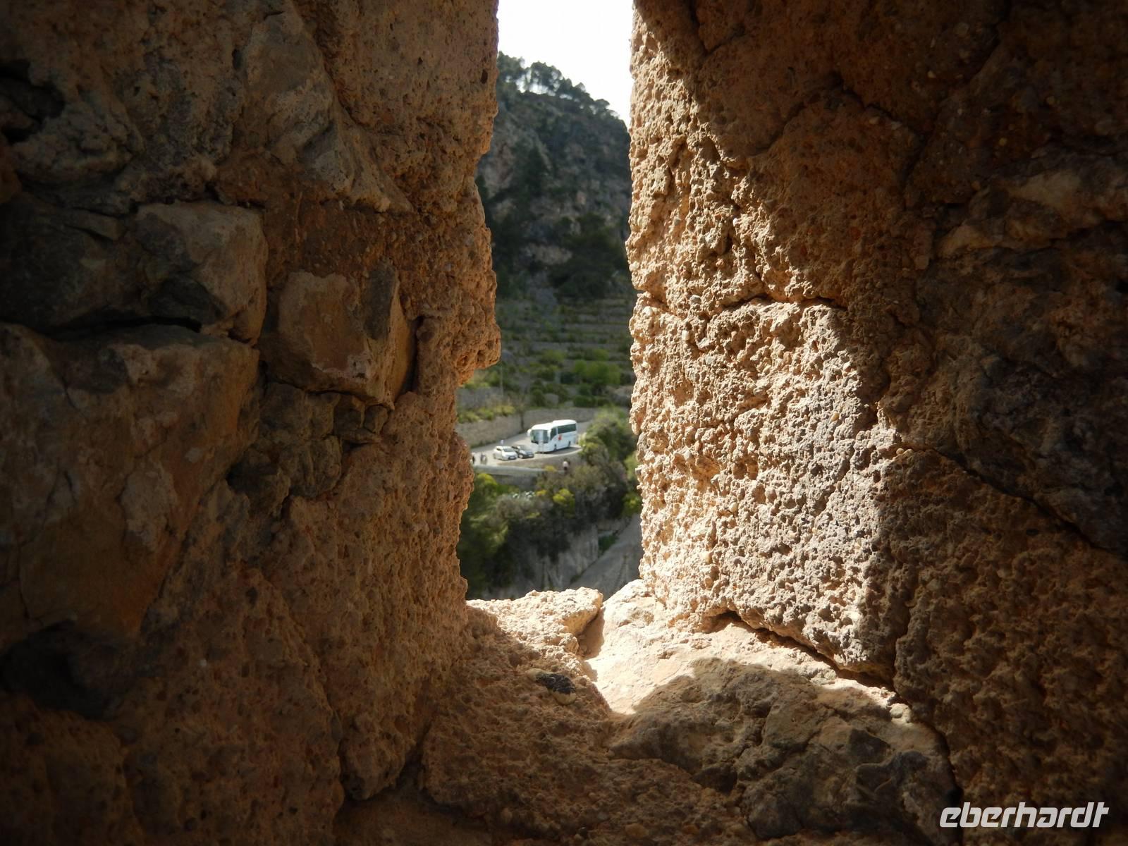Jetzt hatte Christopher wieder alle Hände voll zu tun denn es ging ein letztes Mal entlang der Westküste durch steile und enge Serpentinen. Während der Fahrt zur Finca La Granja passierten wir beeindruckende Terrassenanlagen mit uralten Olivenbäumen und anderen Früchten. Zwischendurch gab es natürlich wieder die Gelegenheit für ein besonderes Foto, diesmal auf einem gut erhaltenen Wachturm direkt auf einem Felsen der Steilküste.