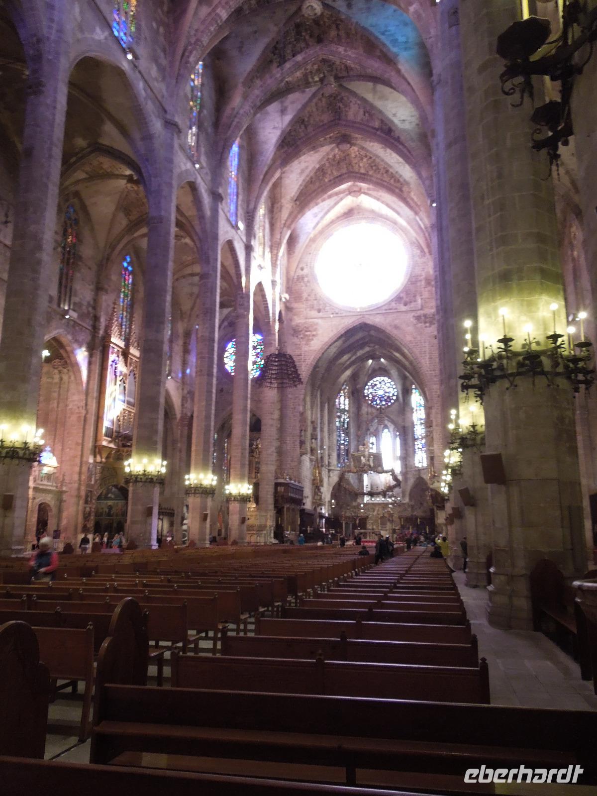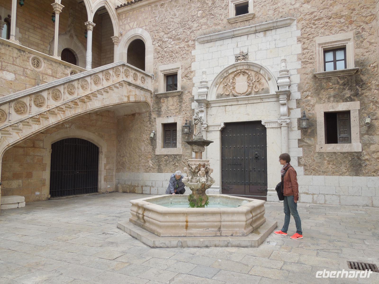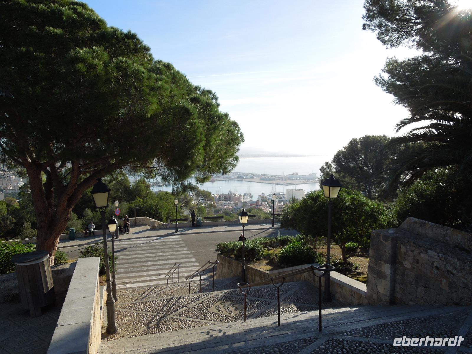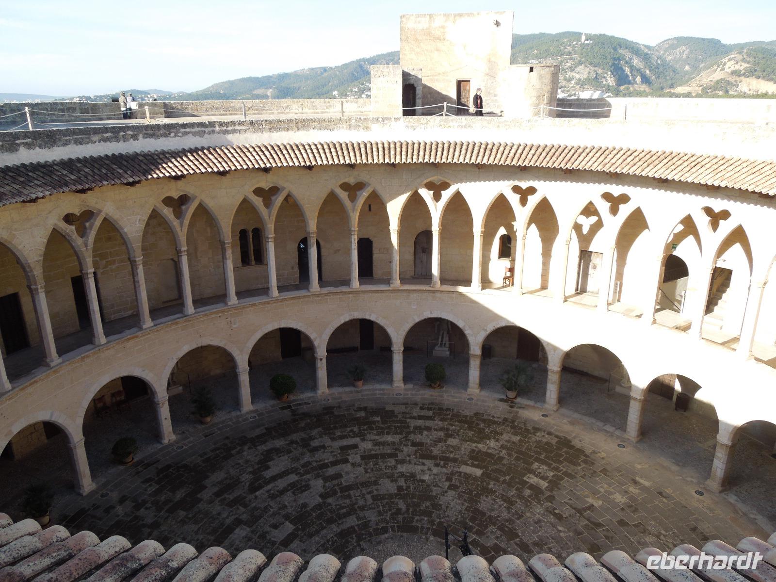 Nach einem ausgiebigen Frühstück fuhren wir mit unserem Busfahrer Christopher und unserer Reiseleiterin Magdalena in die lebendige Hauptstadt Mallorcas - Palma. Zuerst fuhren wir vorbei an der Kathedrale des Lichts zum Schloss Bellver, das in einiger Entfernung zur Stadt über die Bucht von Palma wacht. Die Festung aus dem 13./14. Jahrhundert ist die einzige Rundburg Spaniens und wurde auch als Gefängnis genutzt. Im Innenhof befindet sich ein doppelstöckiger Rundgang, der auch zum Dach der Anlage führt. Von dort hatte man einen fantastischen Blick auf ganz Palma und natürlich auch den Hafen. Nach einer Besichtigung durch Magdalena fuhren wir auch schon weiter zur Kathedrale la Seu. Die Kathedrale ist das Wahrzeichen der Hauptstadt. Der Legende nach hat ein Sturm Jaume I. bei seiner Reise über die Inseln überrascht und er hat die Jungfrau um Hilfe bittend ein Versprechen abgegeben, dass wenn er aus dieser Gefahr mit seinem Leben davonkommen sollte, er ihr zu Ehren eine Kirche bauen lässt. Der Bau der Kirche dauerte fast 400 Jahre. Im Inneren befindet sich eine riesige aus Glas bestehende Fensterrose, die bei Sonne ein buntes Lichtspiel zaubert. Anschließend besuchten wir eine der Markthallen Palmas und nahmen am bunten Treiben dort teil. Es gab eigentlich fast alles: Fisch, Fleisch, Käse, Gemüse, Obst, Kuchen... Danach zeigte uns Magdalena den Placa d' Espanya. Dort fuhr ein öffentlicher Bus wieder zum Hotel zurück. Hier gab es nun verschiedene Möglichkeiten: gleich oder später die ganze Strecke mit dem Bus fahren, die Hälfte der Strecke fahren und die andere Hälfte laufen oder gar die ganze Strecke zum Hotel zurück zu laufen. Nach einem gemeinsamen Abendessen, bei dem wir uns unsere Erlebnisse erzählten, gingen wir ins Bett.