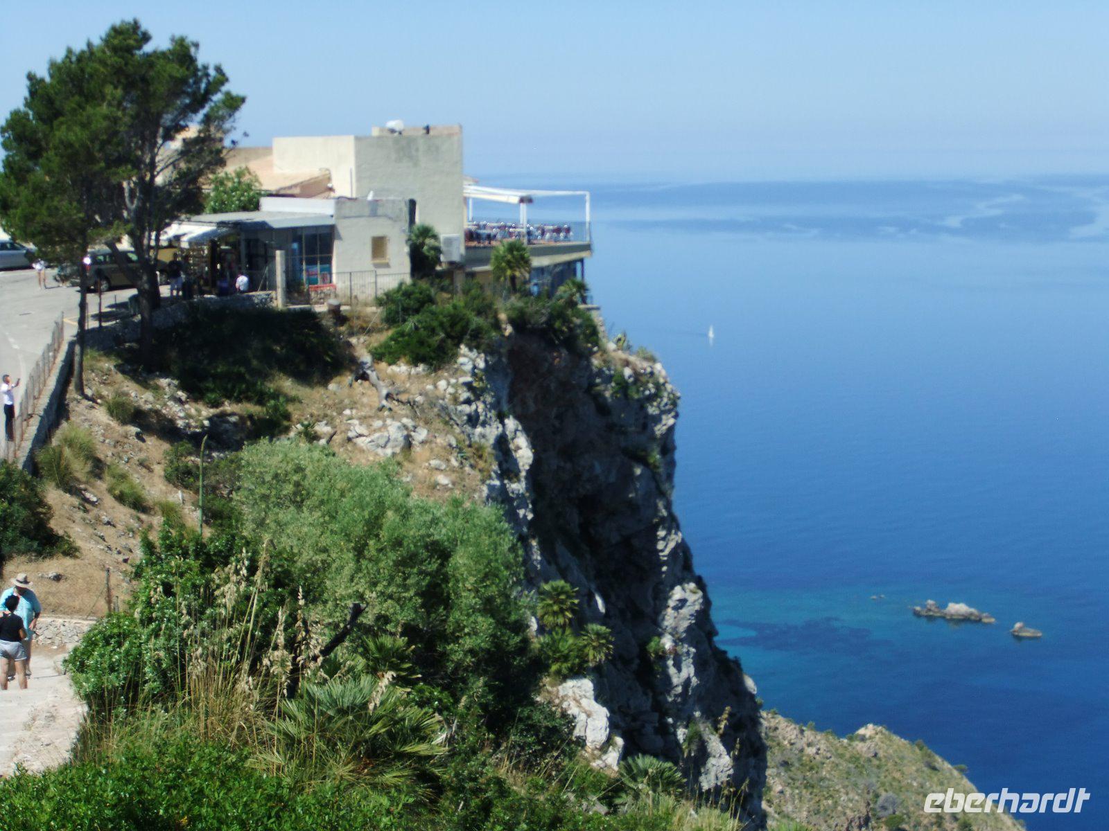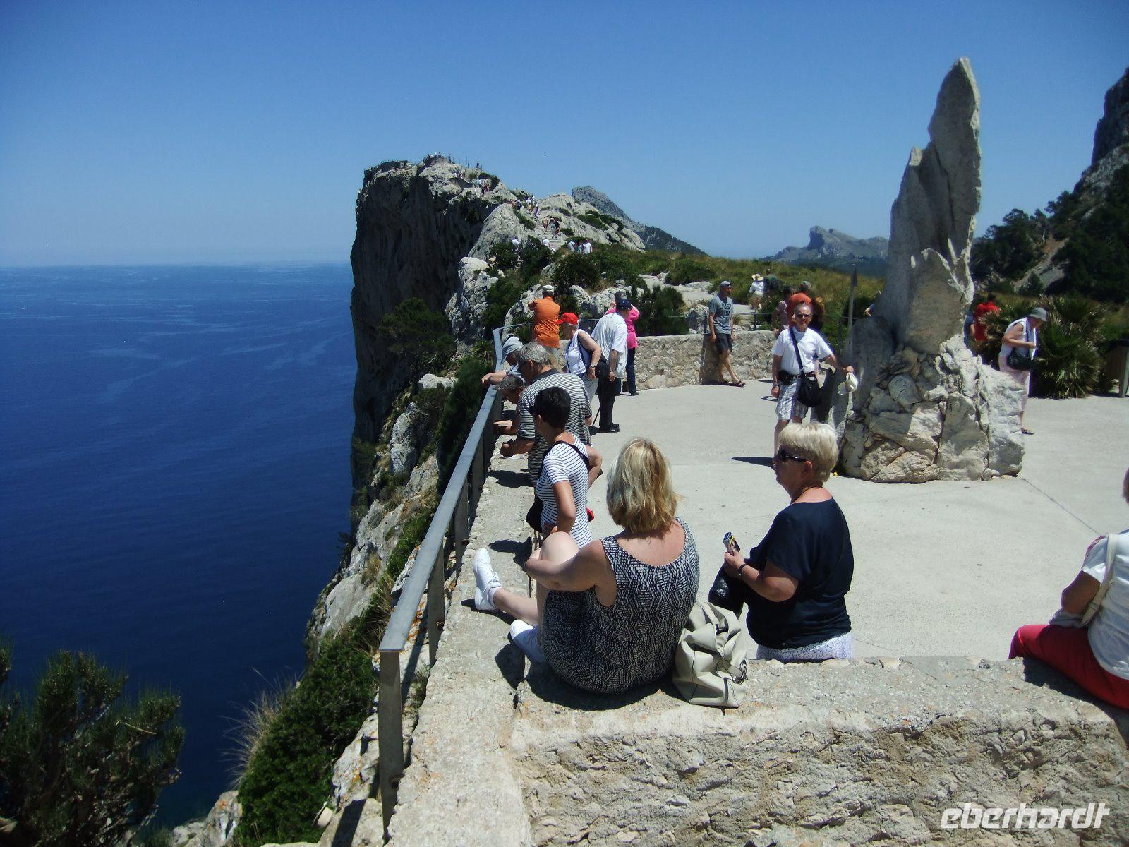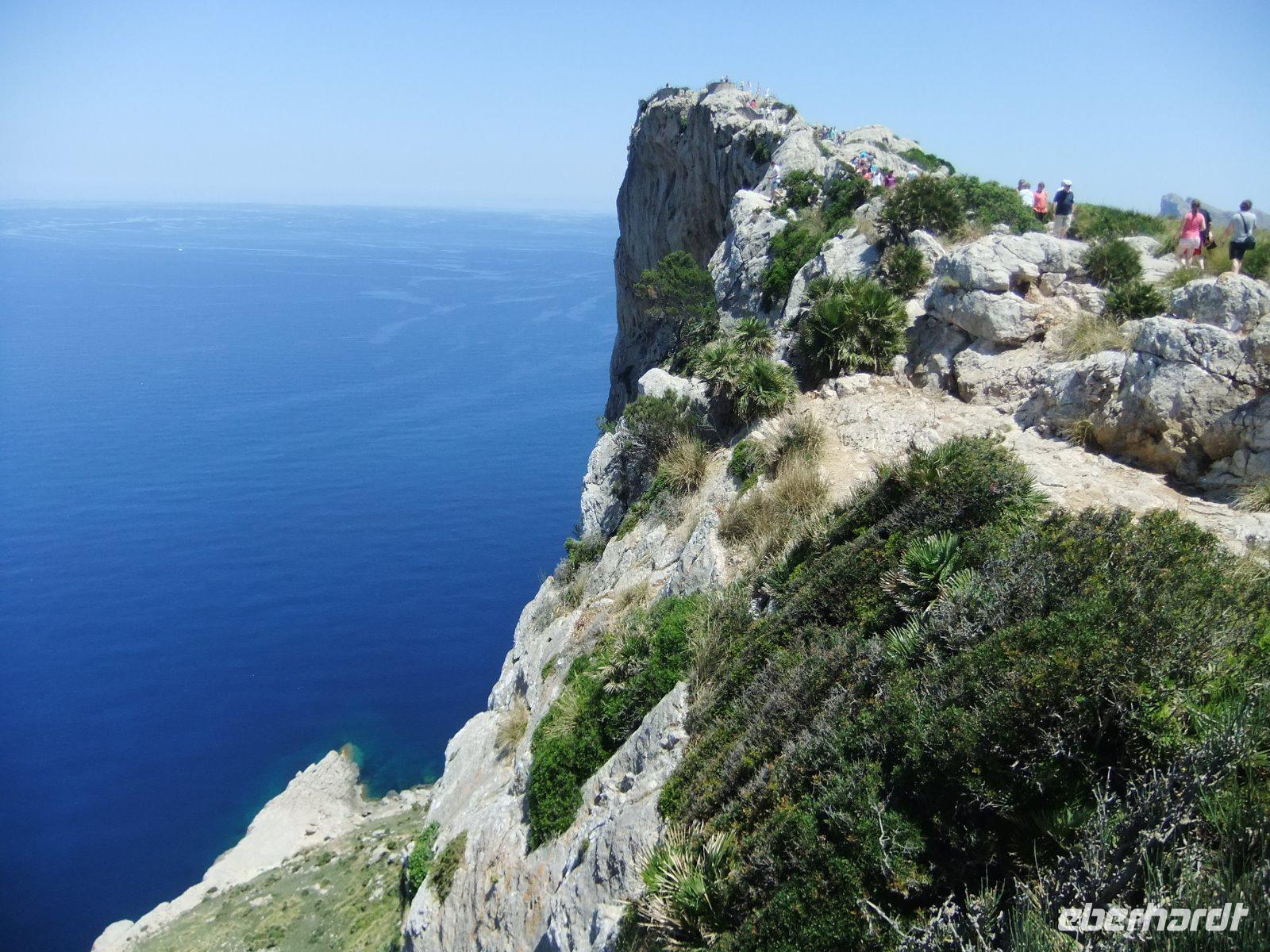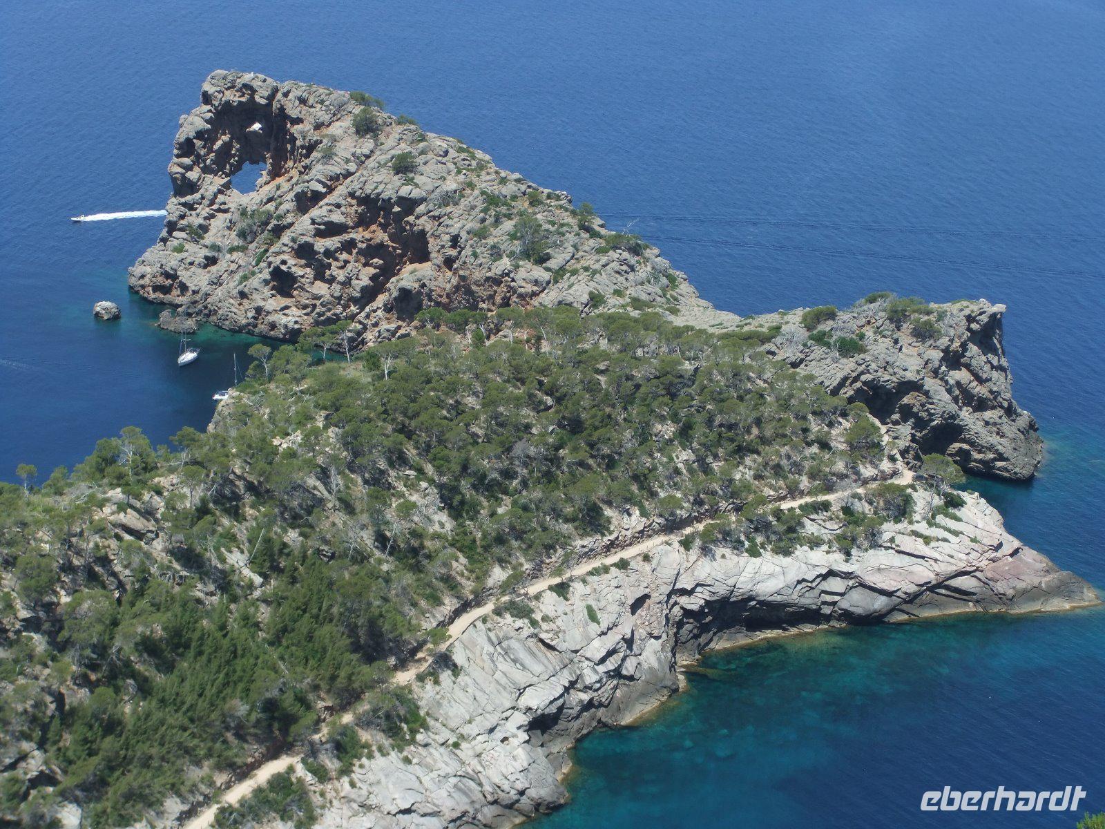 Nun „klettert" der Bus auf den Grat der Landzunge, wir sehen das Meer rechts und links von uns. Bald erreichen wir einen der schönsten Aussichtspunkte der Insel, wo man in mehr als 200 m Höhe über dem Meer u.a. auf die Insel Colomer schauen kann. In der entgegengesetzten Richtung reicht der Blick bis zur Bucht von Pollenca.