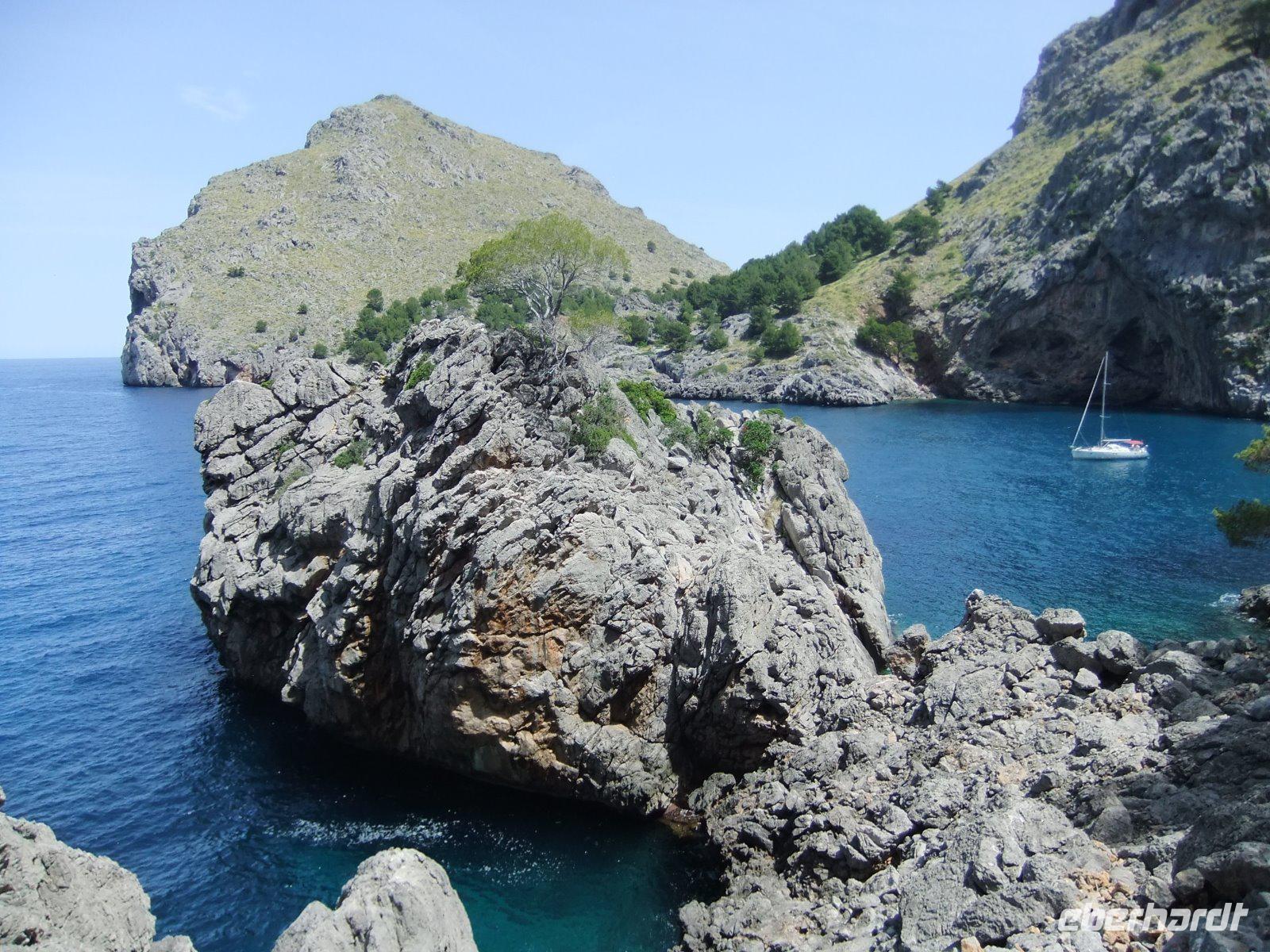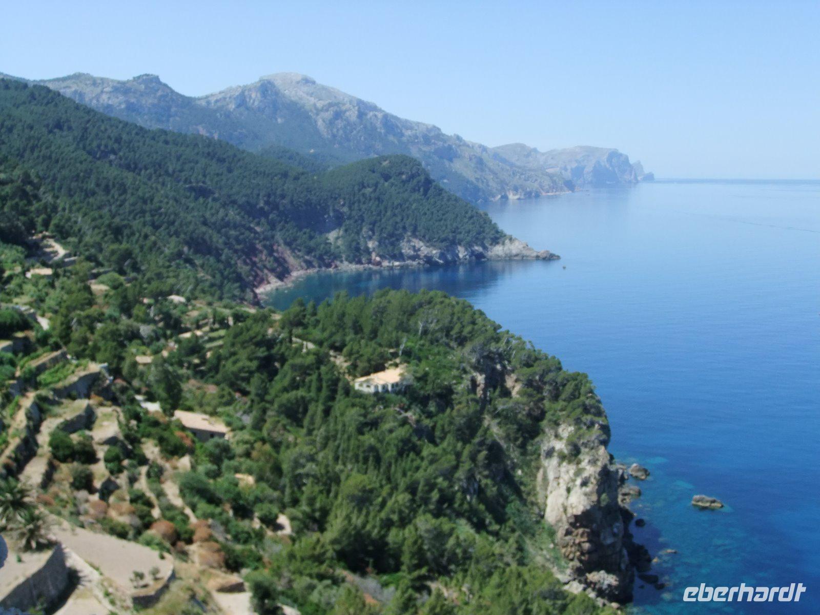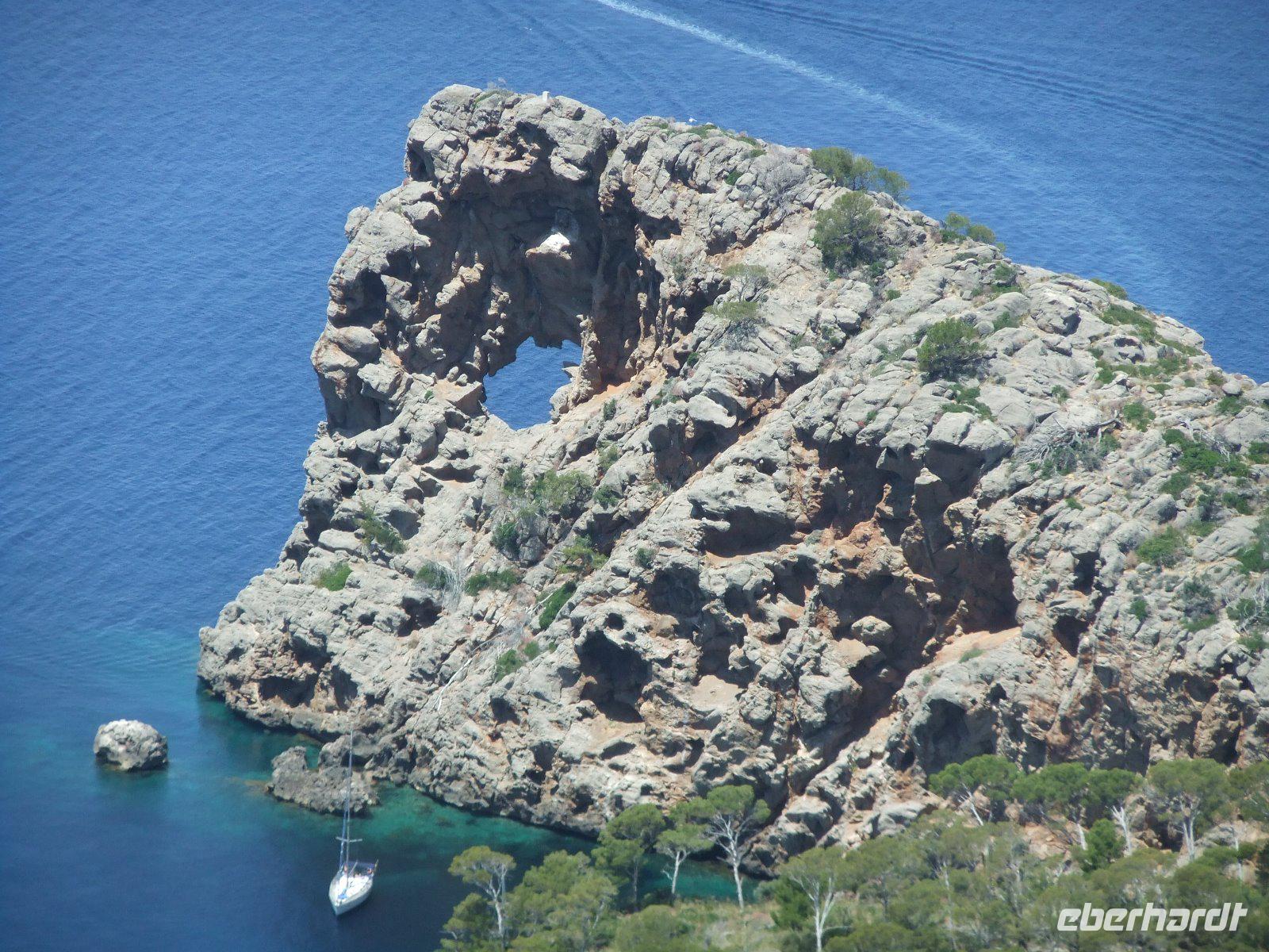 Nun „klettert" der Bus auf den Grat der Landzunge, wir sehen das Meer rechts und links von uns. Bald erreichen wir einen der schönsten Aussichtspunkte der Insel, wo man in mehr als 200 m Höhe über dem Meer u.a. auf die Insel Colomer schauen kann. In der entgegengesetzten Richtung reicht der Blick bis zur Bucht von Pollenca.