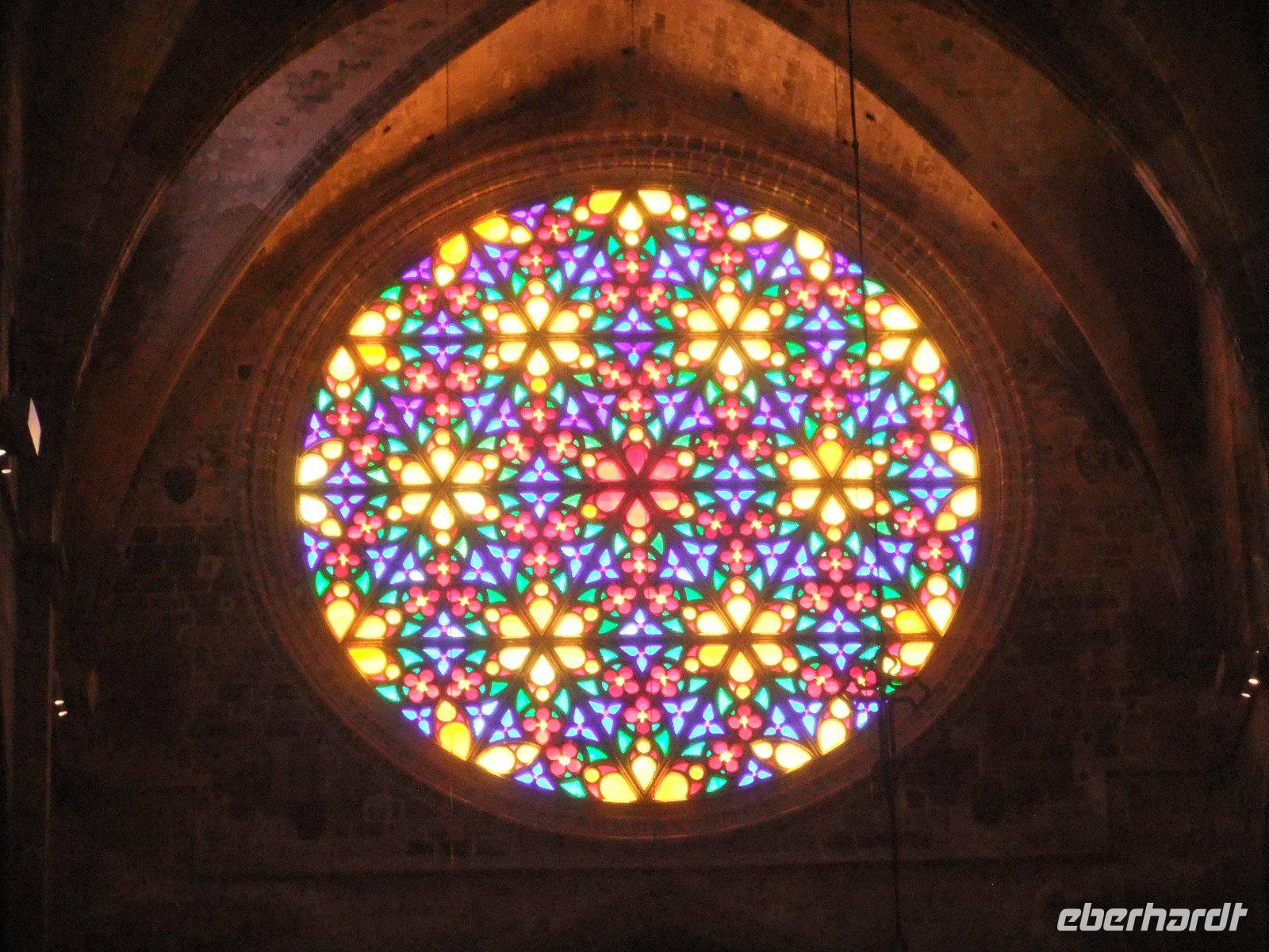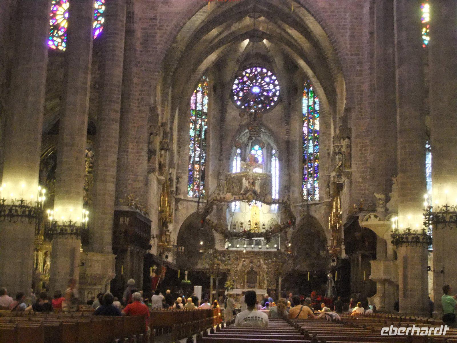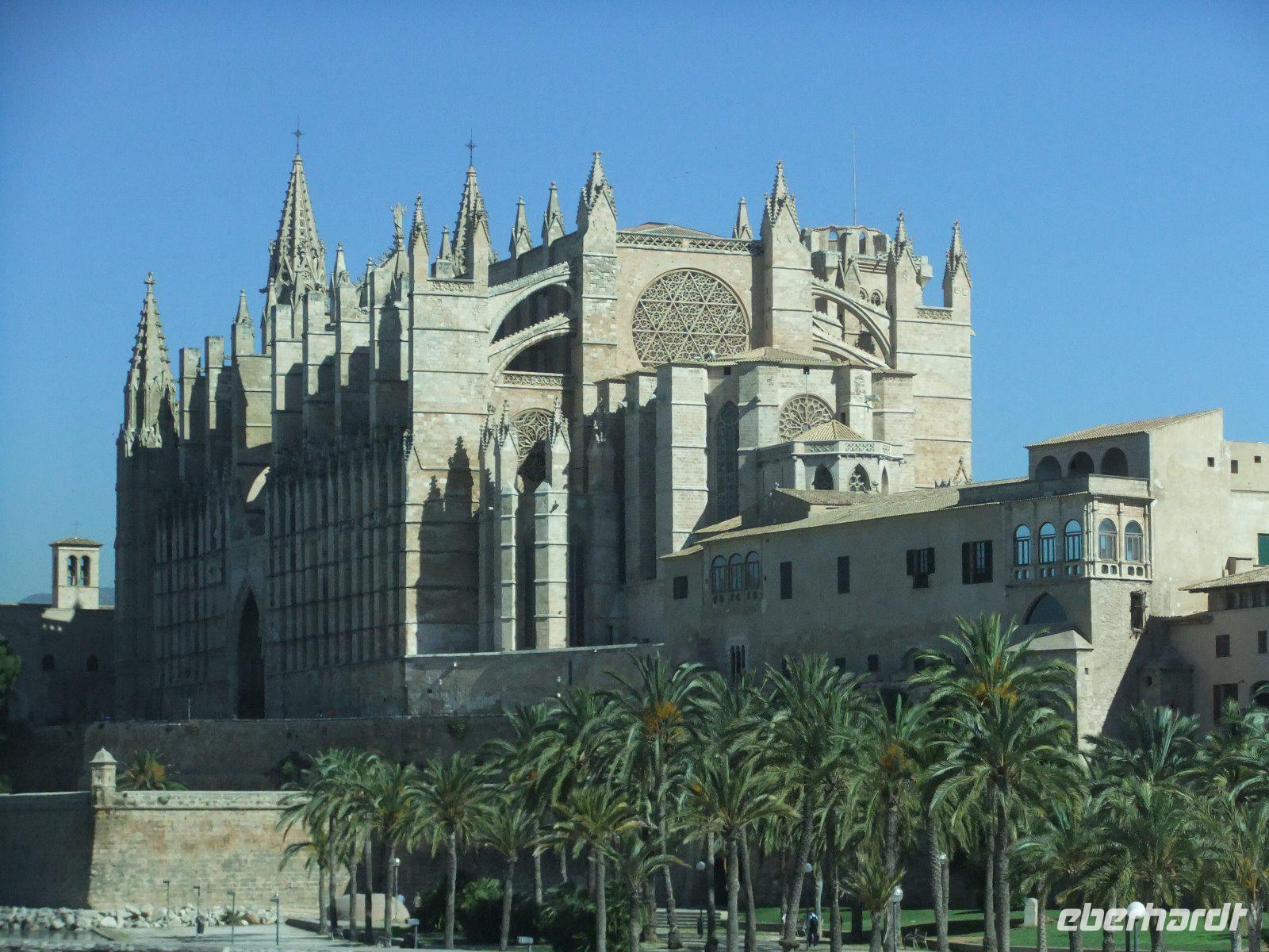 In der Nähe des Hafens, wo Kreuzfahrtschiffe, Fischerboote und unzählige Jachten liegen, steigen wir bereits wieder aus. Zu Fuß geht es zum Königspalast. Er ist zum Teil Sitz des Militärs, dient aber auch dem spanischen König zu Präsentationszwecken, wenn er auf der Insel weilt. Gleich gegenüber befindet sich die Kathedrale La Seu mit reich verziertem Eingangsportal. Sie gilt als der bedeutendste Sakralbau der Balearen und wird bezeichnet als „Kathedrale des Lichtes und des Raumes". Immerhin ist sie 44 m hoch, 121 m lang und 39 m breit und hat 61 Kirchenfenster. Vor allem die Fensterrose über dem Triumphbogen sorgt für ein beeindruckendes Farbenspiel im Innenraum und ist zudem das größte gotische Kirchenfenster der Welt.