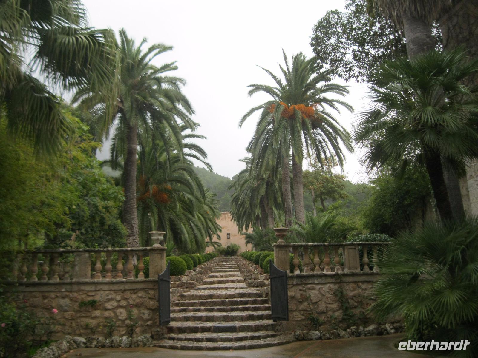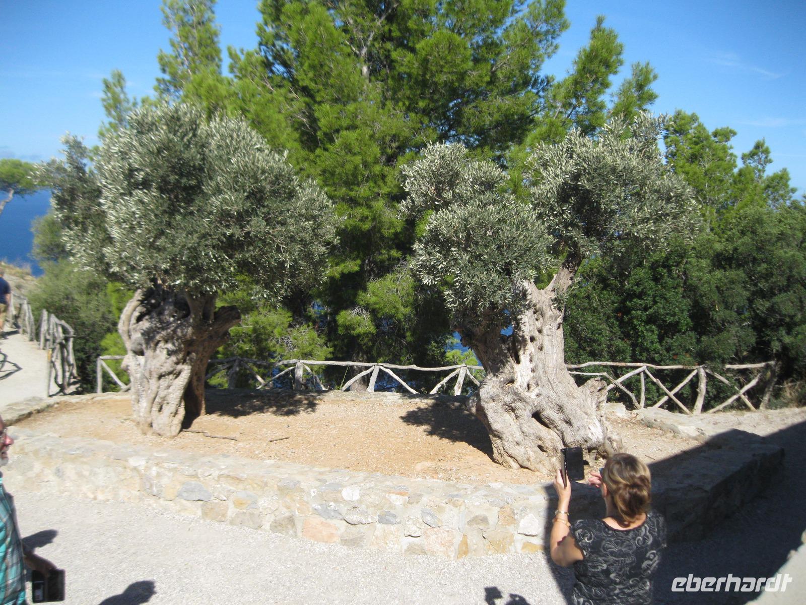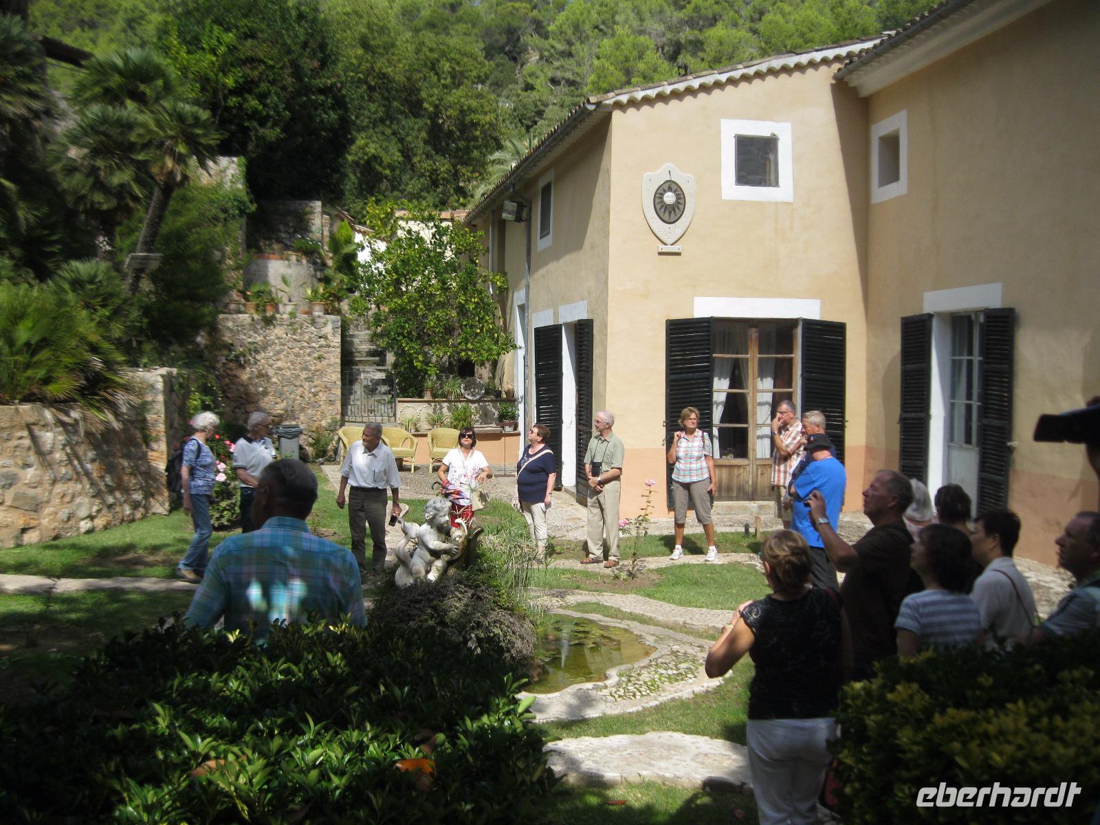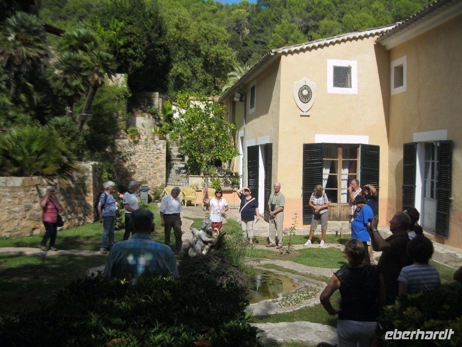 Vom Königspalast zum Kloster entwickelte sich die Kartause von Valldemossa. Bekanntheitsgrad erlangte die Gegend durch einen Erholungsaufenthalt von Chopin und seiner Geliebten George Sand. Viele literarische (ein Winter auf Mallorca) und musikalische (Regentropfen Präludium) Werke entstanden hier in dieser Zeit. Am Ende der Führung lauschten wir einem Klavierkonzert. Wir kehrten zum typischen Mandelkuchenessen in ein kleines Cafe ein. Im angrenzenden Geschäft konnte man abermals Liköre verkosten. Unsere Tour ging 18 km über schmale Serpentinen zum Meer hinunter. Auf der Strecke legten wir einen Fotostopp in San Maroc ein. Es war der Landsitz von Erzherzog Salvator von Österreich. Er war ein Förderer der Insel und fühlte sich auch der weiblichen Bevölkerung sehr zugetan. Heute gehört das Anwesen Michael Douglas und eine Stiftung ist darin untergebracht. Am „Gelöcherten" wurden Fotos geschossen. Wer fängt das Schiff darin ein? Weiter ging es durch das Künstlerdorf Deja der Küste entgegen. In Port Soller gingen wir ein Stückchen zu Fuß zum Zentrum und genossen unsere Mittagspause. Leider hielt der Wettergott sein Versprechen vom Sonnenschein nicht und schickte uns Regenschauer. Am Nachmittag schlenderten wir, vom Nieselregen begleitet, durch die arabischen Gärten von Alfabia. Wir schauten uns auch im prachtvollen Herrenhaus um, in dem schon gekrönte Häupter genächtigt haben. Zum Anwesen gehört eine alte Ölpresse, die leider nicht mehr in Betrieb ist. Auf der Fahrt dorthin sahen wir die alten Olivenbäume. Die Ernte hatte gerade begonnen.
