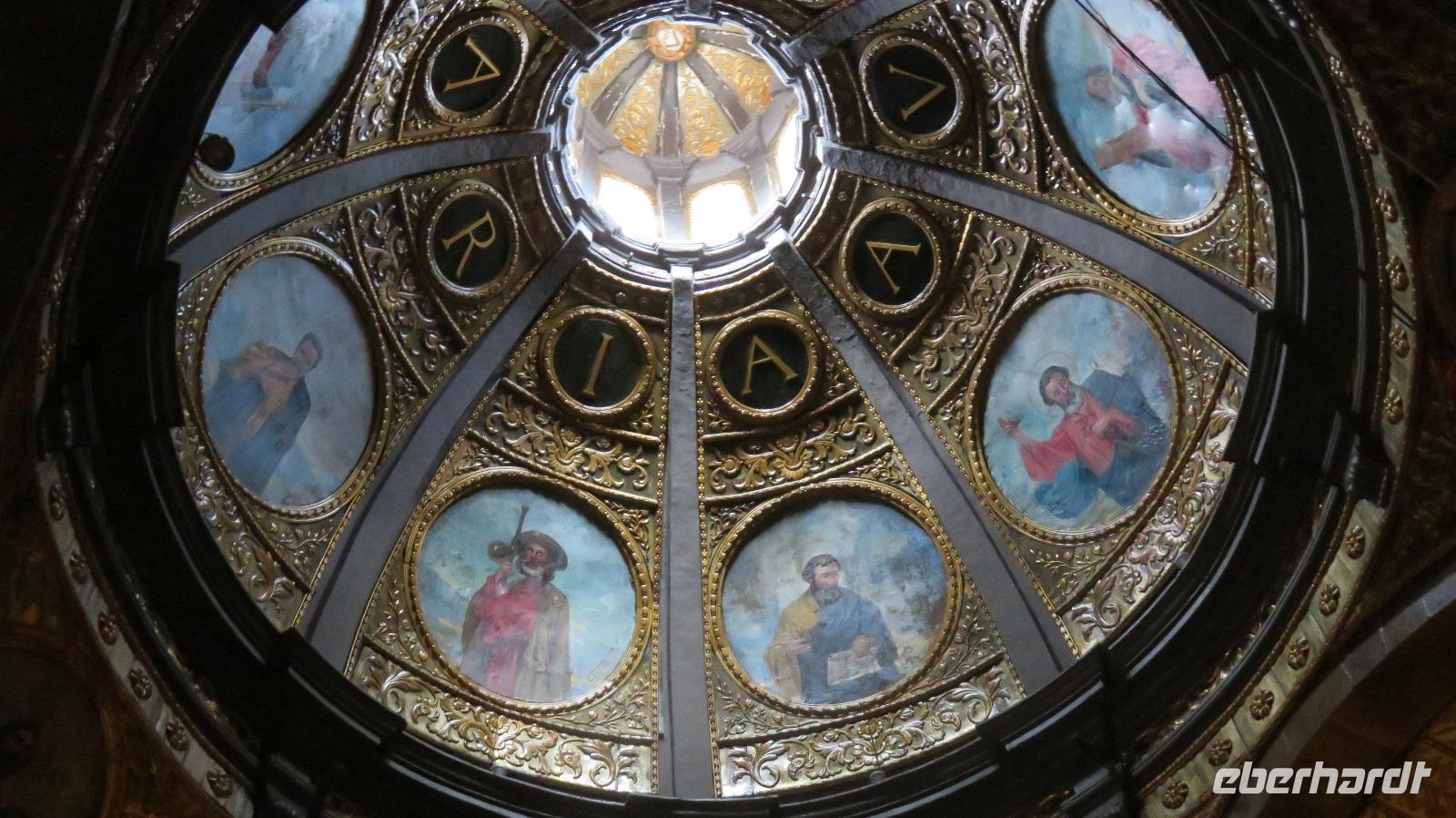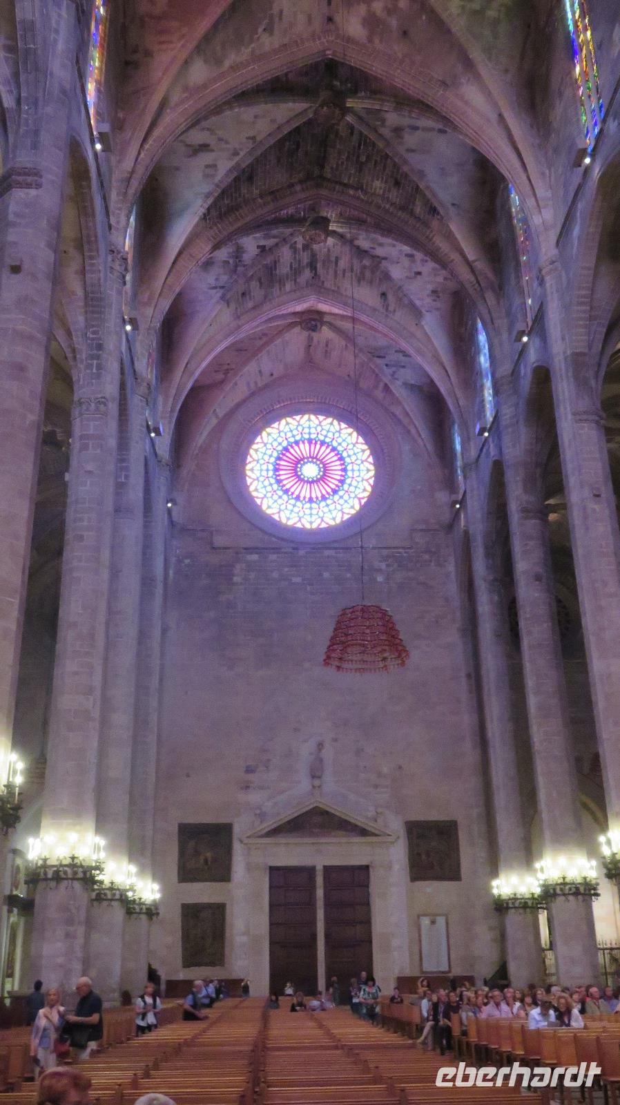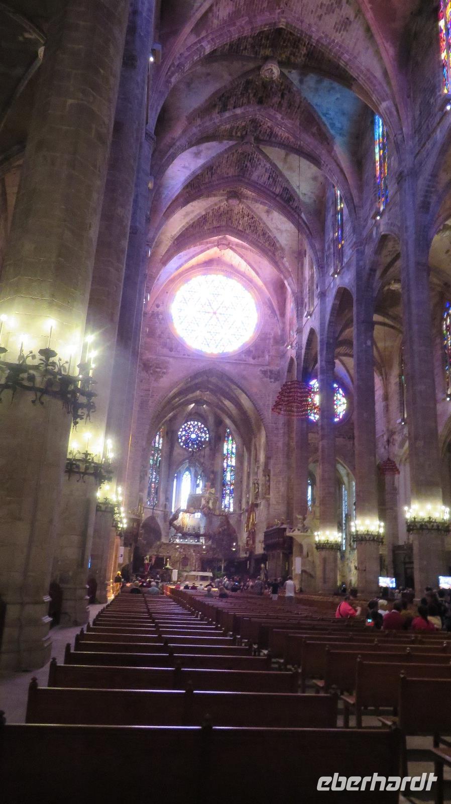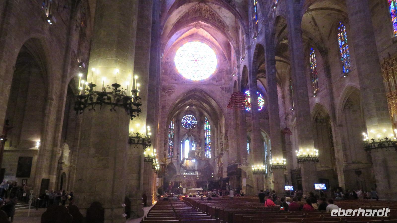 Dann ging es wieder zum Hafen. Dort besichtigten wir die imposante gotische Kathedrale. Eins der bedeutendsten Bauwerke der Balearen. Das 19 m breite und 44 m lange Kirchenschiff ist eines der größten weltweit. Die wunderschönen Rosetten (12 m im Durchmesser) aus Buntglasstücken lassen das Licht herein. Vor allen auch der Baldachin über dem Altar ist einzigartig.