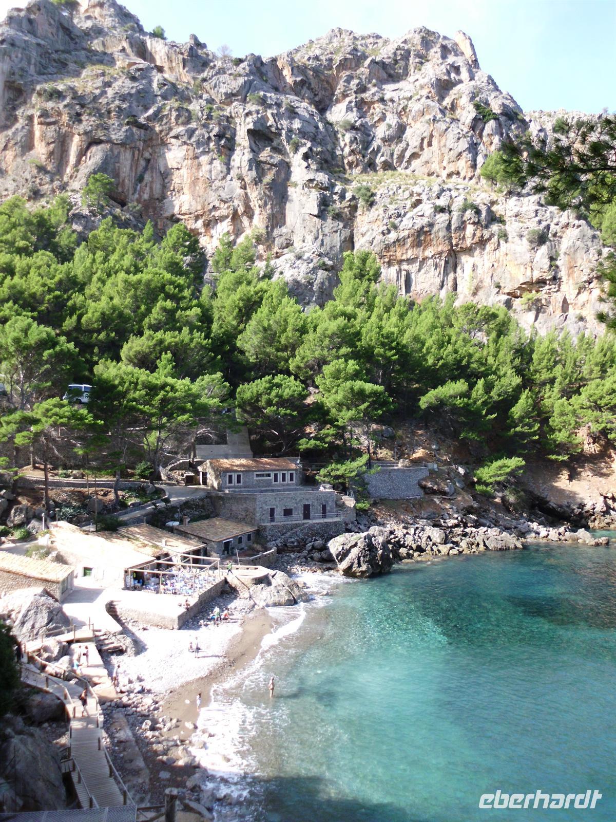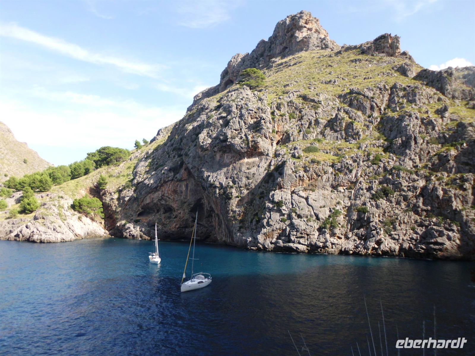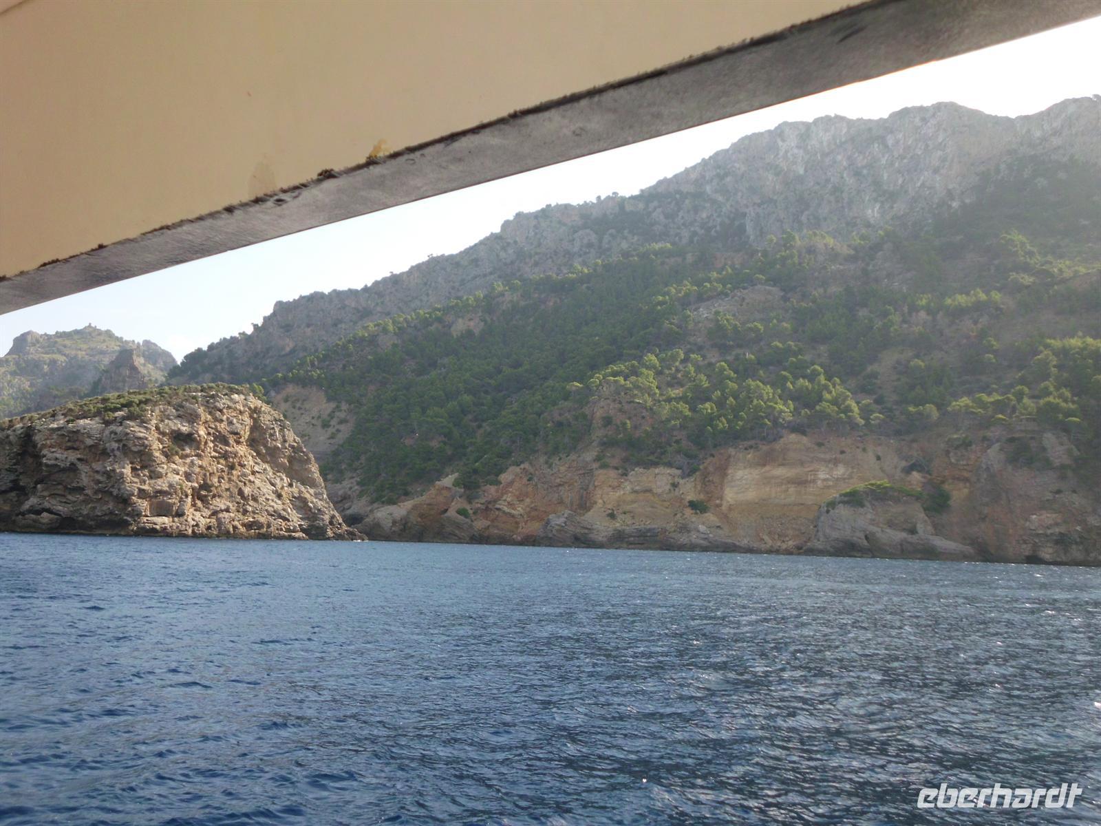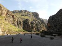 Angekommen in Sóller stiegen wir um in eine der traditionellen Straßenbahnen, die uns direkt in den Hafen von Port de Sóller brachte. Das Ausflugsboot Nr. 7 erwartete uns und andere Gruppen zu einer einstündigen Fahrt entlang der Küste. Das sonnige Wetter und ein laues Lüftchen erlaubten es uns die Fahrt vollkommen zu genießen ohne gegen die Seekrankheit ankämpfen zu müssen. Kurz nach Mittag erreichten wir unser Ziel und legten an in der Bucht von Sa Calobra, wo wir die nächsten zwei Stunden individuelle Freizeit hatten. Die Berge zu der einen und das offene Meer zu der anderen Seite stärkten wir uns bei einem Mittagessen, bevor wir uns eines der spektakulärsten Naturwunder Mallorcas ansahen - den Torrent de Pareis. Dieses Naturschutzgebiet verzauberte uns mit einer Schlucht mit bis zu 200 Meter hohen Wänden, üppiger Vegetation und einem kleinen Kiesstrand. Einige gingen tiefer hinein in die Schlucht, während andere sich ins kühle Nass stürzten und die Atmosphäre genossen.