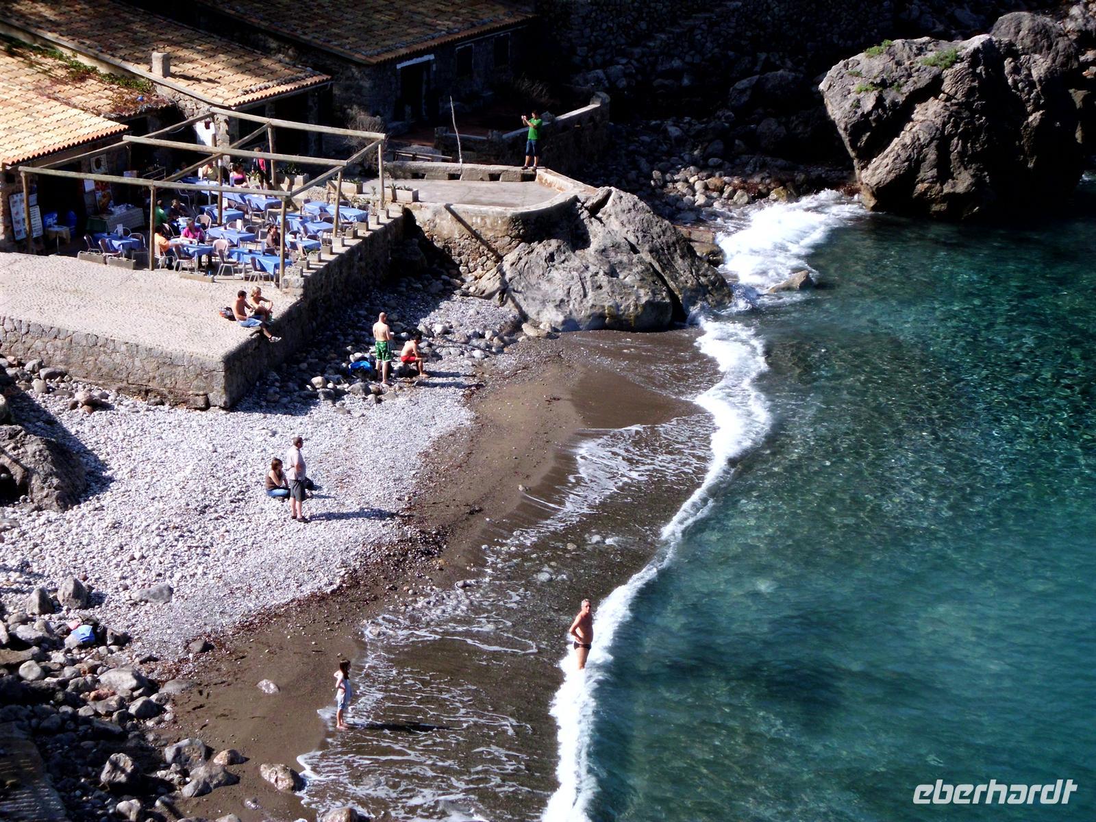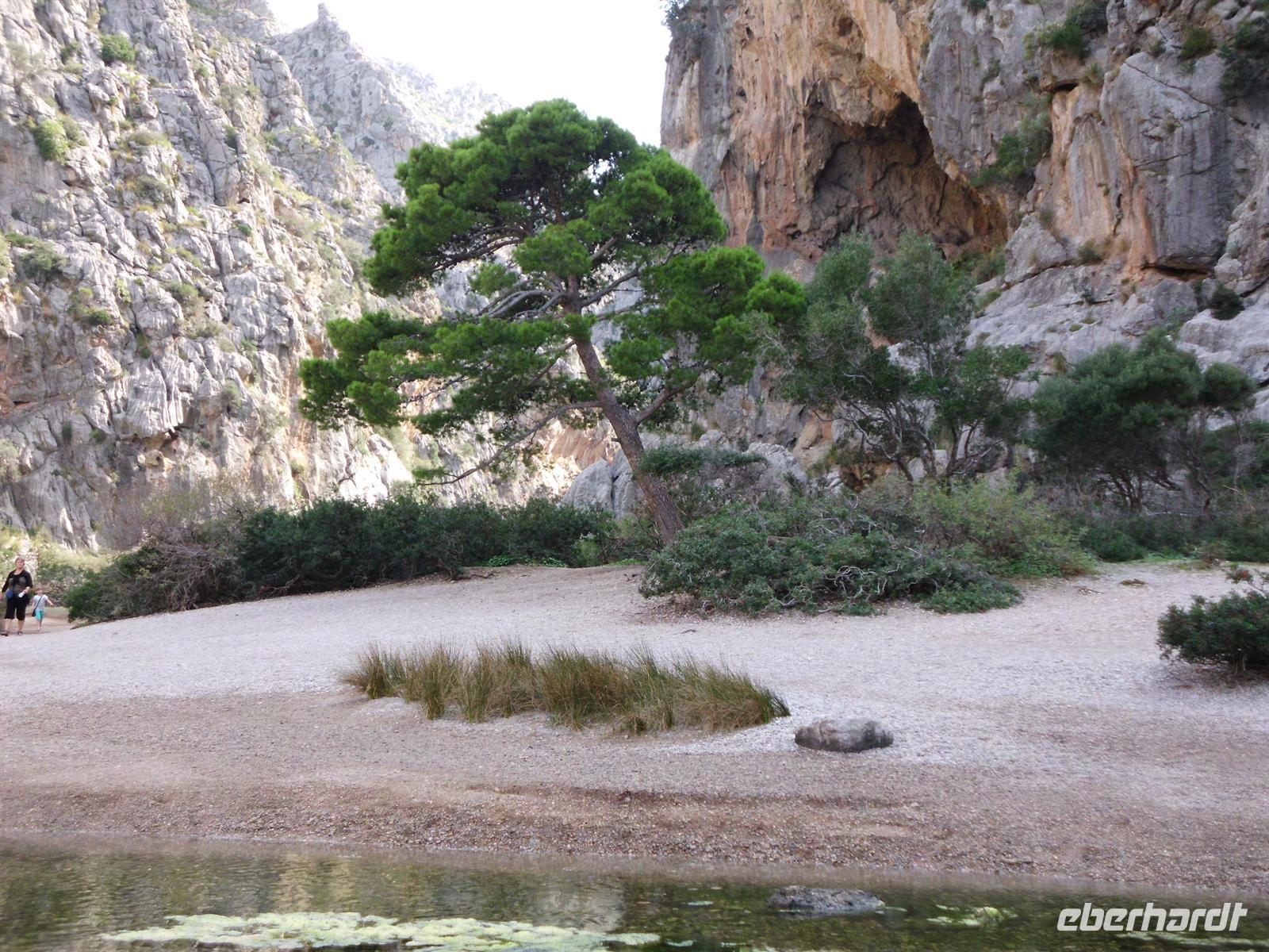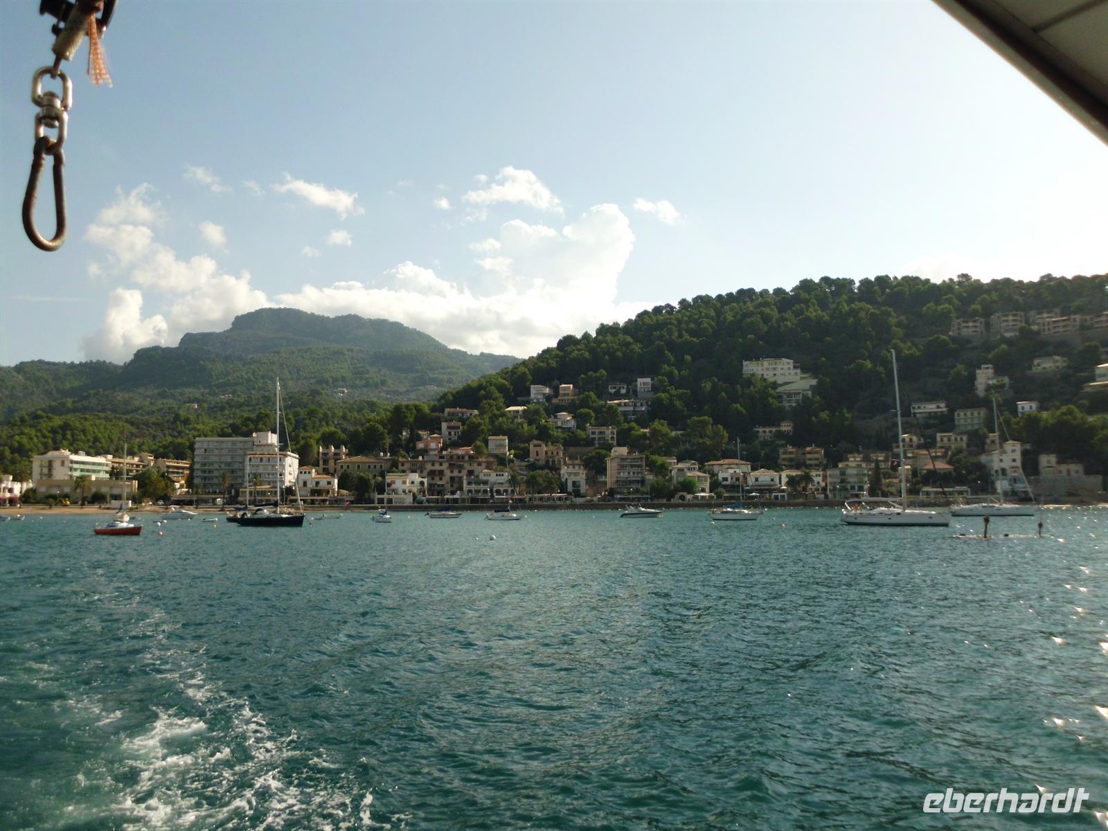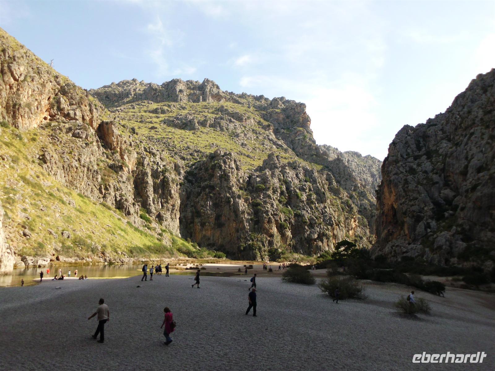 Angekommen in Sóller stiegen wir um in eine der traditionellen Straßenbahnen, die uns direkt in den Hafen von Port de Sóller brachte. Das Ausflugsboot Nr. 7 erwartete uns und andere Gruppen zu einer einstündigen Fahrt entlang der Küste. Das sonnige Wetter und ein laues Lüftchen erlaubten es uns die Fahrt vollkommen zu genießen ohne gegen die Seekrankheit ankämpfen zu müssen. Kurz nach Mittag erreichten wir unser Ziel und legten an in der Bucht von Sa Calobra, wo wir die nächsten zwei Stunden individuelle Freizeit hatten. Die Berge zu der einen und das offene Meer zu der anderen Seite stärkten wir uns bei einem Mittagessen, bevor wir uns eines der spektakulärsten Naturwunder Mallorcas ansahen - den Torrent de Pareis. Dieses Naturschutzgebiet verzauberte uns mit einer Schlucht mit bis zu 200 Meter hohen Wänden, üppiger Vegetation und einem kleinen Kiesstrand. Einige gingen tiefer hinein in die Schlucht, während andere sich ins kühle Nass stürzten und die Atmosphäre genossen.