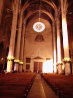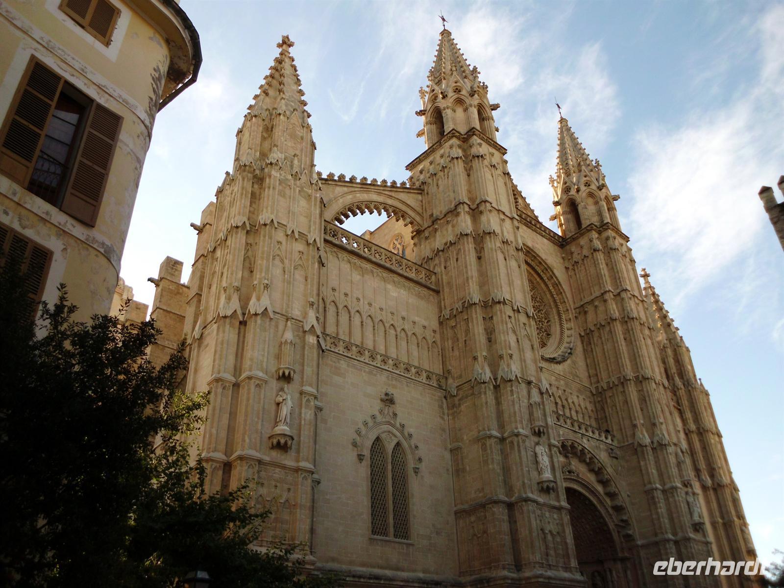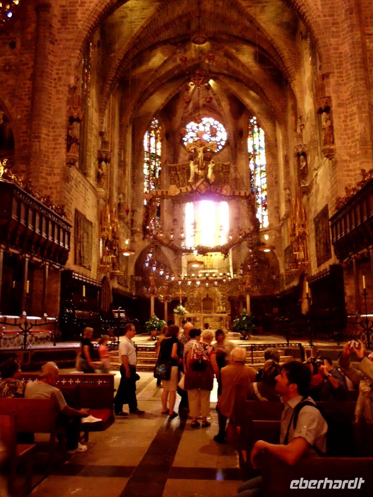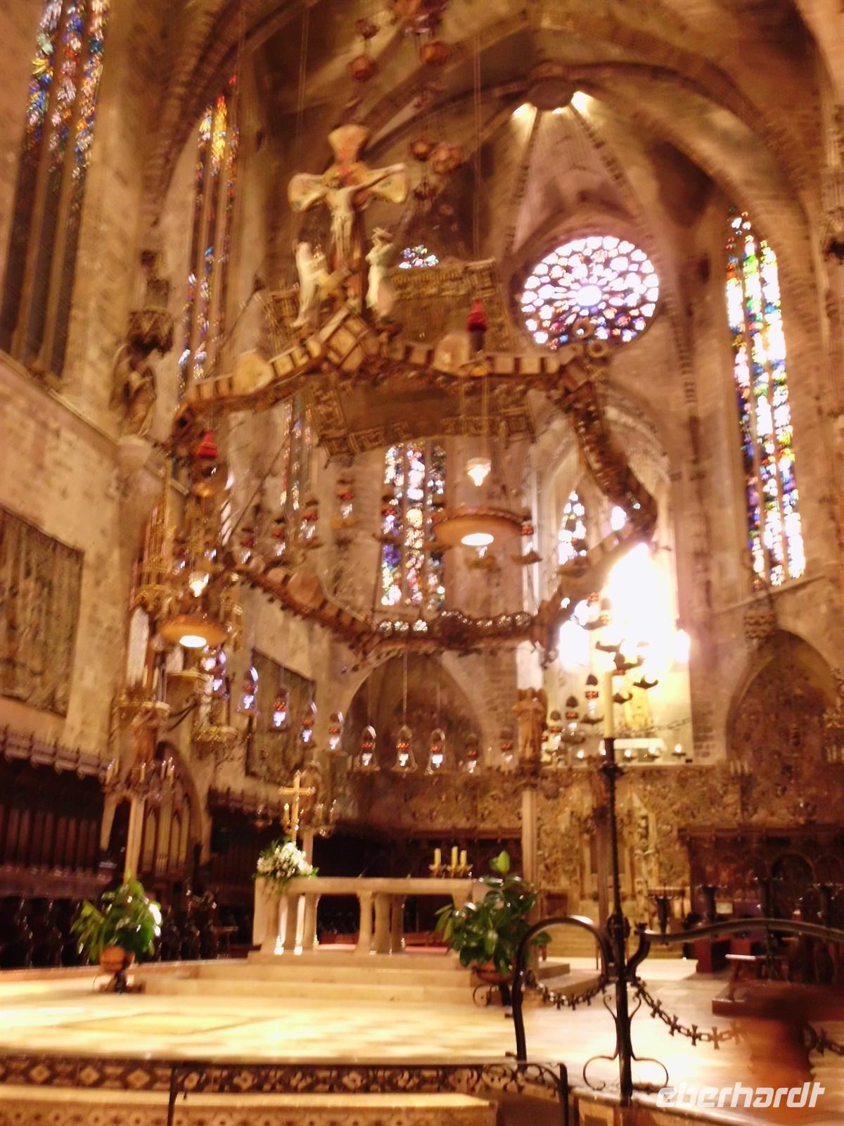 Mit dem öffentlichen Linienbus fuhren wir heute nach Palma, die Hauptstadt Mallorcas. Schon von weitem konnte man die imposante gotische Kathedrale erkennen. Wir stiegen am Placa de la Reina aus und Magdalena machte uns zunächst mit einem anderen Bauwerk bekannt - der Almudaina. Sie ist der offizielle Wohnsitz des spanischen Königs und befindet sich genau gegenüber der Kathedrale. Diese betraten wir pünktlich zur Öffnungszeit um 10.00 Uhr und waren somit eine der ersten Gruppen überhaupt. Über den Baulärm im Inneren half das Lichtspiel der Giebelrosette des Architekten Gaudí hinweg, welches sich in den verschiedensten Farben spiegelte. Magdalena führte uns durch das majestätische Bauwerk mit interessanten Details und ließ uns Zeit für eigene Entdeckungen.