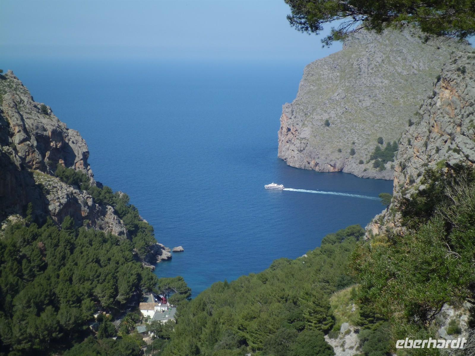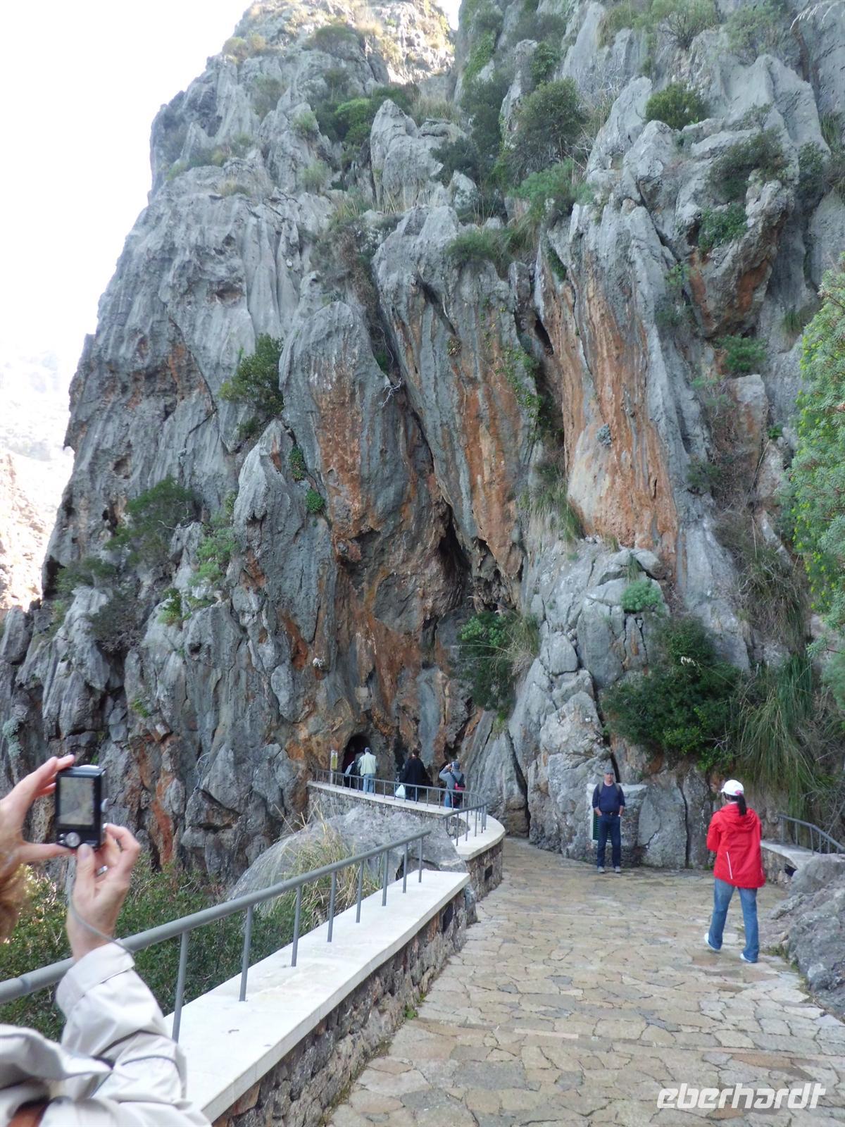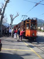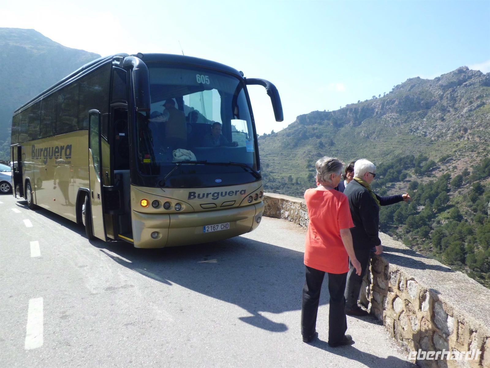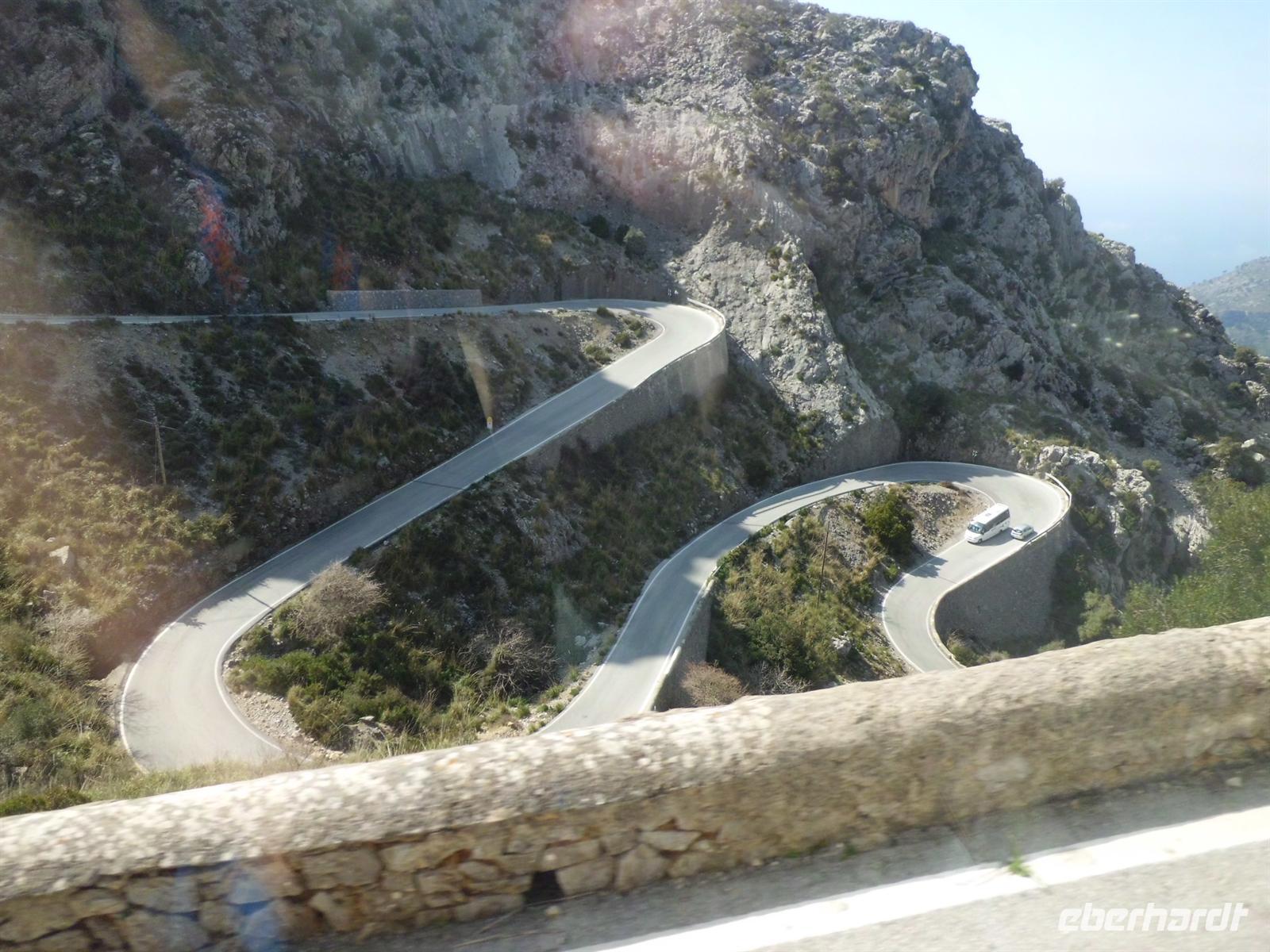 Unser letzter Ausflug zusammen mit Madgalena und Toni steht bevor. Selbstverständlich scheint wieder die Sonne! Heute werden wir 4 verschiedene Verkehrsmittel nutzen, um mit der „Große Inselrundfahrt“ das imposante Tramuntanagebirge komplett zu erleben. Da die Strasse von Inca nach Lluc auf Grund eines Oldtimerrennens am Vormittag gesperrt ist, beginnen wir unsere Inselrunde in Palma. Bei einer kleinen Stadtrundfahrt zeigt uns Madgalena nochmals die Rambla von Palma. Wir erreichen kurz nach halb zehn den Bahnhof des „Roten Blitzes“ in Son Reus. Unser Zug steht auch schon zum Einsteigen bereit und schon kann die Fahrt vorbei an blühenden Mandelbäumen, Zitronen- und Orangenplantagen und Olivenhainen beginnen. Durch 13 Tunnel schlängelt sich der Rote Blitz durch das Gebirge nach Soller. Hier angekommen steigen wir auch sofort in die bereitstehende Strassenbahn um. Diese ist nicht ganz so bequem wie eben der Zug, aber nicht weniger spektakulär. Quietschend und ratternd geht die Fahrt von Soller nach Port de Soller. Auch hier steigen wir fast nahtlos auf den Katamaran um, der uns entlang der steilen Nordküste nach Sa Calobra bringt. Das Meer ist ruhig („Stilles Wasser“ J) und allen bekommt die Seefahrt gut. In der Bucht von Sa Calobra verbringen wir unsere Mittagspause. Wir spazieren durch einen 50m langen und dunklen Fußgängertunnel zur benachbarten Torrent de Pareis, die durch Auswassung entstandene Schlucht und sein Durchbruch zum Meer. Pünktlich zur verabredeten Zeit steht auch Toni mit unserem Bus bereit, um uns wohl spektakulärste Serpentinenstrasse hinauf zu bringen. 15 Kilometer mit vielen Haarnadel-Serpentinen inklusive der „Krawattenknoten“-Straßenführung über fast 900m Höhenunterschied verlangen vollstes fahrerischen Können. Toni meistert es mit Bravour, zumal sehr viele Radsportler diese Straße als Trainingslager nutzen. Am Nachmittag besuchen wir die Klosteranlange Lluc mit der schwarzen Madonna. Einige nutzen die Nachmittagssonne für einen Kaffee, andere steigen den Kalvarienberg hinauf. Am späten Nachmittag müssen wir uns dann leider von unserer Reiseleiterin Magdalena und unserem Chaffeur Toni verabschieden. Sie haben uns in der Woche viele schöne und neue Seiten Mallorcas gezeigt!