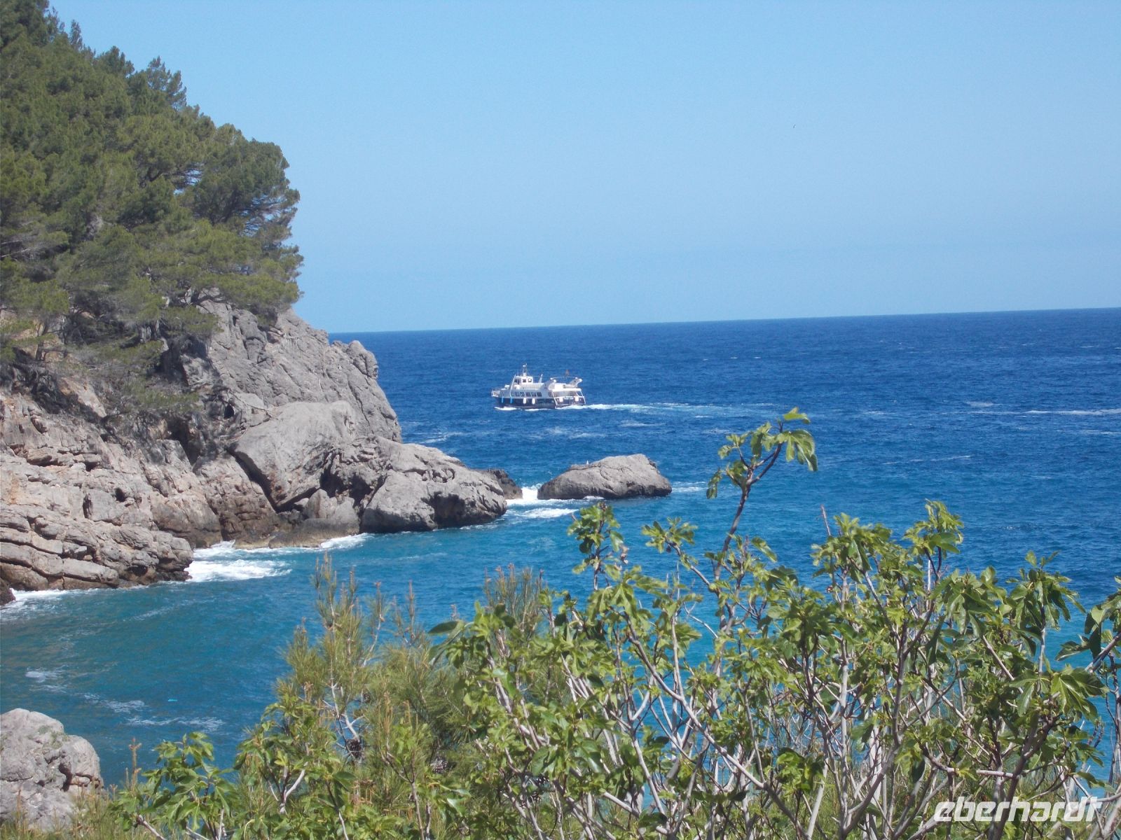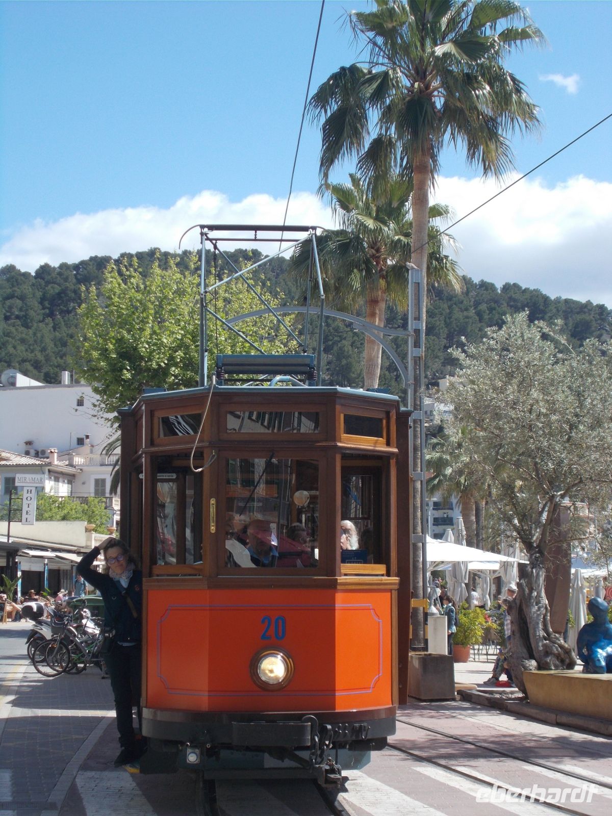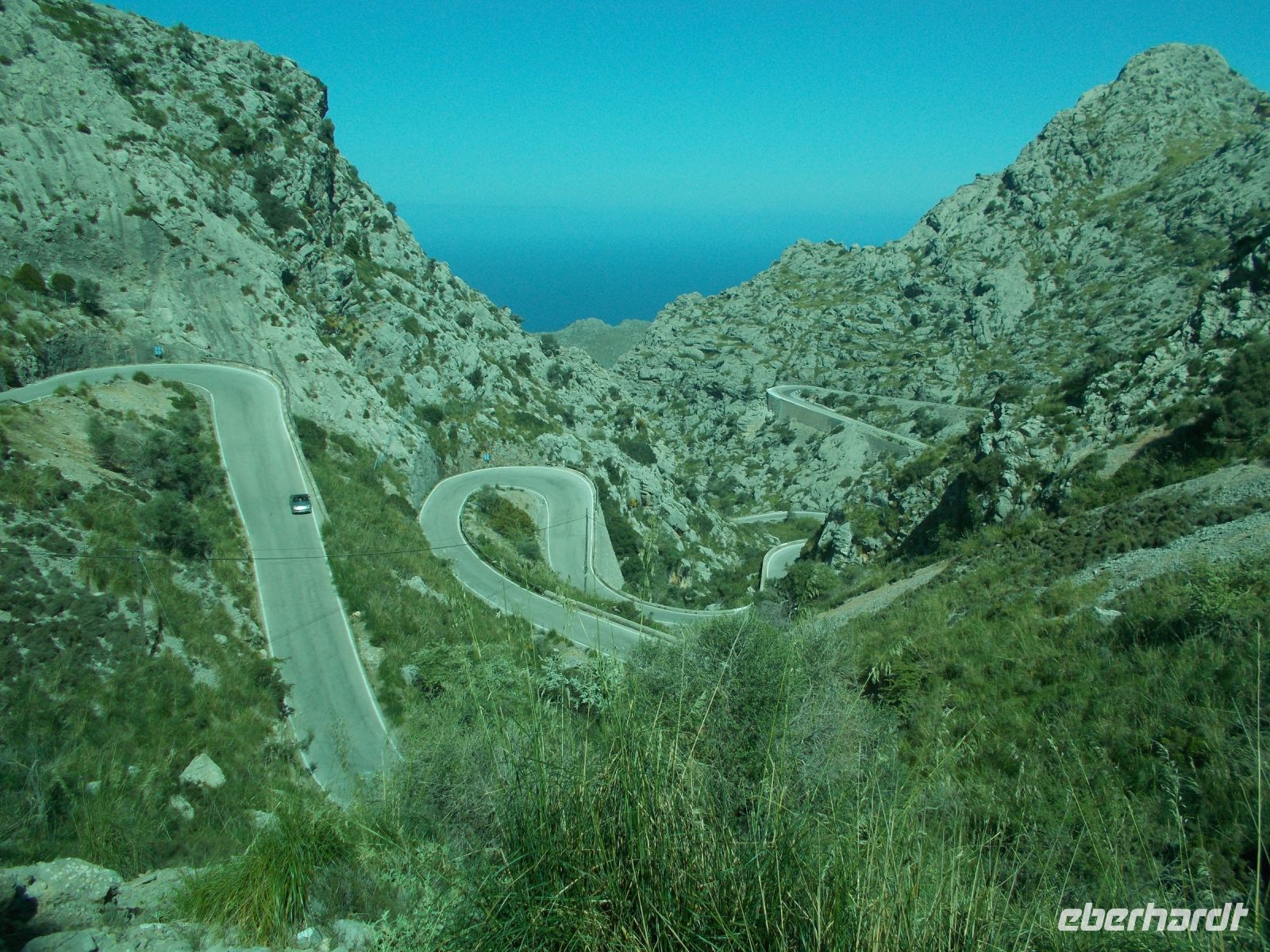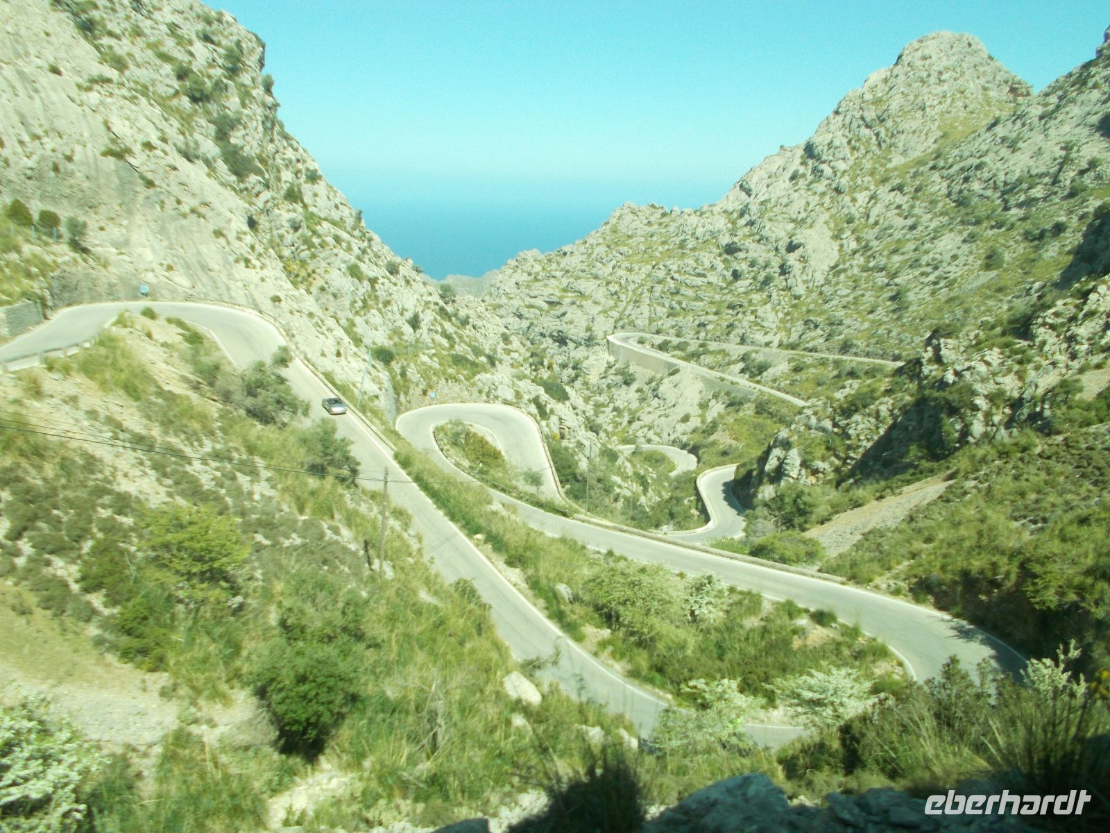 Und schon wieder Serpentinen . Diesmal zum Kloster Lluc, dem bedeutensten Wallfahrtsort der Insel.Aber noch nicht genug . Der richtige Nervenkitzel sollte noch folgen,- auf der Straße nach Sa Colobra. Auf 12 km und 800 Höhenmeter , mit zahlreichen Haarnadelkurven gespickt ,überwindeten wir das Paradestück des genialen Straßenbaumeisters Paretti. Der Krawattenknoten - Nus de sa Corbata- ist wohl die berühmteste Kehre. Diese Strecke wird von Fahradfahrern bevorzugt und dementsprechend schwierig für die vielen Busfahrer ,die die Touristen nach Sa Colobra bringen,zu fahren. Unten angekommen, sahen wir unser Schiff , mit dem wir nach Soller fahren wollten, abdrehen. Wegen starker Brandung war kein anlegen möglich. Es hielt uns nicht davon ab, durch einen Felstunnel, zur versteckten Bucht, Torrent de Pareis, zu wandern.In der Zwischenzeit hatte die Reederei eine Variante des Zustiegs gefunden. Wir konnten in der kleinen Cala Tuent an Bord gehen.Ein wunderbares Bild eröffnete sich uns - bei der Hafeneinfahrt von Port Soller. Hier wartete auch schon der sogenannte "Rote Blitz" die Straßenbahn nach Soller. Hier hatten wir etwas Aufenthalt bevor die Fahrt, mit dem historischen Zug ,nach Palma weiter ging. Am Tag der Eröffnung der Eisenbahnlinie, soll die Titanic gesunken sein. Wir erreichten, durch 13 Tunnel und wunderbare Ausblicke, wohlbehalten Palma.