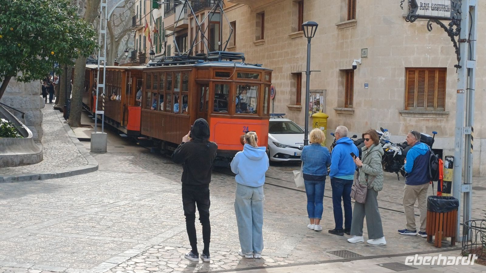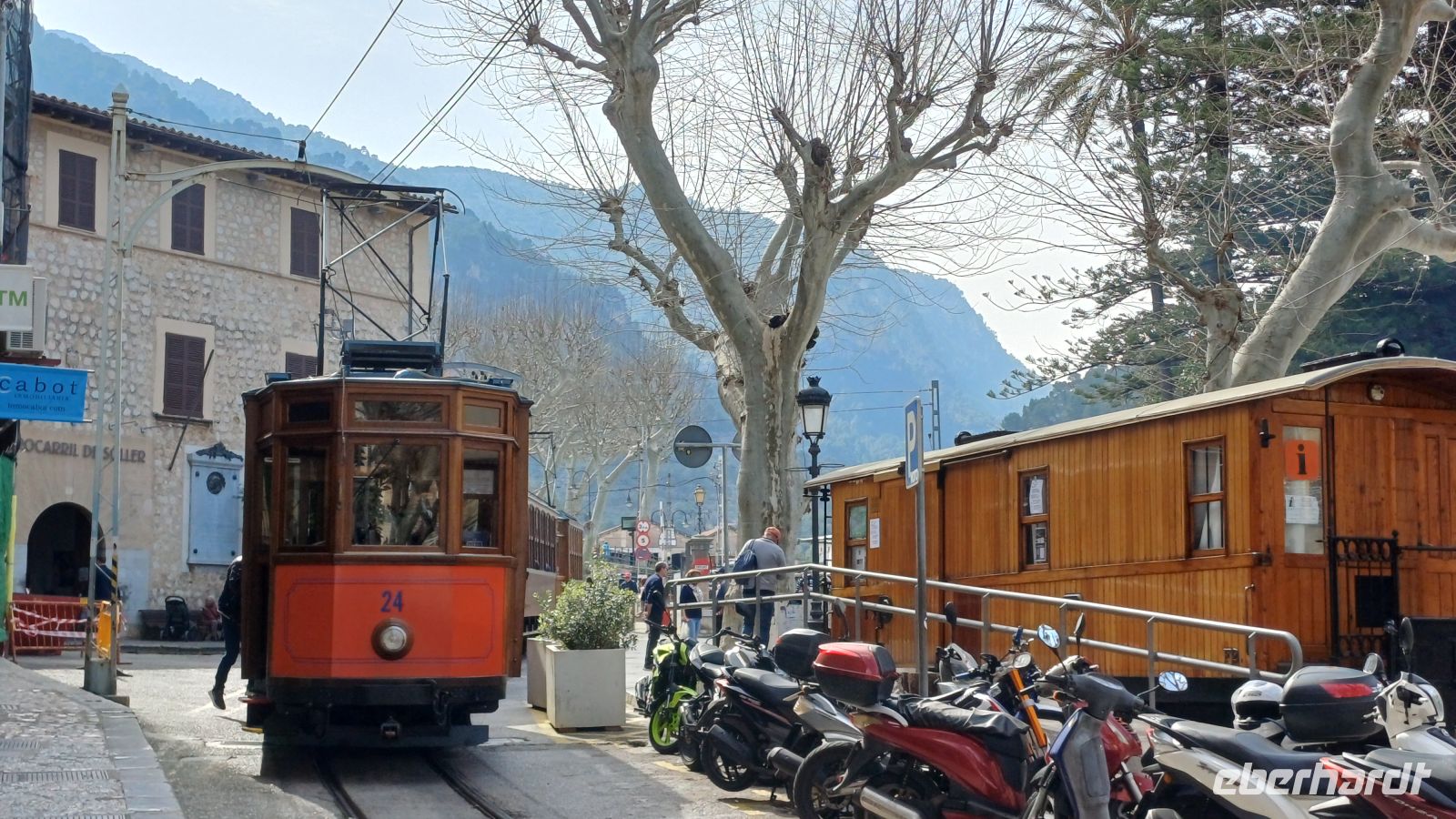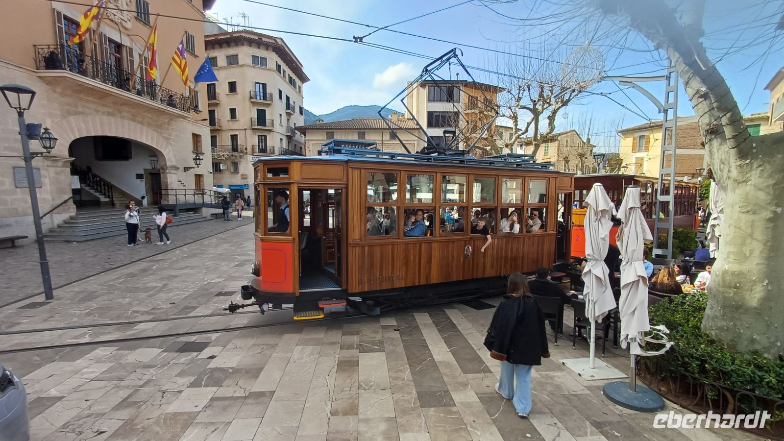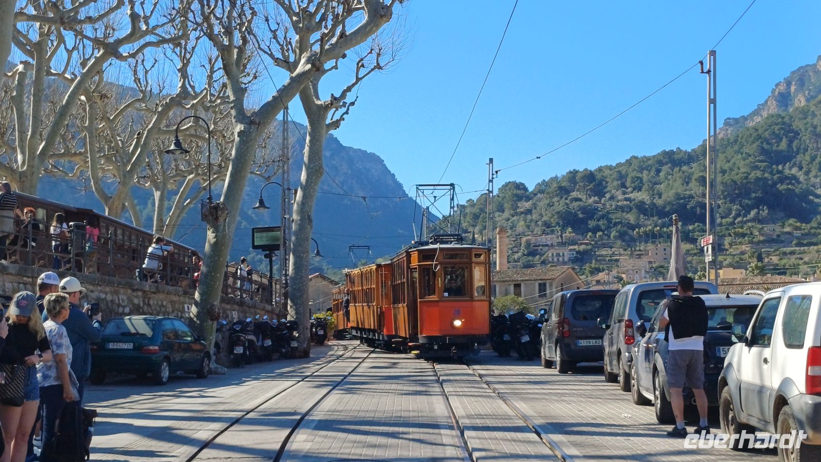 An einem kleinen Bahnhof bei Palma bestiegen wir, wenn auch mit 25 Minuten Verspätung, den Roten Blitz – eine nostalgische Eisenbahn aus dem Hause Siemens. Diese fährt uns durch eine atemberaubende Landschaft vorbei an Orangen-, Zitronen- und Olivenplantagen und Tunnel die per Hand in den Berg getrieben wurden in Richtung Soller. Unsere Entdeckungstour geht vom Bahnhof weiter mit einer Straßenbahn Baujahr 1913 ruckelnd und quitschend bis Port Soller.