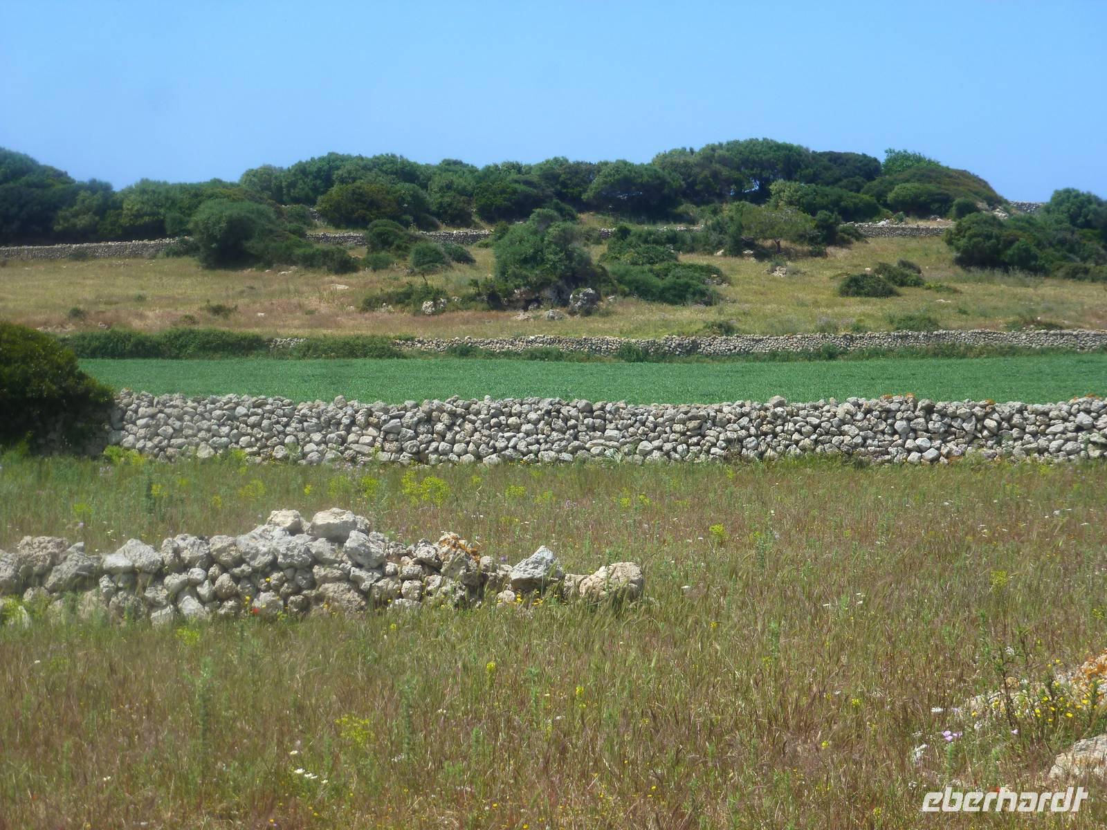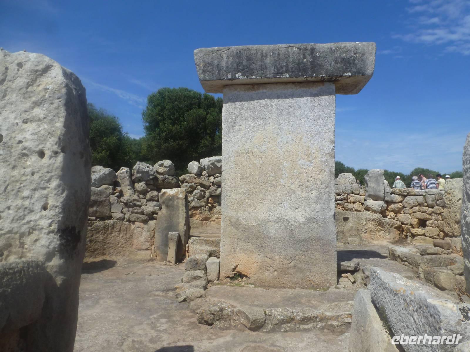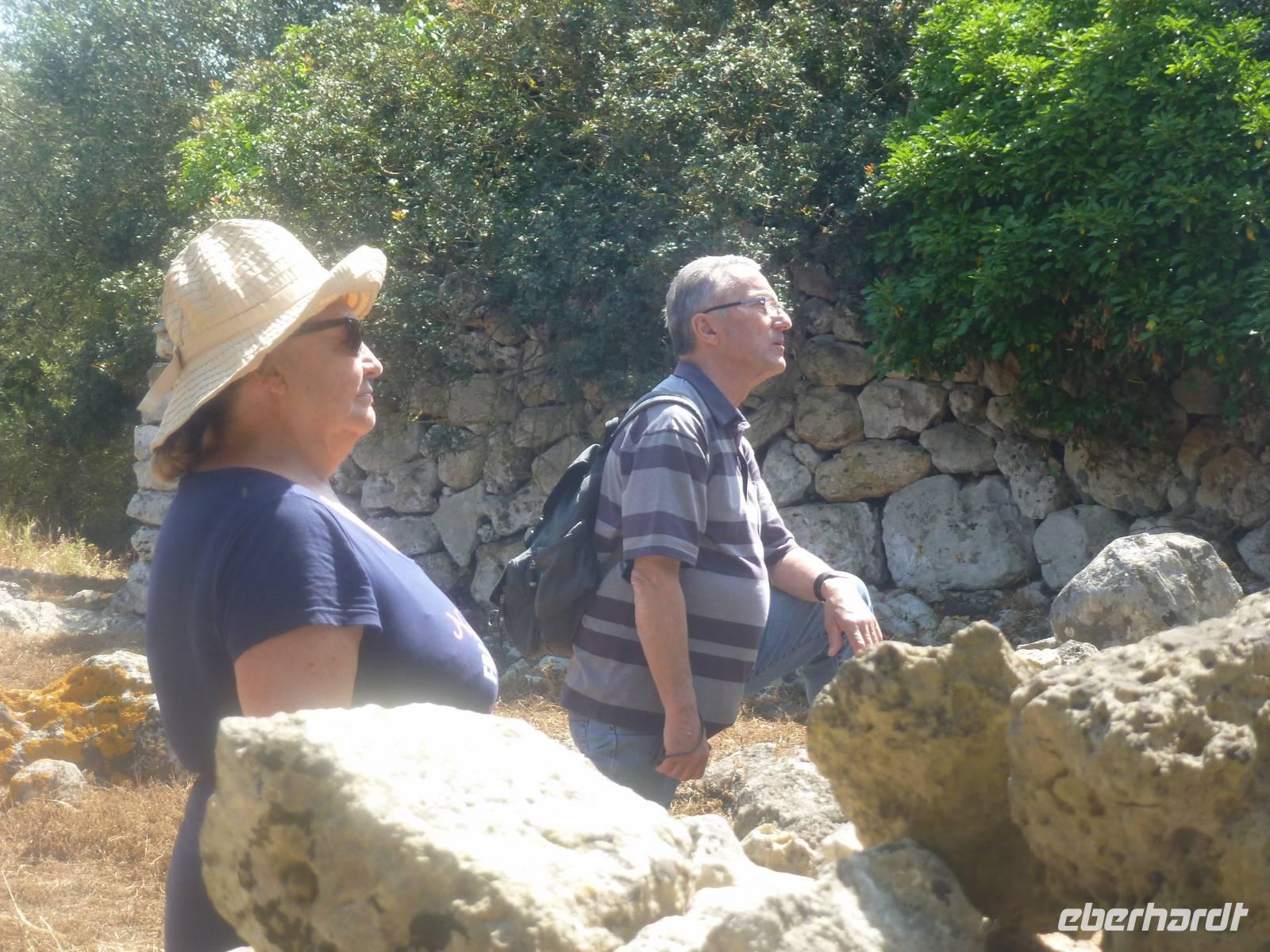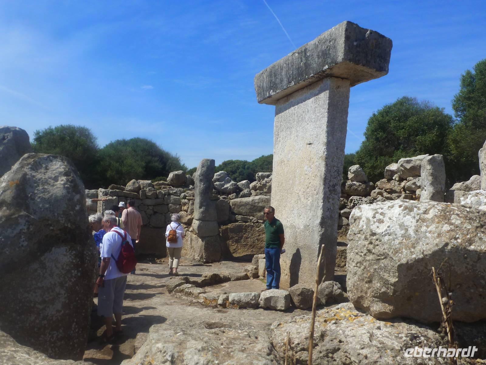 Der heutige Tag beginnt „prähistorisch", wir besuchen die Taula von Torralba d'en Salord, die bekannteste, besterhaltene und wohl auch schönste talaiotische Siedlung mit Rundhäusern und Turmburgen auf Menorca. Taulas sind tischartige Steinplatten, eine senkrecht stehend mit einer zweiten, überragend aufgesetzte Platte, umgeben von einer oder mehreren meist u-förmigen Konstruktionen aus großen Steinen. Man datiert ihre Errichtung in die Zeit zwischen 1200 - 200 v.Chr.