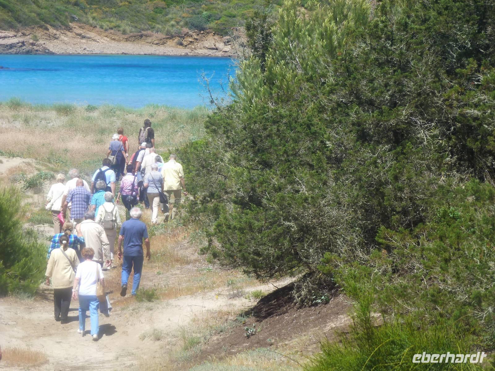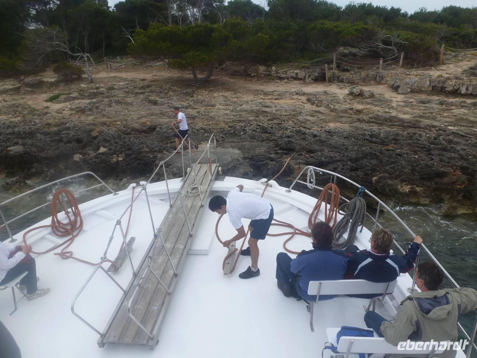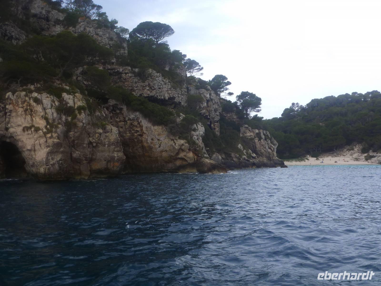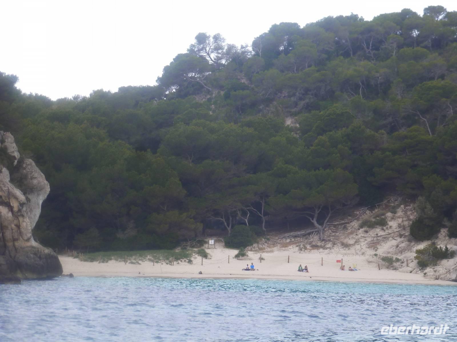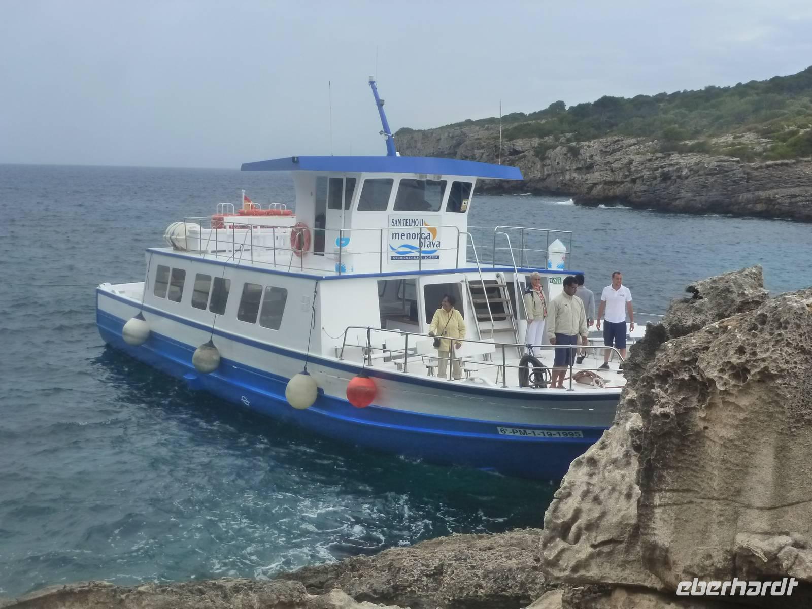 Nach einem gemütlichen Frühstück fahren wir zum Hafen von Ciutadella und besteigen das Ausflugsschiff „San Telmo". Schade heute ist es bewölkt also nix mit Sonnenbaden. Mit unserer Crew schippern wir auf das offene Meer und erreichen nach ca. 90 Minuten die Bucht von Son Saura, unserem ersten Halt. Während die Paella zubereitet wird, wandern wir mit Ronald entlang des Küstenwanderweges zur Naturbucht Es Talaier. Wir erhalten viele Informationen zu Flora und Fauna der Insel und erleben fast unberührte Natur. Auf dem Rückweg springen einige Mutige aus unserer Gruppe ins kühle Nass und gleichzeitig fängt es auch noch an zu regnen. An Bord zurück ließen wir uns eine leckere von der Besatzung zubereitete Paella schmecken. Danach ging es entlang der felsigen Küste bis zur Cala Galdana an der Westküste Menorcas und weiter zur Cala Turqueta, unserem nächsten Stopp. Über kleine Wege entlang der steilen Küste erreichen wir die wunderschöne, kleine ruhige Badebucht mit herrlichem Sandstrand und kleinen Felshöhlen in denen Wanderer, Angler und Jugendliche gelegentlich übernachten. Bei zum Teil ruhiger See erreichen wir am Nachmittag wieder unsere Heimathafen.