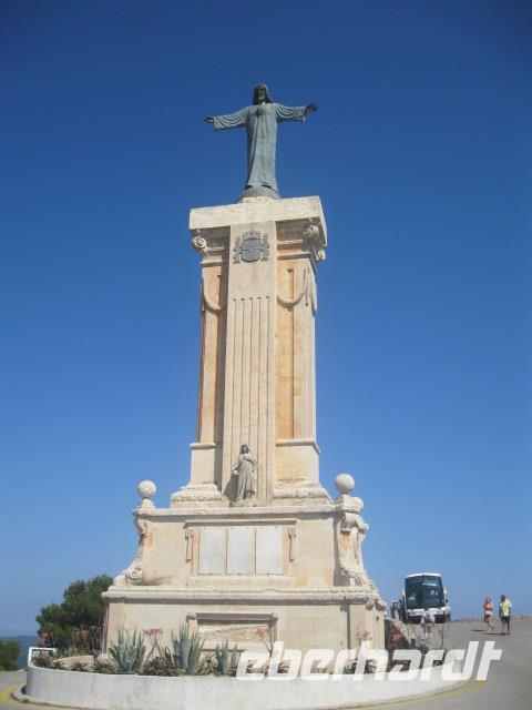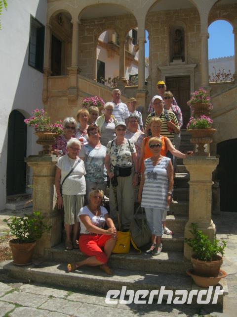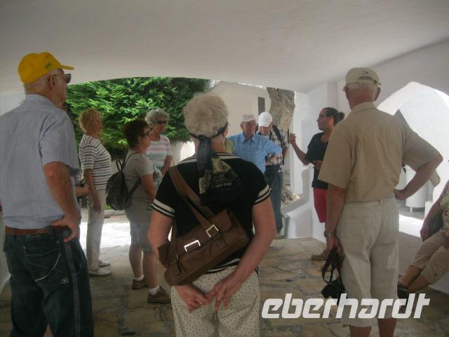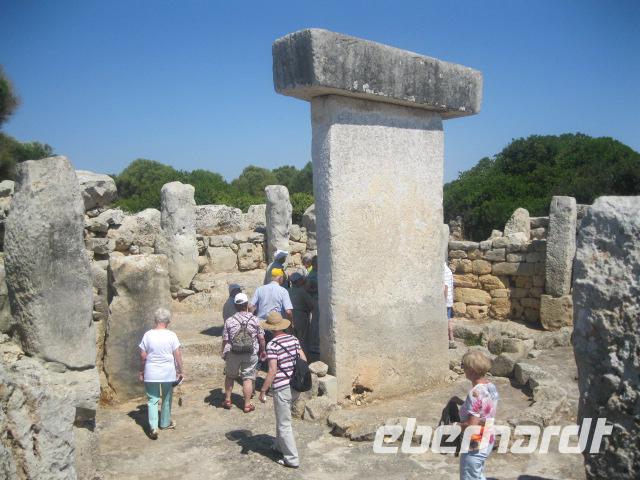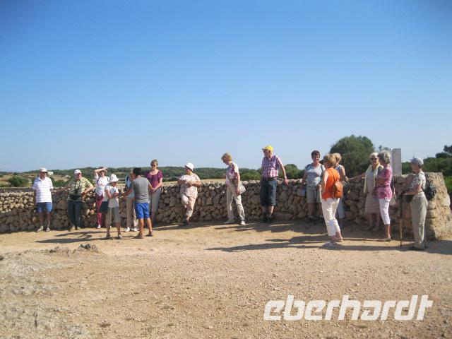 Von weitem grüßte uns die höchste Erhebung Menorcas. El Toro ist 357 m hoch und diesen erreichten wir nach einer rasanten "Tunnelfahrt". Wir hörten die Geschichte der Madonna , besuchten die Wallfahrtsstätte "Mare de deu del Toro" und die drei, noch dort lebenden Nonnen in ihrem Lädchen. Anschließend ging es wieder in die Geschichte, 2000 v. Ch. An Hand der Megalithbauten, Talaiot genannte Wachtürme, erfuhren wir wie ein frühgeschichtliches Warnsystem funktionierte (ohne Handy !!! ). In so einem frühzeitlichen Dorf wurden natürlich auch schon Götter verehrt. Für diese Rituale wurden eigene Tempel, Taula's, geschaffen. Noch ein kleiner Rundgang und wir fuhren weiter ins Fischerdorf Fornell. Hier spazierten wir am Hafen entlang und genossen die etwas kühlere Luft. Nach erholender Freizeit ging es zum nördlichsten Punkt der Insel, Cap de Cavalleria. Der Sand ist hier schon fast rot aber wie überall eine tolle Landschaft. An so einer schönen Stelle schmeckte uns ein Glas gekühlter Sangria besonders gut. Hier wären wir gern länger geblieben. Ramon rief zur "Attacke"und wir nahmen Abschied vom Norden und kehrten in unser Hotel im Westen zurück. Den Nachmittag ließen wir an unserem weißen Strand ausklingen.