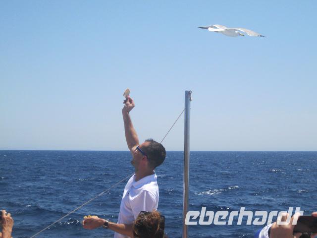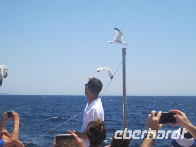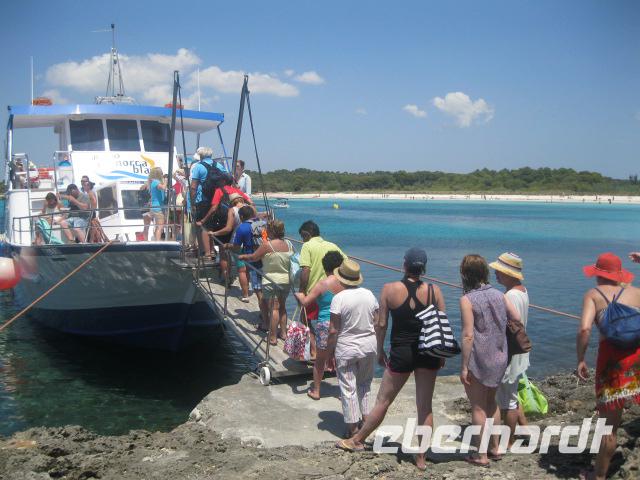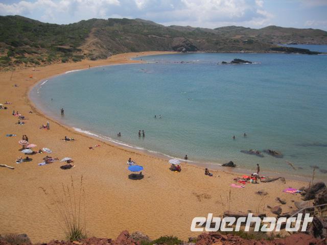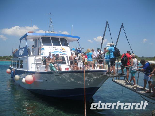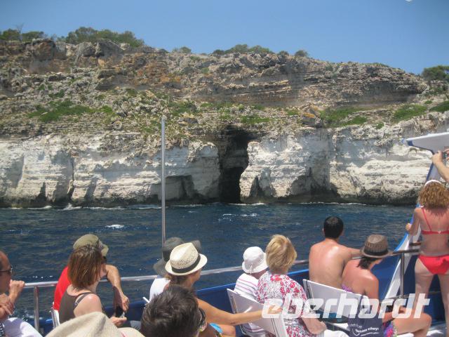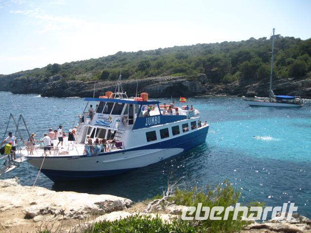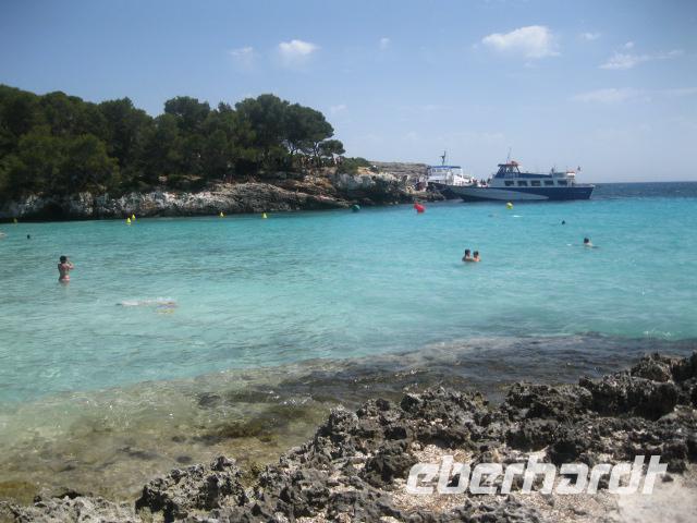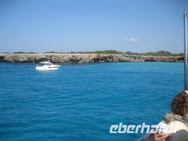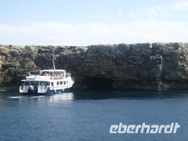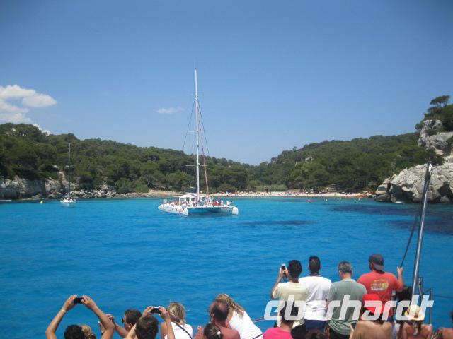 Im Hafen von Ciutadella wartete schon das Ausflugsboot auf uns und gefühlte 100 weitere Gäste. Es ging entlang der Westküste in Richtung Süden. Unser Hotel und die Bucht von Cala Blanca konnten wir vom Boot aus gut erkennen. Beeindruckt waren wir auch von der vielfältigen Küstenformation. Die erste Anlegestelle war die Bucht von Platges de Son Saura. Mit den Gästen, die sich noch etwas bewegen wollten, spazierten wir eine Bucht weiter, zur wildromantischen Es Talaier. In der Zwischenzeit wurde an Bord für uns eine Paella zubereitet. Orangensaft und Sangria rundeten das Mittagessen ab. Langeweile konnte keine aufkommen, ging es doch gleich zum nächsten Fotostopp. Die Macarelleta u.Macarella kamen einigen bestimmt von der Bounty Werbung bekannt vor. Die Cala Santa Caldana ist aber auch die einzigste Bucht auf unserer Route, die von der Straße zu erreichen ist. Zurück gab es wiederum einen Badestopp an der Cala en Turqueta. Leider war diese Bucht, für zwei gut bestückte Boote, recht klein. Die Rücktour führte uns direkt in die Glückshöhle hinein. Wer die Höhlendecke mit der linken Hand berührt, soll das restliche Jahr über nur Glück haben. Glück hatten wir schon heute, mit diesem wunderschönen Sonnentag. Nette Menschen, gutes Essen, weiße Strände, Palmen und türkisblaues Meer, dazu Temperaturen wie in der Badewanne. Wir waren uns einig -schöner kann es in der Karibik auch nicht sein.