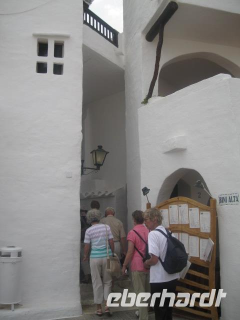 Auch heute zog es uns wieder auf's Wasser. Es war eine Hafenrundfahrt, im größten Naturhafen des gesamten Mittelmeers, geplant. Dieser Hafen gehört zur Inselhauptstadt Mahon. Vom Schiff aus konnten wir die gewaltige Festungsanlage von Isabella II (29 Jahre Bauzeit ) sowie die Lazaretinsel bestaunen. Die Hafeneinfahrt ziehren noch heute Bauten der Kolonialzeit. Sehenswürdigkeiten die die britische Besatzungsmacht hinterließ. In dieser Zeit wurde auch die Gin Herstellung auf Menorca eingeführt. Diesen ganz besonderen Tropfen (Traubendestillat mit Wachholderbeeren verfeinert) mußten wir in der Destille am Hafen probieren. Gin wird auf Menorca mit Lemon getrunken, was den Geschmack noch einmal verfeinert. Ein Stadtbummel in der Hauptstadt durfte nicht fehlen. So suchten wir das ehemalige, gut erhaltene Stadttor auf und betraten auf diesem Weg die Altstadt. Sehr schön die Kirche Santa Maria mit monumentaler Orgel von 1810. Wer wollte konnte sich zur Mittagszeit ein Konzert anhören. Weiter ging unser Ausflug ins weißgetünchte Binibeca. Eine auf Fischerdorf getrimmte, am Reißbrett entstandene, Urlaubersiedlung. Als Höhepunkt des Tages besuchten wir die Höhle Cova d'en Xoroi, direkt am Meer gelegen. Wir hörten die Geschichte von dem ehemals dort lebenden Liebespaar, dass eigentlich immer noch gegenwärtig ist. Die Aussicht durch die riesigen offenen Durchbrüche zum Meer hin sind einfach gigantig. Abend's finden dort Musikveranstaltungen statt. Ein absolut angesagter Sommertreff. Wir genossen die Atmosphäre bei einem Gin -Lemon, Pomada genannt und hörten dem Rauschen der Wellen zu.