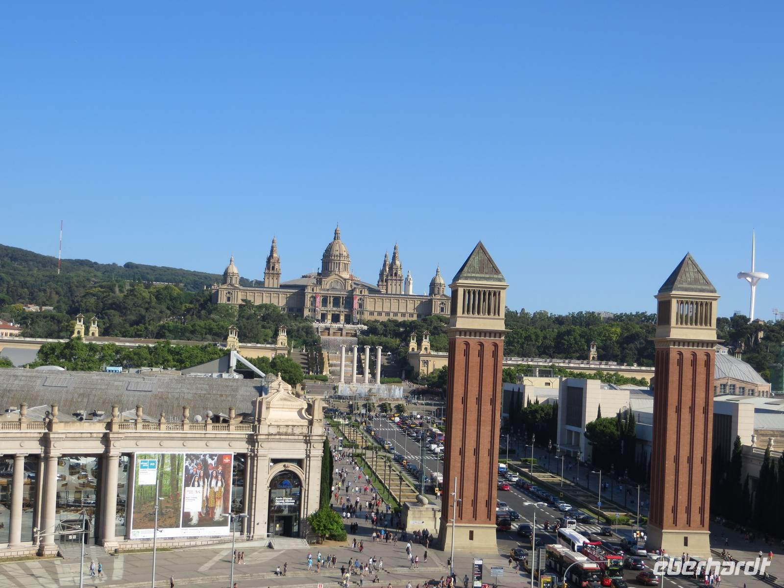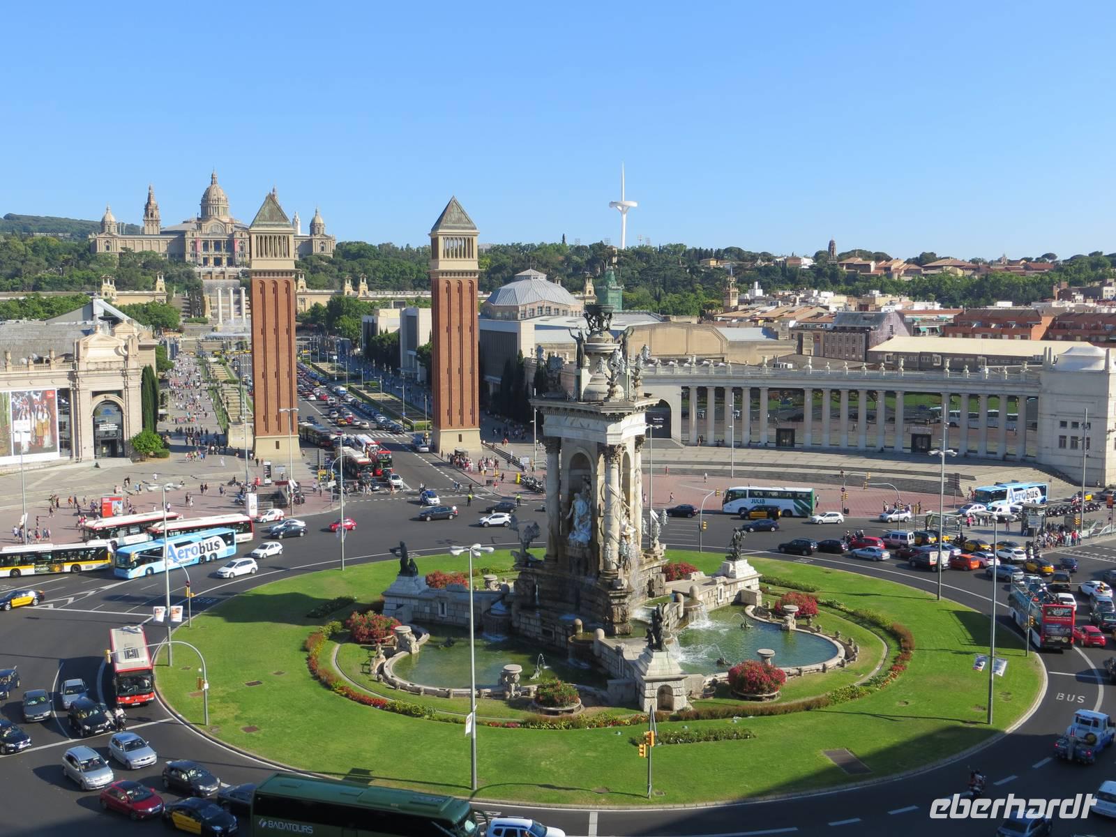 A 321 überflogen wir Frankreich Richtung Marseille und schwenkten dann an der Küste des Mittelmeeres Richtung Barcelona. Gegen 13 Uhr setzten wir auf und waren nach den üblichen Kofferprozedere noch vor 15 Uhr in unserem großen Hotel Calalunia Plaza am Spanischen Platz von Barcelona. Sonnabendlicher Nachmittag, sonnige Wärme und die Nähe zum Stadtcentrum und zum Montjiuc luden die meisten Gäste zum Bummeln ein; viele individuell und eine kleine Gruppe mit dem Eberhardt-Reiseleiter . Nur drei Metrostationen sind es bis zum südlichen ugang zur Rambla am Kolumbusdenkmal. So bummelten wir zwei Stunden auf einer der bedeutendsten innerstädtischen Straßen Europas, La Rambla, und bald schon durch die Gassen der Altstadt Barcelonas zum gothischen Viertel mit der Kathedrale. Zur Kaffeezeit genehmigten wir uns einen kleinen Snack: natürlich Tapas aus verführender Präsentation und in roßer Mannigfaltigkeit zum finanzierbaren Preis. Gleich neben dem Hotel befindet sich die alte Arena, heute eine Marl - sprich ein Warenhaus im Gemäuer einer Stierkampfarena; vom Dach mit zahlreichen Gaststätten hat man von einer Aussichtsplattform eine 360°-Aussicht auf Barcelona.