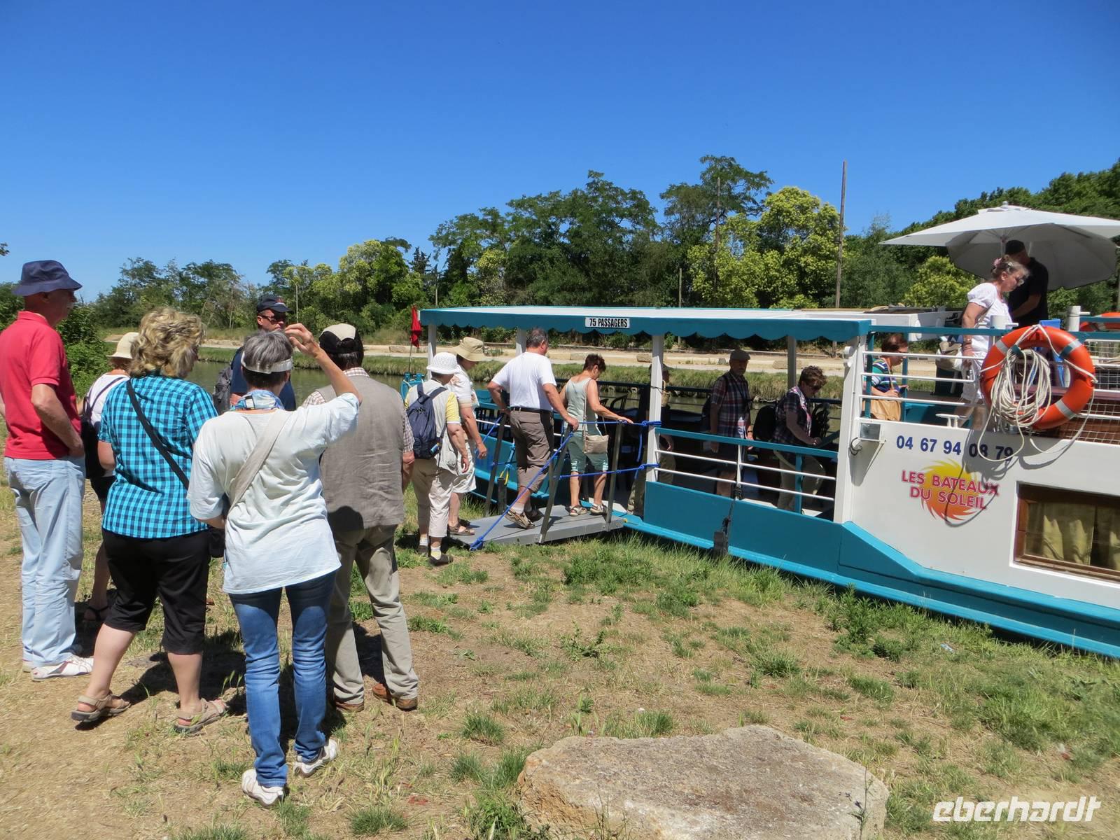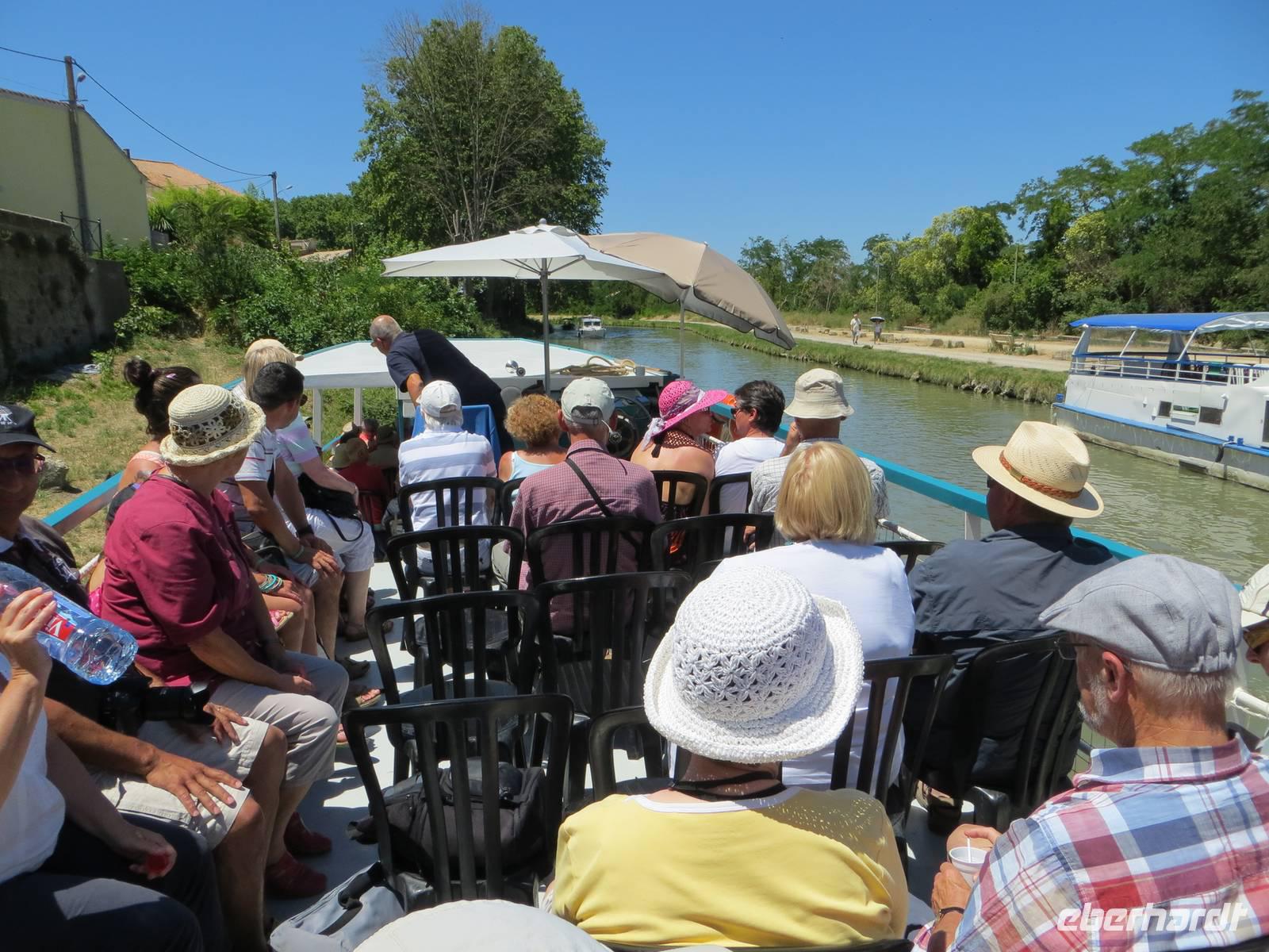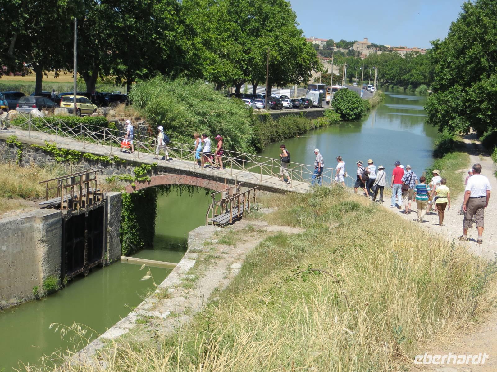 In wenigen Minuten brachte uns unser spanischer Reisebus nach Narbonne. Vom Parkplatz am Wall erreichten wir in wenigen Minuten den Canal de la Robine, einen Nebenkanal des Canal de Midi. An einigen prächtigen Häusern aus dem 17. Jahrhundert konnten wir hier bereits erkennen, das der Canal und der einstige Flusshafen Narbonne Wohlstand ansiedelten. Zielgerichtet erreichten wir den Platz vor dem einstigen Erzbischofspalast, dem heutigen Rathaus, und einer freigelegten Fläche, wo Reste der römischen Via Domitia zu erkennen sind. Wenige Meter dahinter die Kathedrale und unser „Tritt ein in den Dom" („... welch ein herrliches Portal"), aber insbesondere die Höhe von über vierzig Metern macht das Bedeutsame dieser Kathedrale aus, von der aber nur der Westflügel als geschlossene Kirche steht. Nach individuellem Bummeln in Narbonne - mancher auch zur Markthalle - brachte uns der Bus nach Colombiers am Canal de Midi. Die angegebene Zustiegsstelle, sah nicht wie „Port" aus, aber nach einigen Minuten der Unsicherheit ankerte Santa Maria zum Zustieg. Eine sehr schmackhafte Paella und Rose'-Wein gestalteten die erste Stunde unseres Aufenthaltes an Bord noch im Liegen. Unsere zweistündige Fahrt führte uns durch den Tunnel von Malpas und auch mit der Schleusentreppe bei Villeneuve-les-Beziers in die Tiefe. Zum Tagesabschluss ließen wir uns in der hochqualitativen Destillerie Noilly Prat die Produktion von Wermouth-Weinen (ohne Wermut-Kraut aber mit zwanzig bis dreißig anderen Zutaten around the world) erklären und verkosteten drei.