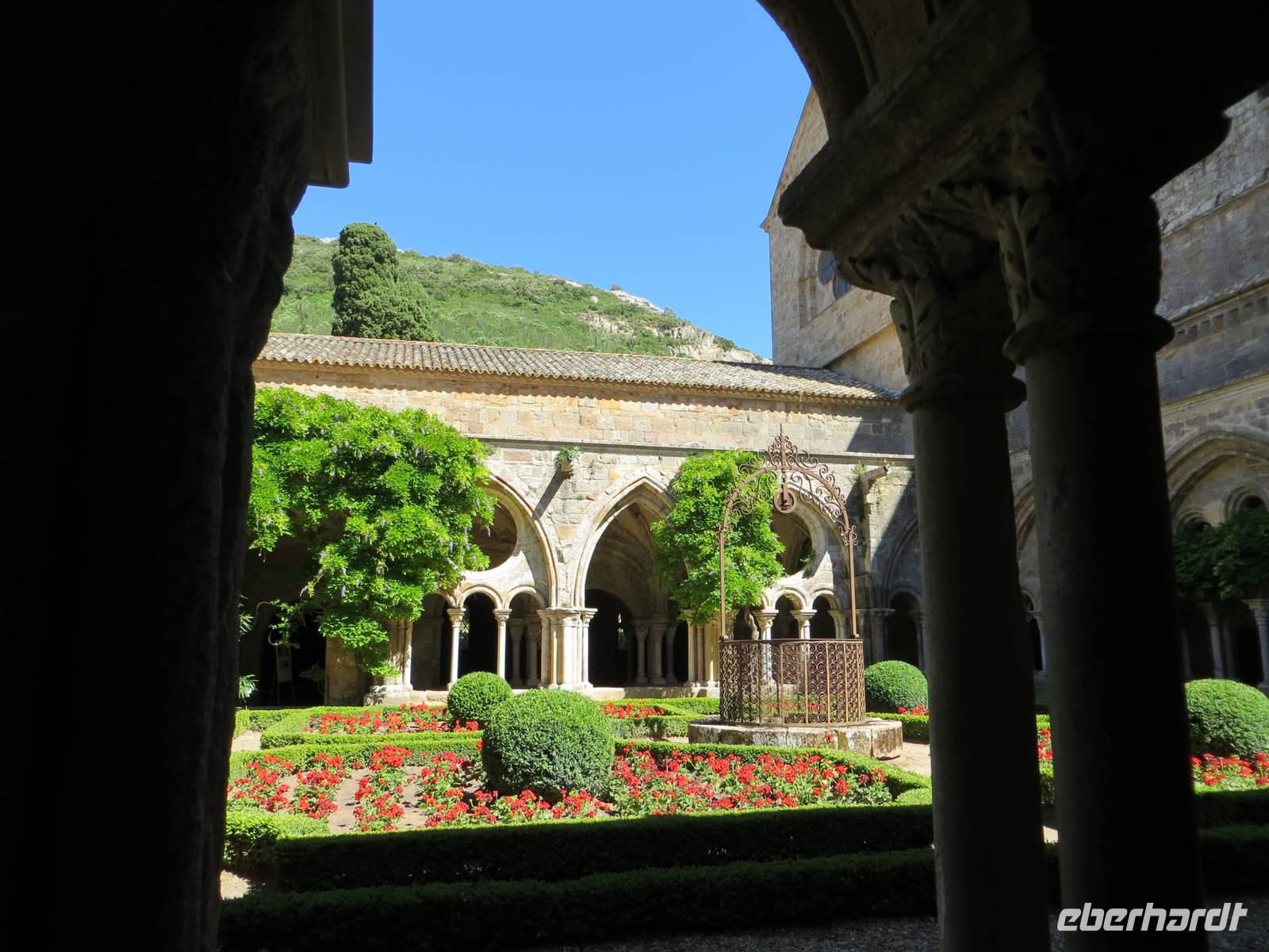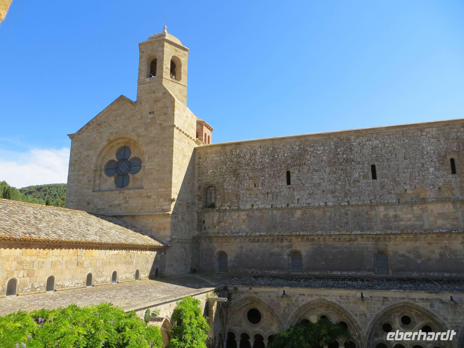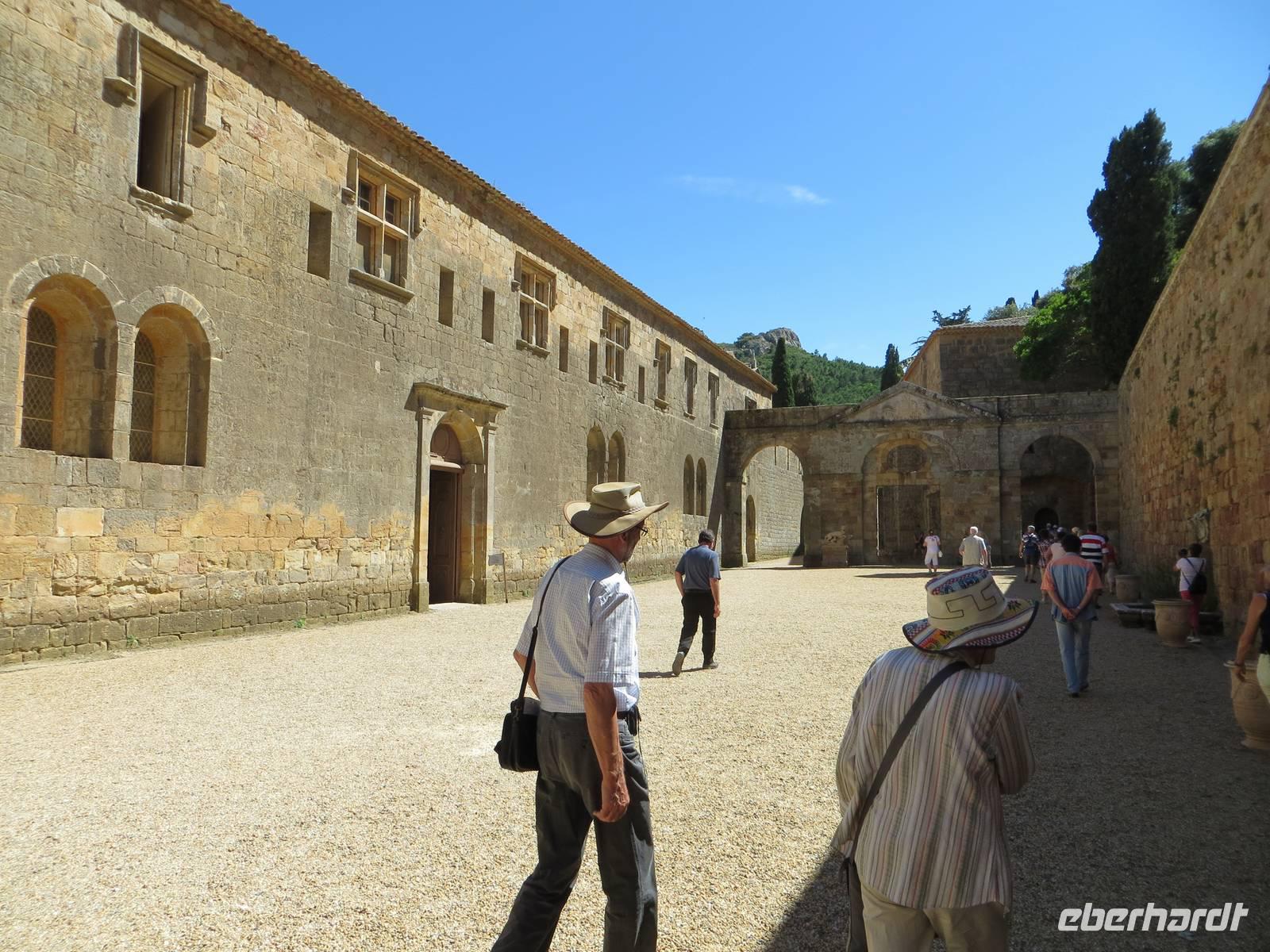 dennoch recht nüchtern fuhren wir zum späten Nachmittag in die Abbaye de Fontfroide, erbaut im 12. Jahrhundert als Kloster der Zisterzienser, wegen Reichtums später von den Benediktinern übernommen, die wohl eher wie Adlige hier lebten. Unser örtliche Führer William erklärte uns beharrlich die architektonischen Unterschiede im Übergang von Romanik zu Gothik. Auf jeden Fall gilt wohl das Kirchenschiff als eines der größten (höchsten) romanischer Kirchen in Frankreich.
