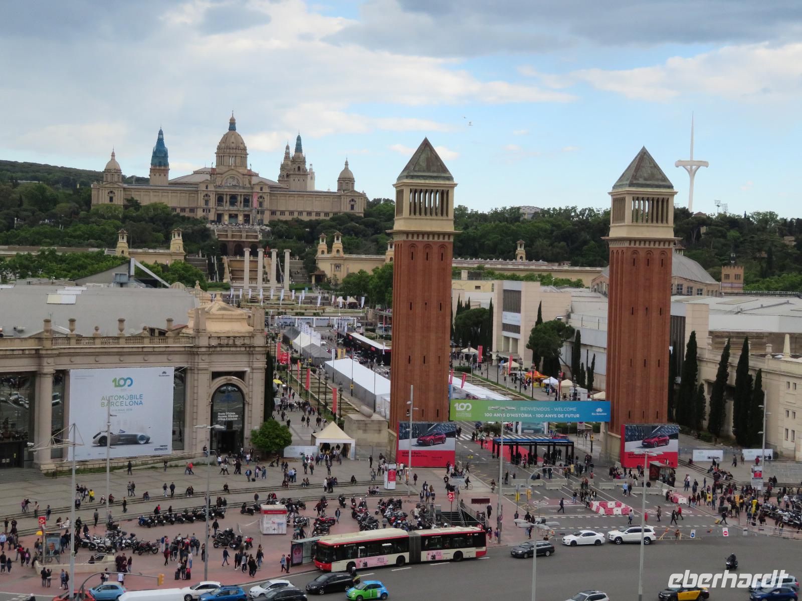 Zum Abendessen mit Tapas fanden wir uns auf dem Dach der Arena ein; beim Verlassen noch ein Blick auf den Montjuc, wo soeben das Fontänenspiel begann.