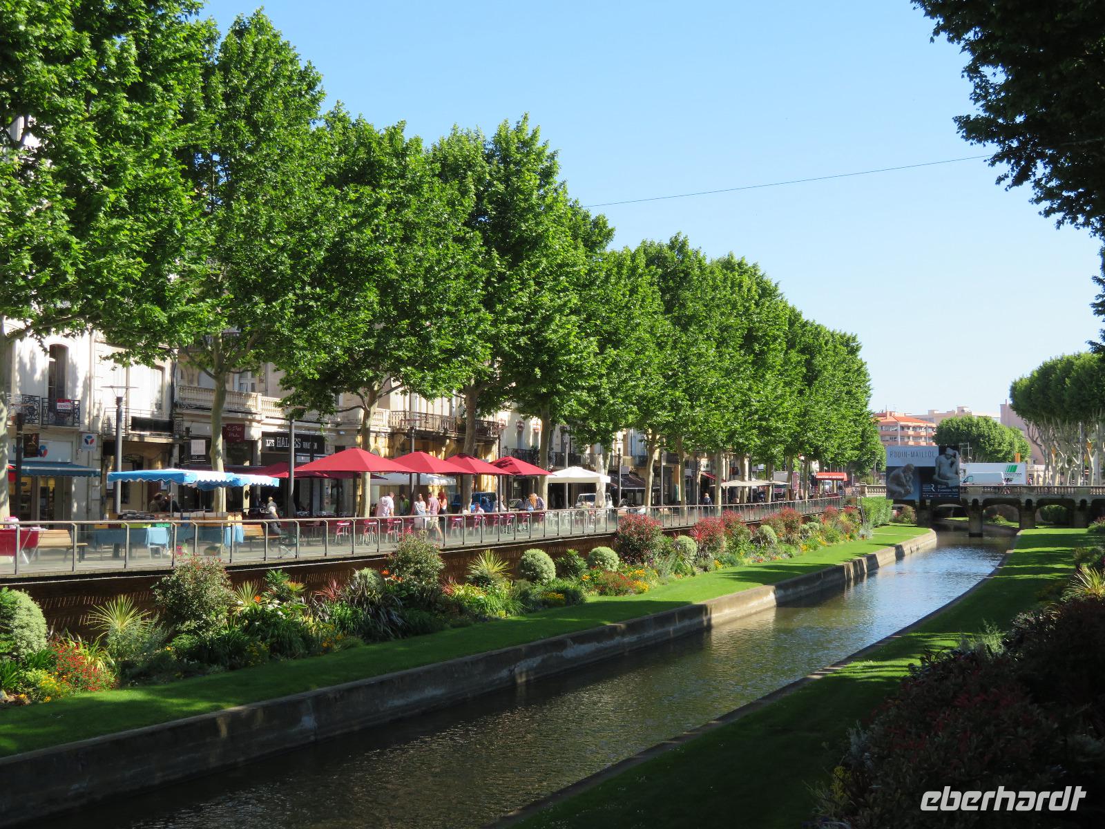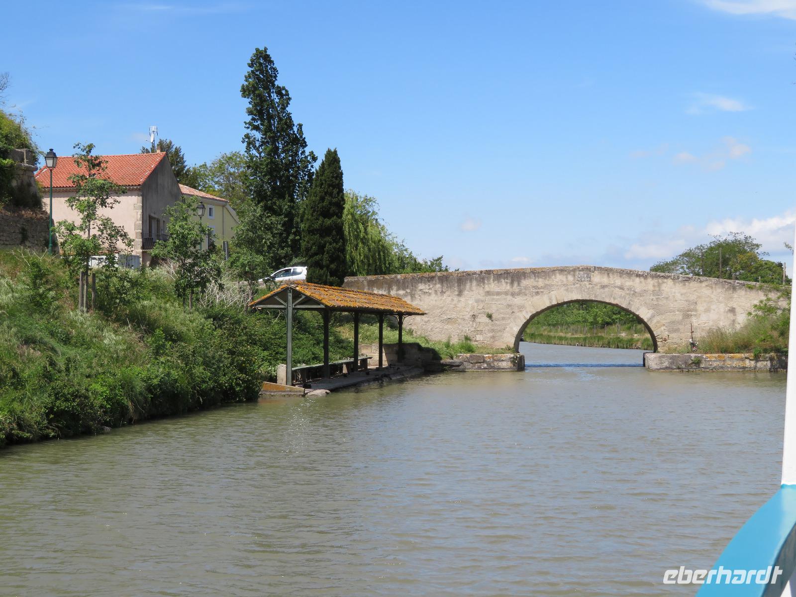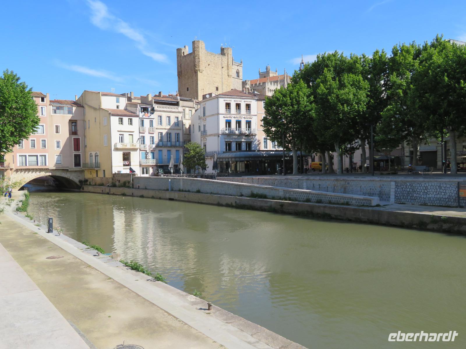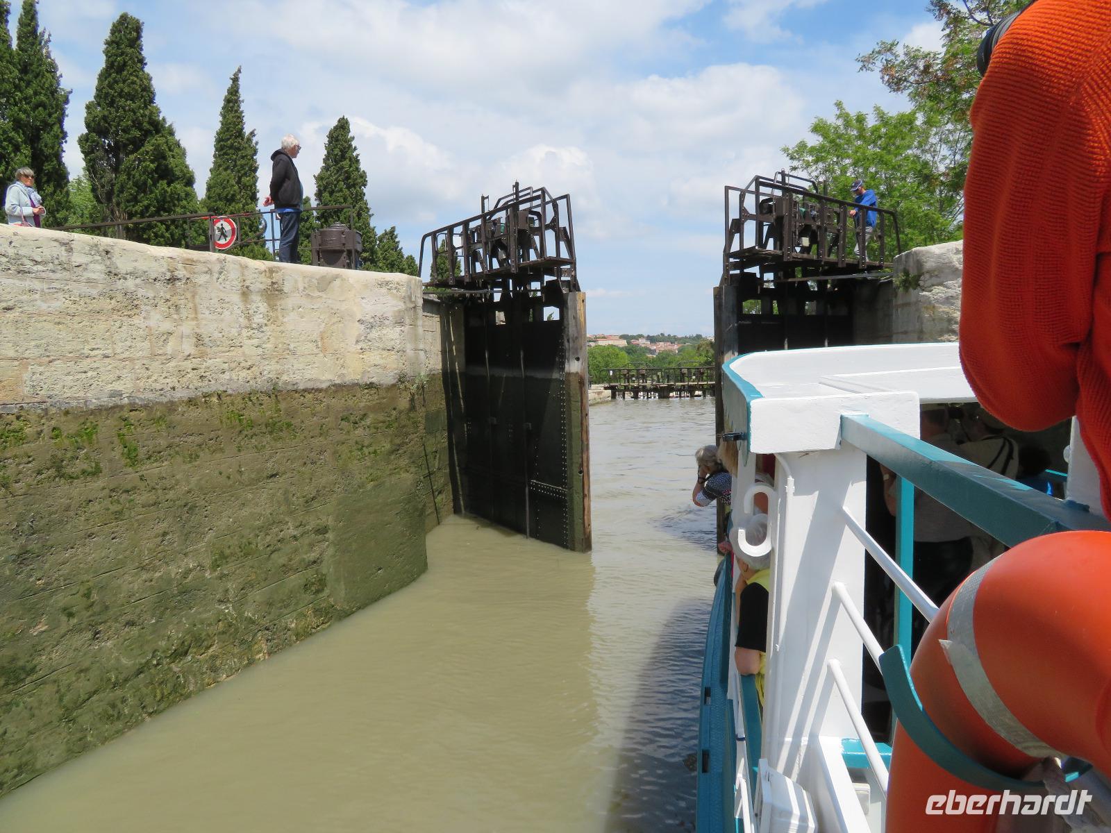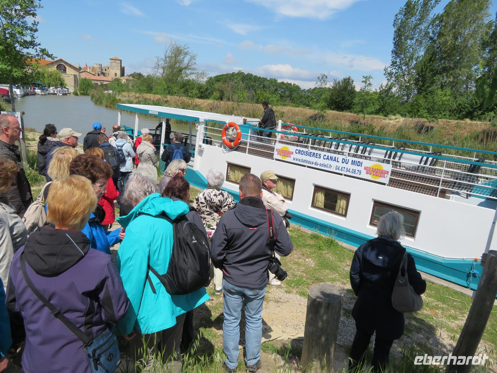 In einer halben Stunde gelangt man üblicherweise von Gruissan nach Narbonne. So standen wir recht schnell am traditionellen Ausgangspunkt für die Stadtbesichtigung in Narbonne. Vom Parkplatz am Wall erreichten wir in wenigen Minuten den Canal de la Robine, einen Nebenkanal des Canal de Midi. An einigen prächtigen Häusern aus dem 17. Jahrhundert konnten wir hier bereits erkennen, dass der Canal und der einstige Flusshafen Narbonne Wohlstand für Händler brachte. Zielgerichtet erreichten wir den Platz vor dem einstigen Erzbischofspalast, dem heutigen Rathaus, und einer freigelegten Fläche, wo Reste der römischen Via Domitia zu erkennen sind. Doch zunächst bummelten wir weiter am Canal bis zur Markthalle, um bei bestem Licht die typischen Fotos zu machen. Dann ging es zur Ausgrabung der Via Dormitia und weiter mit der Gasse zwischen altem und neuem Erzbischofspalast. Schließlich erreichten wir die Kathedrale St. Juist. Die Höhe des Kirchenschiffes von über vierzig Metern macht das Bedeutsame dieser frühgotischen Kathedrale aus, von der aber nur der Chor als geschlossene Kirche steht. Nach kurzem individuellem Bummeln in Narbonne brachte uns der Bus nach Colombiers am Canal de Midi. An die neue Zustiegsstelle östlich vom kleinen Hafen kam bald unser Schiff „Santa Maria" mit Schiffsführer Karim, wie immer freundlich und zu Späßen aufgelegt. Bei prächtigem Mittagswetter fuhren wir zunächst westwärts bis zum Wendepunkt hinter dem Tunnel von Malpas. Eine sehr schmackhafte Paella, Rot- und Rose'-Wein gestalteten den Stopp auf dem Canal de Midi. Unsere folgende zweistündige Fahrt führte uns nun östwärts bis zur Schleusentreppe bei Villeneuve-les-Beziers in die Tiefe. Ein neuer Ausstieg direkt unter der Schleusentreppe - also nicht mit dem Kanalbett über den Fluss Orb bis in den Port - machte das Umdisponieren des Busses zum neuen Parkplatz an den 9 Schleusen erforderlich.