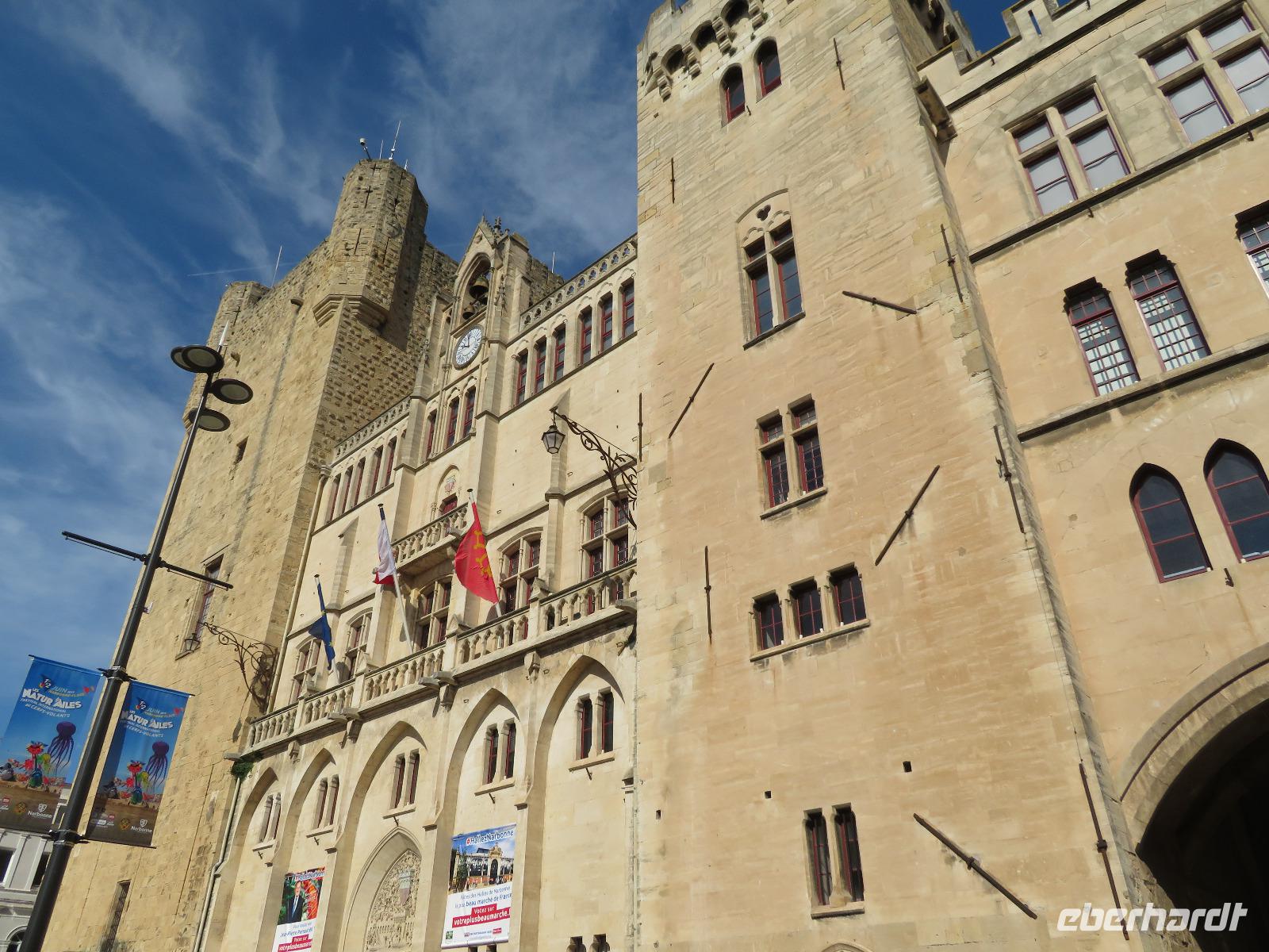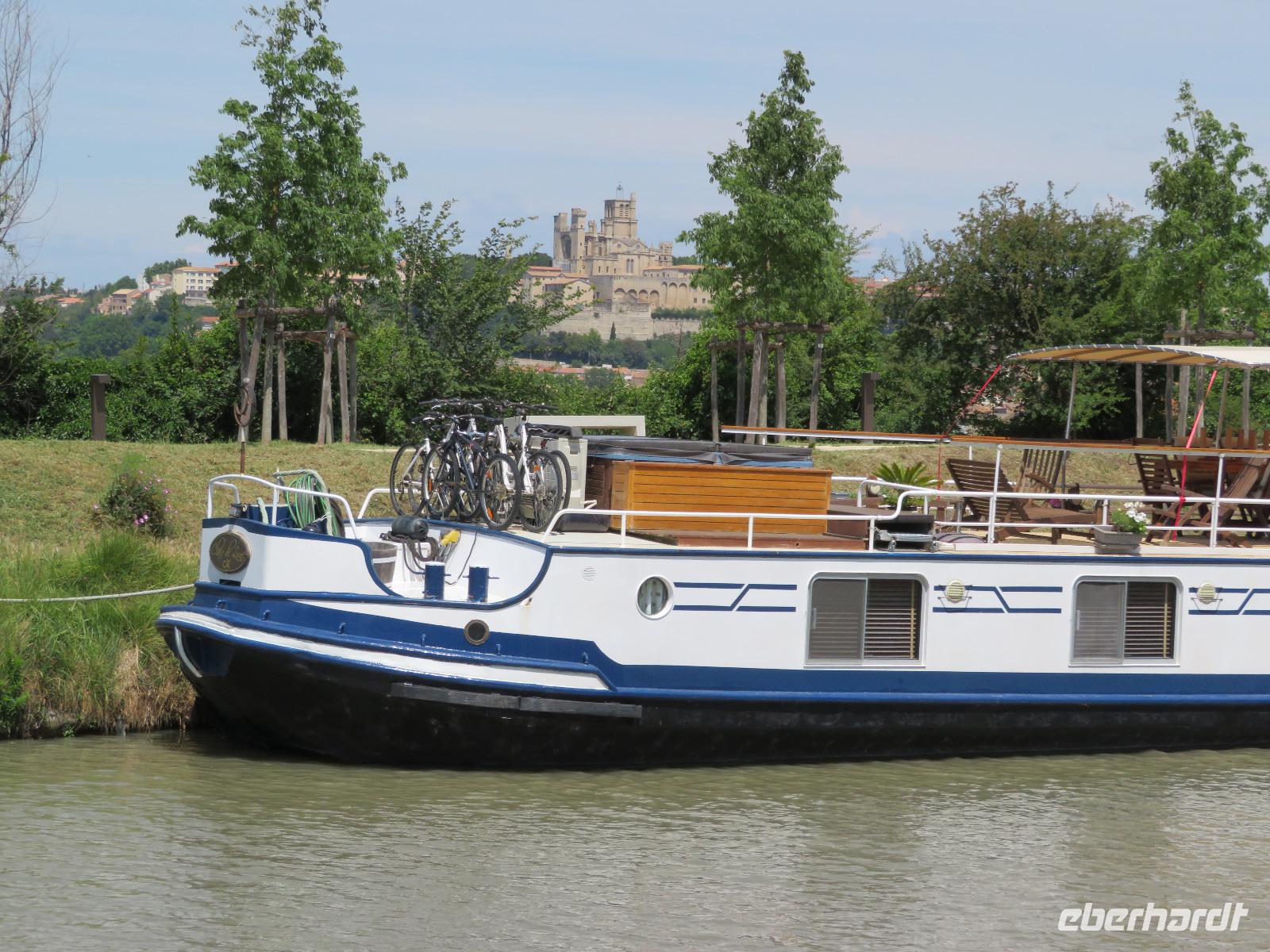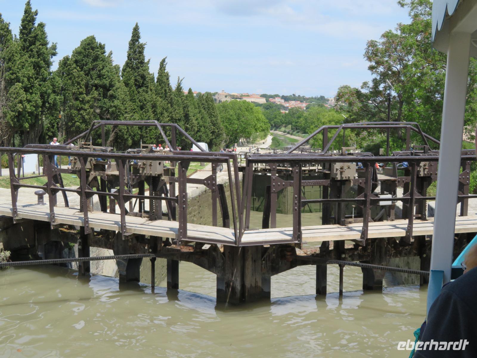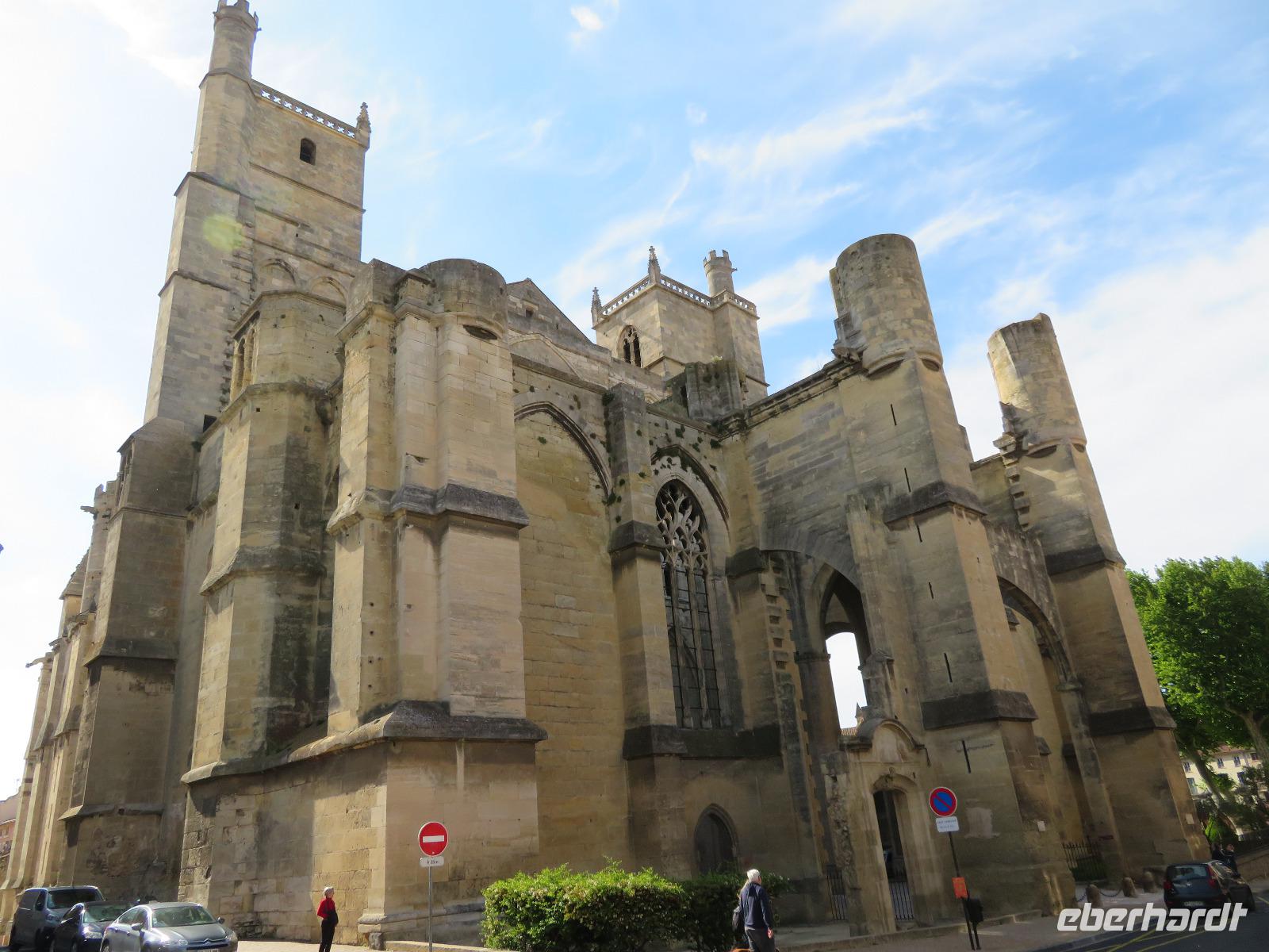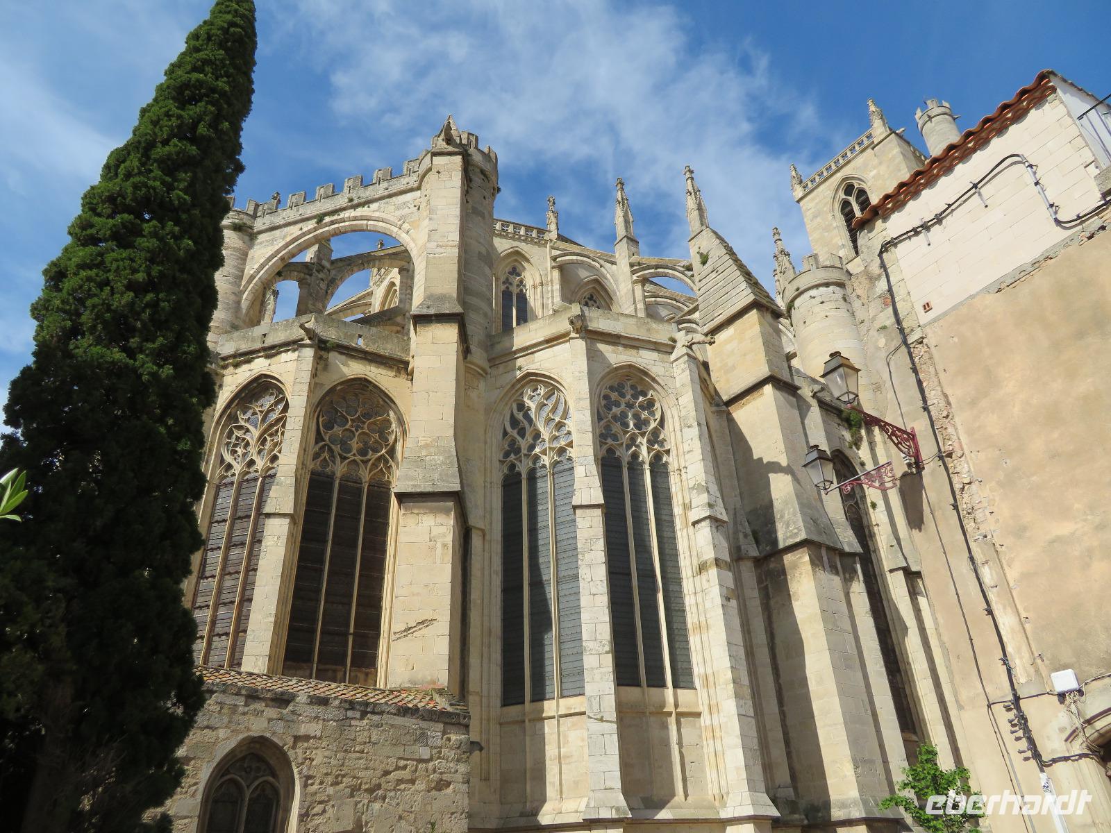 In einer halben Stunde gelangt man üblicherweise von Gruissan nach Narbonne. So standen wir recht schnell am traditionellen Ausgangspunkt für die Stadtbesichtigung in Narbonne. Vom Parkplatz am Wall erreichten wir in wenigen Minuten den Canal de la Robine, einen Nebenkanal des Canal de Midi. An einigen prächtigen Häusern aus dem 17. Jahrhundert konnten wir hier bereits erkennen, dass der Canal und der einstige Flusshafen Narbonne Wohlstand für Händler brachte. Zielgerichtet erreichten wir den Platz vor dem einstigen Erzbischofspalast, dem heutigen Rathaus, und einer freigelegten Fläche, wo Reste der römischen Via Domitia zu erkennen sind. Doch zunächst bummelten wir weiter am Canal bis zur Markthalle, um bei bestem Licht die typischen Fotos zu machen. Dann ging es zur Ausgrabung der Via Dormitia und weiter mit der Gasse zwischen altem und neuem Erzbischofspalast. Schließlich erreichten wir die Kathedrale St. Juist. Die Höhe des Kirchenschiffes von über vierzig Metern macht das Bedeutsame dieser frühgotischen Kathedrale aus, von der aber nur der Chor als geschlossene Kirche steht. Nach kurzem individuellem Bummeln in Narbonne brachte uns der Bus nach Colombiers am Canal de Midi. An die neue Zustiegsstelle östlich vom kleinen Hafen kam bald unser Schiff „Santa Maria" mit Schiffsführer Karim, wie immer freundlich und zu Späßen aufgelegt. Bei prächtigem Mittagswetter fuhren wir zunächst westwärts bis zum Wendepunkt hinter dem Tunnel von Malpas. Eine sehr schmackhafte Paella, Rot- und Rose'-Wein gestalteten den Stopp auf dem Canal de Midi. Unsere folgende zweistündige Fahrt führte uns nun östwärts bis zur Schleusentreppe bei Villeneuve-les-Beziers in die Tiefe. Ein neuer Ausstieg direkt unter der Schleusentreppe - also nicht mit dem Kanalbett über den Fluss Orb bis in den Port - machte das Umdisponieren des Busses zum neuen Parkplatz an den 9 Schleusen erforderlich.