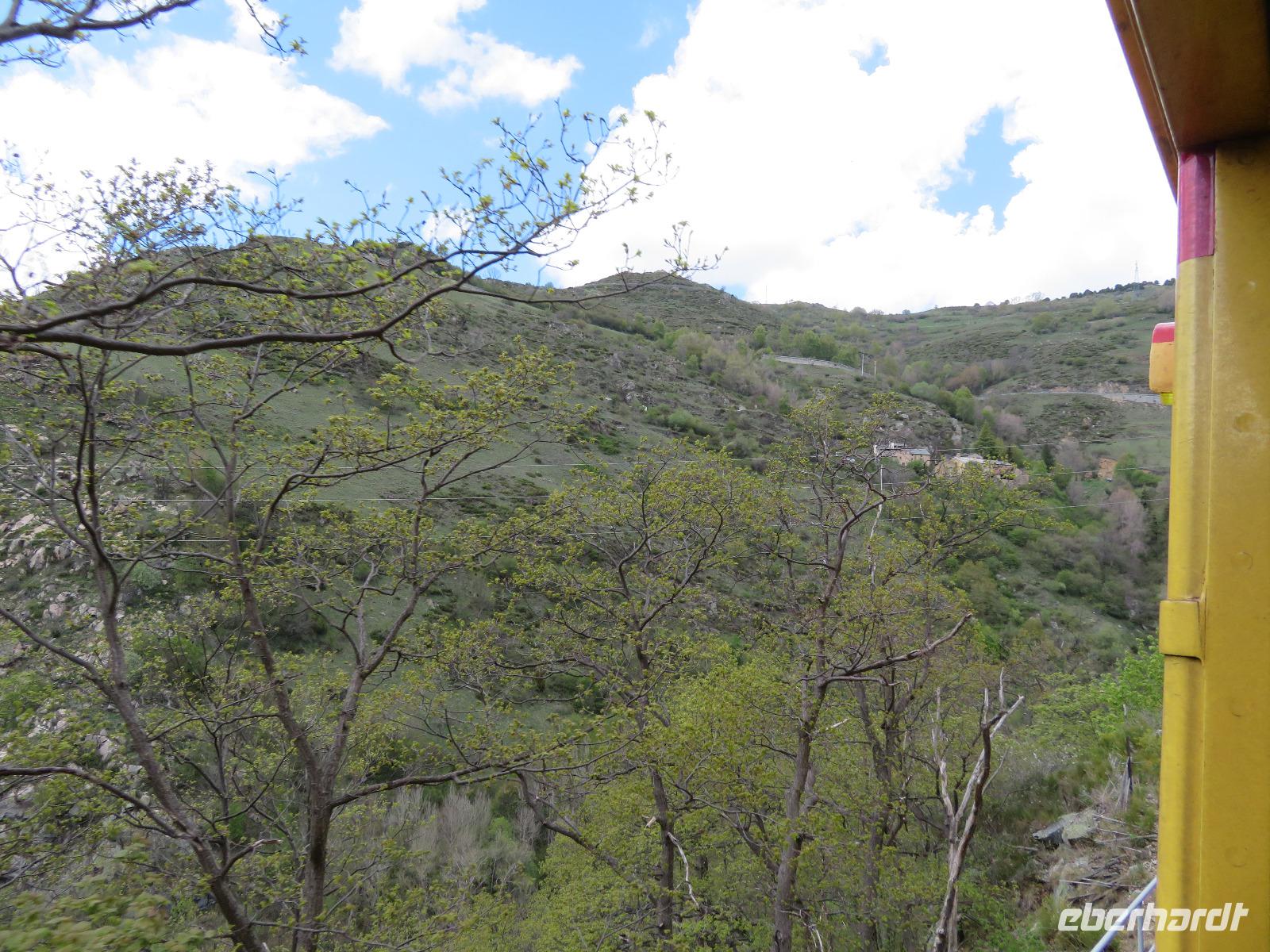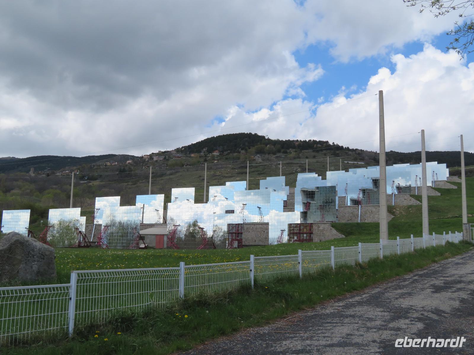 Die Zugfahrt in kleinen gelben Waggons mit der Möglichkeit vom Perron zu fotografieren führte zunächst im grünen Tal aufwärts. Deutlich spürte man die Vegetationsunterschiede mit zunehmender Höhe. Nach fast ein und einer halben Stunde erreichten wir den höchsten Punkt in 1592 Meter üNN im Anblick schneebedeckter Berge. Ausstieg dann nach erlebnisreicher Fahrt in Fort Romeo. Gleich um die Ecke befindet sich die Solaranlage Four Solair, erste großtechnische Versuche, aus dem Sonnenlicht Energie zu gewinnen; für uns war es einen Stopp Wert und Möglichkeit auf französische Wissenschafts- und Kulturleistungen insgesamt aufmerksam zu machen.