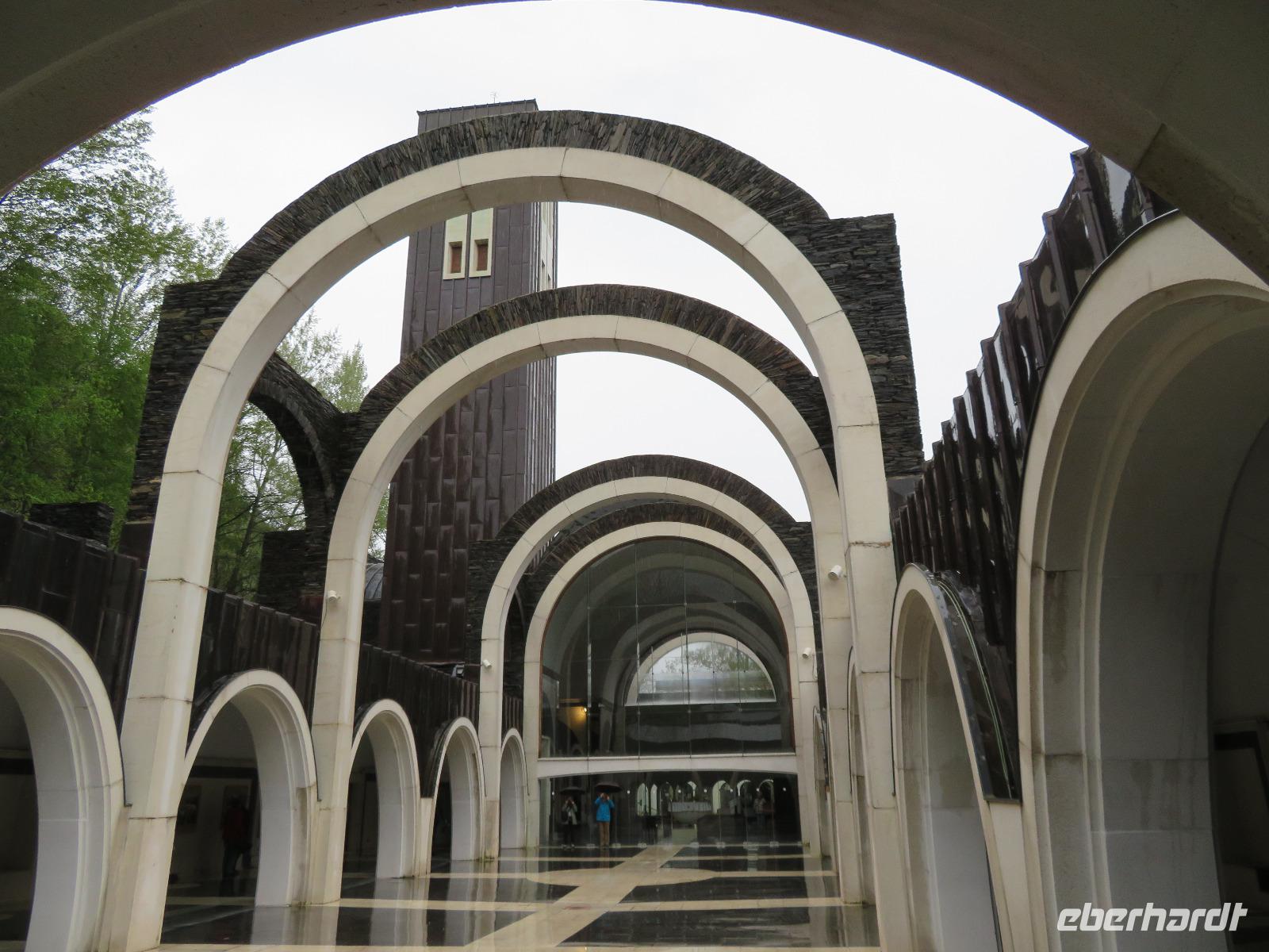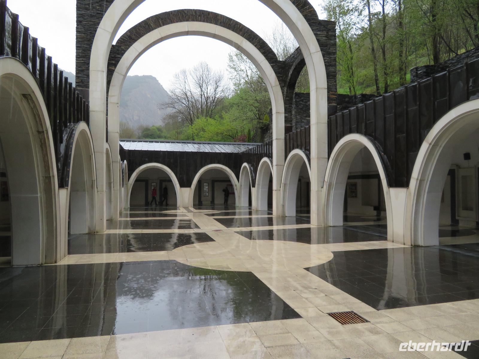 Von unserem Hotelstandort in Soldeu fuhren wir zunächst nur wenige Kilometer bis zur Abbey von Meritxell. Diese bedeutende Kirche für die Andorraner mit einer Holzfigur der Schutzheilgen brannte 1972 ab. Wenige Jahre später wurde eine moderne Kirche mit Natursteinen und viel Glas gebaut, die in ihrer Formensprache romanische Bögen aufnimmt und den Blick auf die Berge zulässt. Bei unserem Besuch endeten die Blicke in Regenwolken und permanentem Regen. Am späten Vormittag hatten wir noch Zeit und fuhren trotz Regens in die Berge bei Engolasters. Die romanische Kirche Sao Miguel und der Bergsee waren unser Ziel. Überpünktlich - wartend hörten wir Saint Saens - erreichten wir das Restaurant Borda del Avi: luftgetrocknete Wurst mit „Tomatenbrot" (das ist die Knoblauchvariante mit Olivenöl), Schinken mit Melone, Verschiedenes vom Grill und dann noch eine creme catalan!