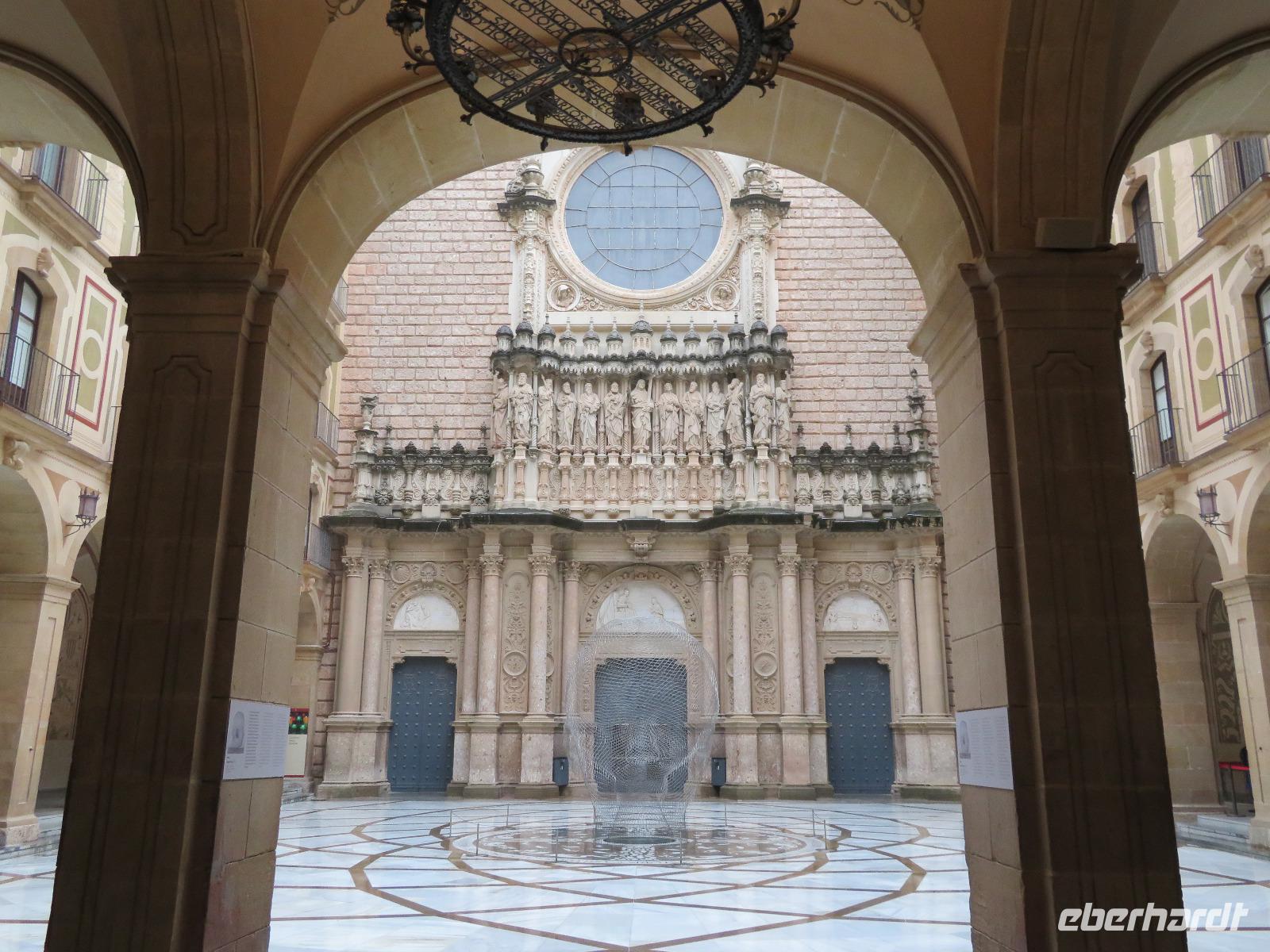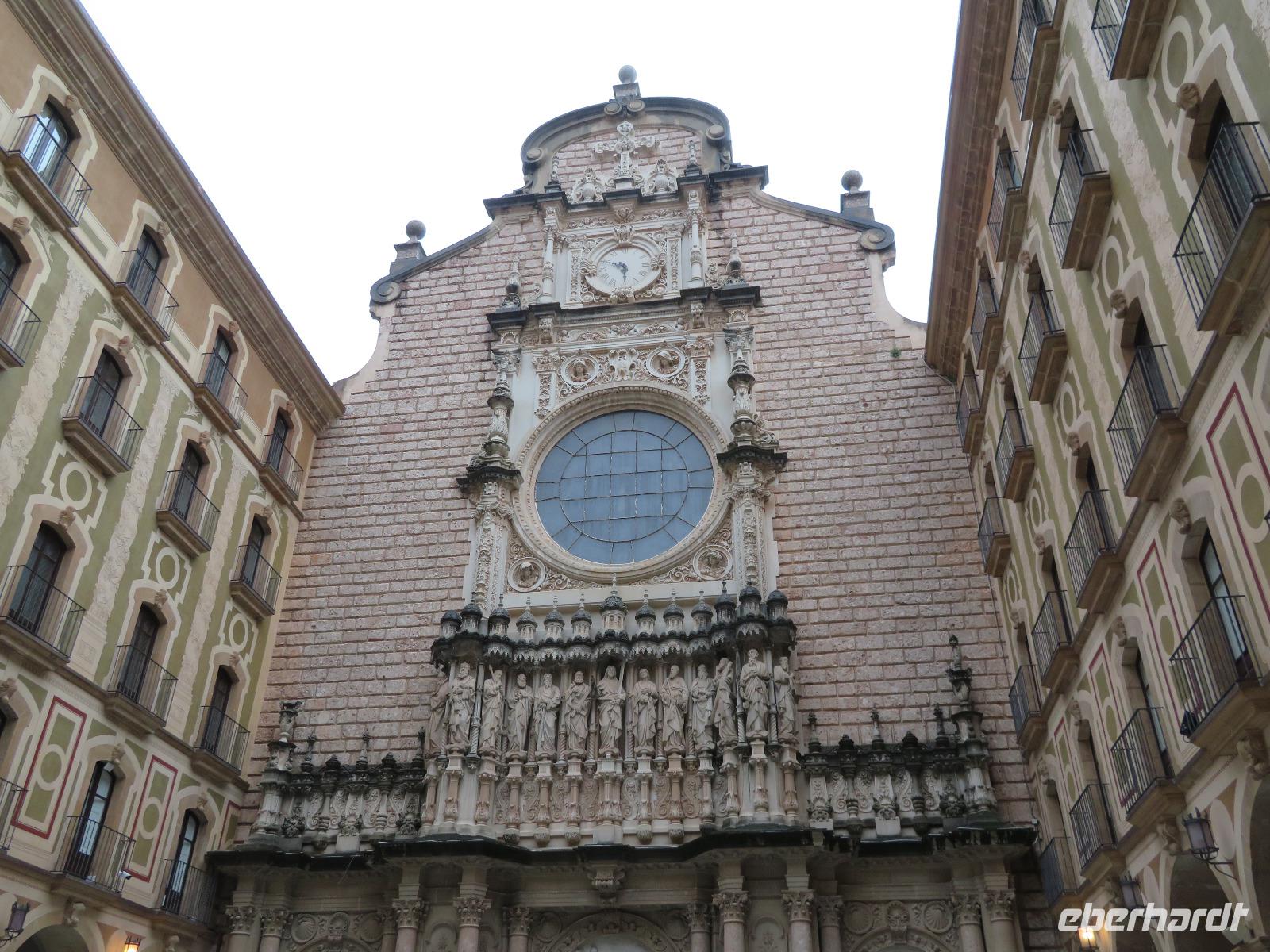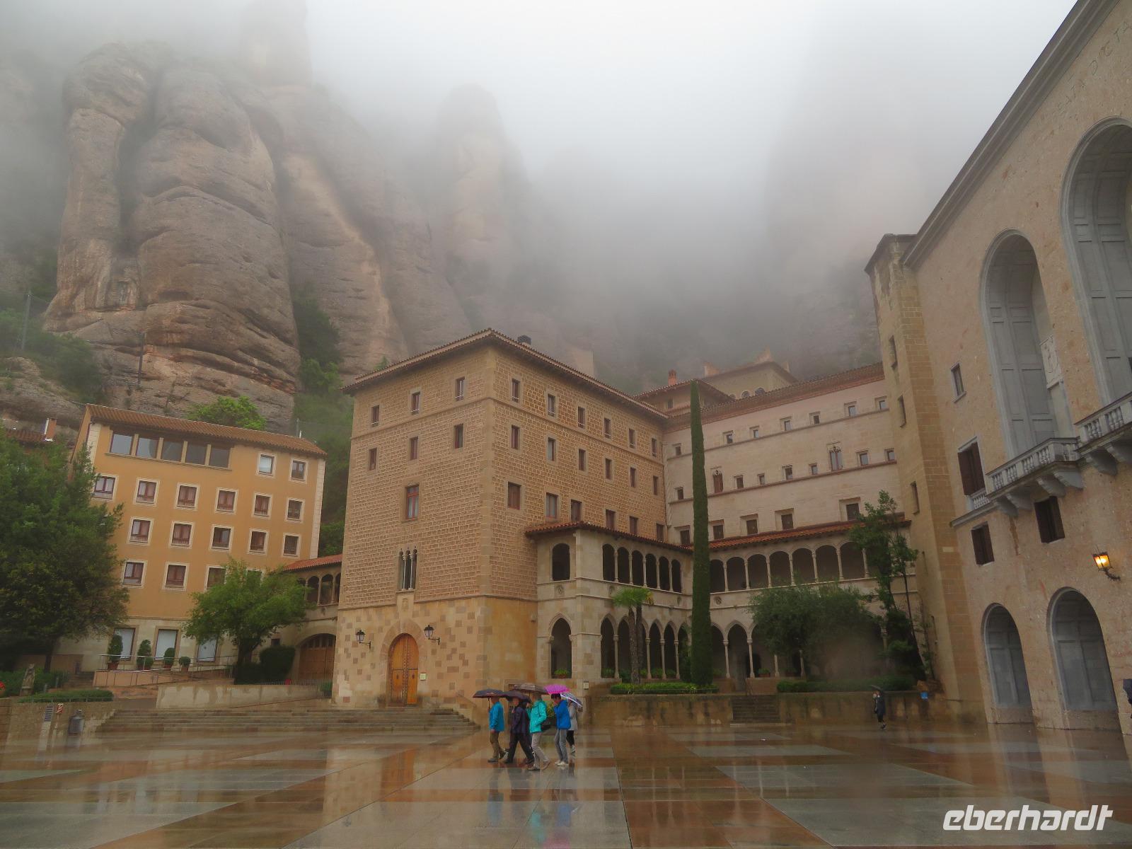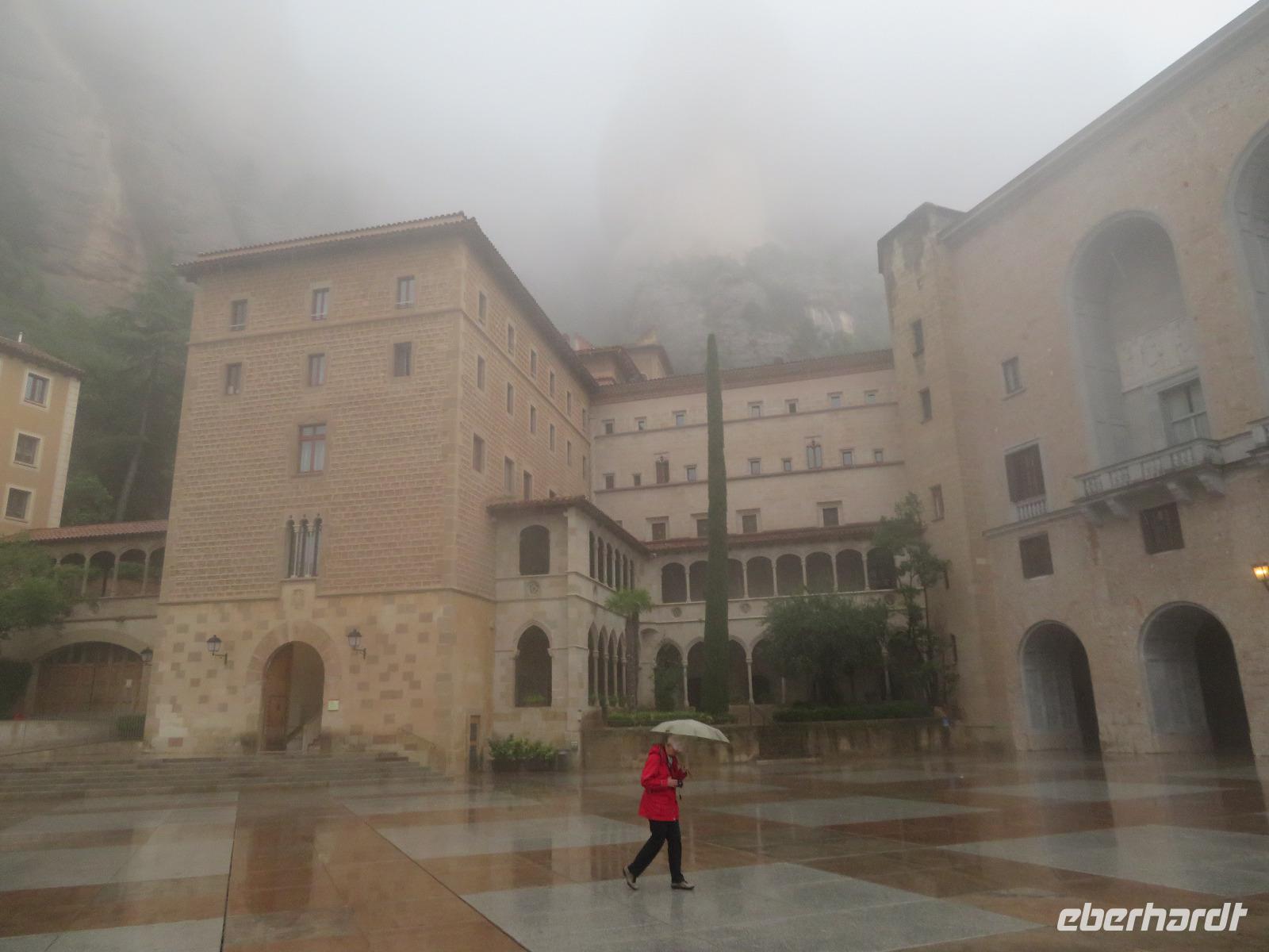 Nach zwei Stunden Busfahrt im Regen erreichten wir die Berge Montserrat. Bei bestelltem Gepäcktransport erreichten wir nach einigen hundert Fußwegmetern das Kloster und das Hotel Abas Cisneros. Die Regenwolken hingen tief in den Bergen - nichts für Gäste, die nach Sonnenfotos gieren. Am späten Nachmittag dann erste Erkundungen im Klosterareal von Montserrat. In der Basilika fand ab 18:15 Uhr eine Messe statt, so konnte man gut teilnehmen, aber der Zugang zur Madonna von Montserrat, der Schutzheiligen Kataloniens, war in dieser Zeit versperrt. Letztlich konnten aber alle Gäste noch an diesem Abend der Madonna einen Besuch abstatten. Abendstimmung mit beleuchteter Basilika kam bei Regen in den Bergen Montserrat auf siebenhundert Meter Höhe wenig auf.