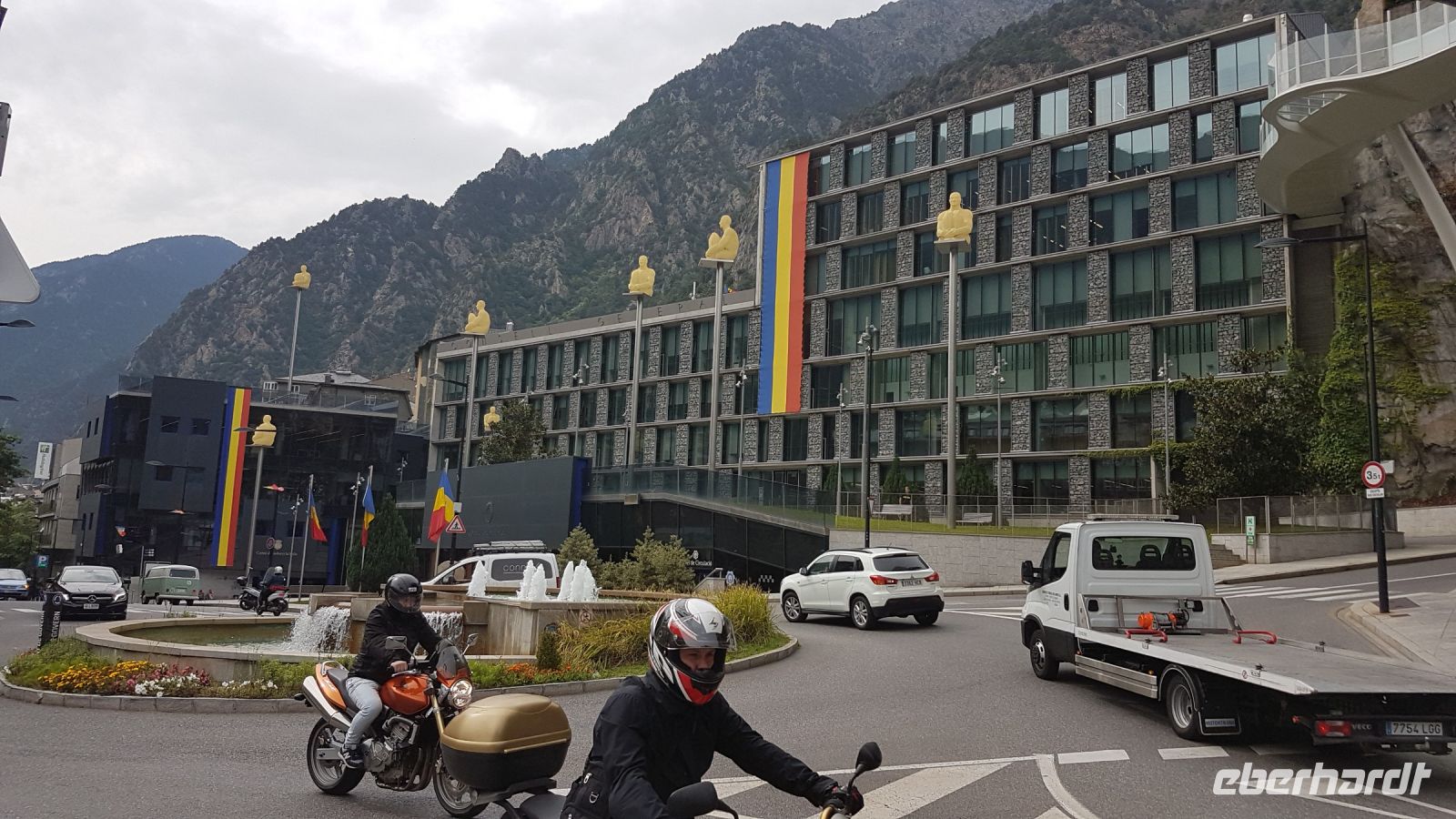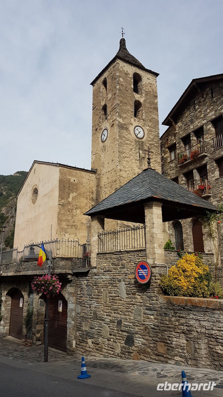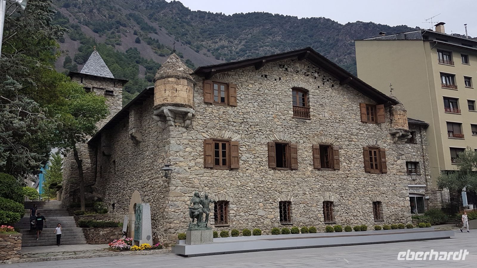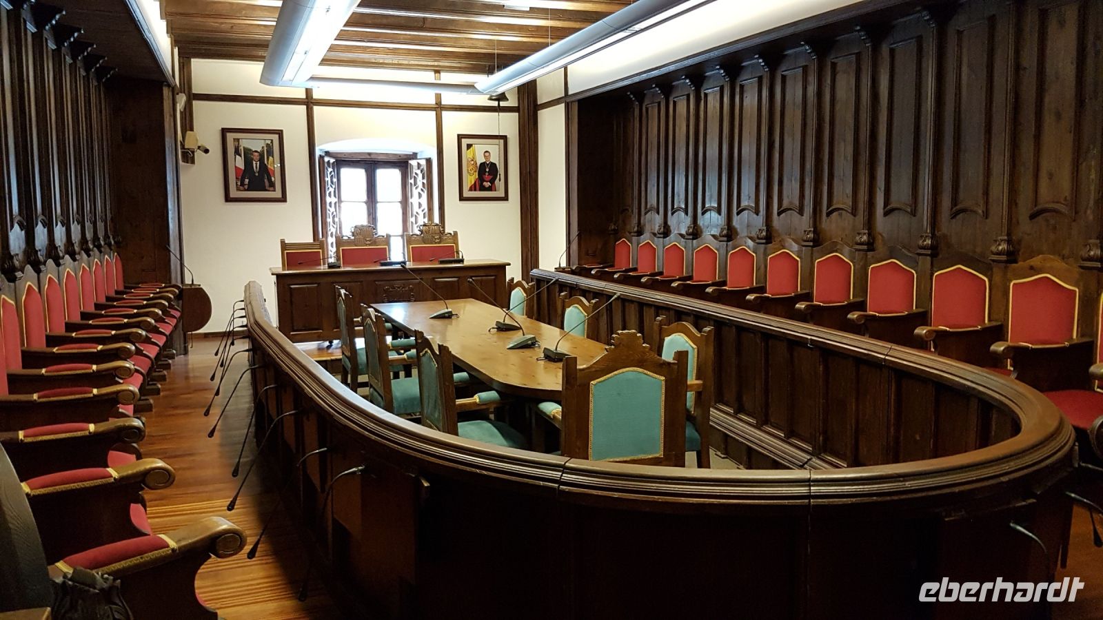 Wir wollen jetzt nach Andorra la Vella, die Hauptstadt des Fürstentums. Unsere Tour beginnt mit dem Casa de la Vall, der historische Sitz des Parlaments. Seit dem Bau des neuen Parlaments in der unmittelbaren Umgebung im Jahr 2011 ist das Bau nur bei besonderen Anlässen als solcher benutzt. Im Sitzungssaal sehen wir den Schrank mit den 7 Schlüsseln, die nur mit den Vertretern der 7 Gemeinden des Fürstentums geöffnet werden kann, sowie die offiziellen Bilder des Bischofs von Urgell und des französischen Präsidenten, die beiden Kofürsten von Andorra.
