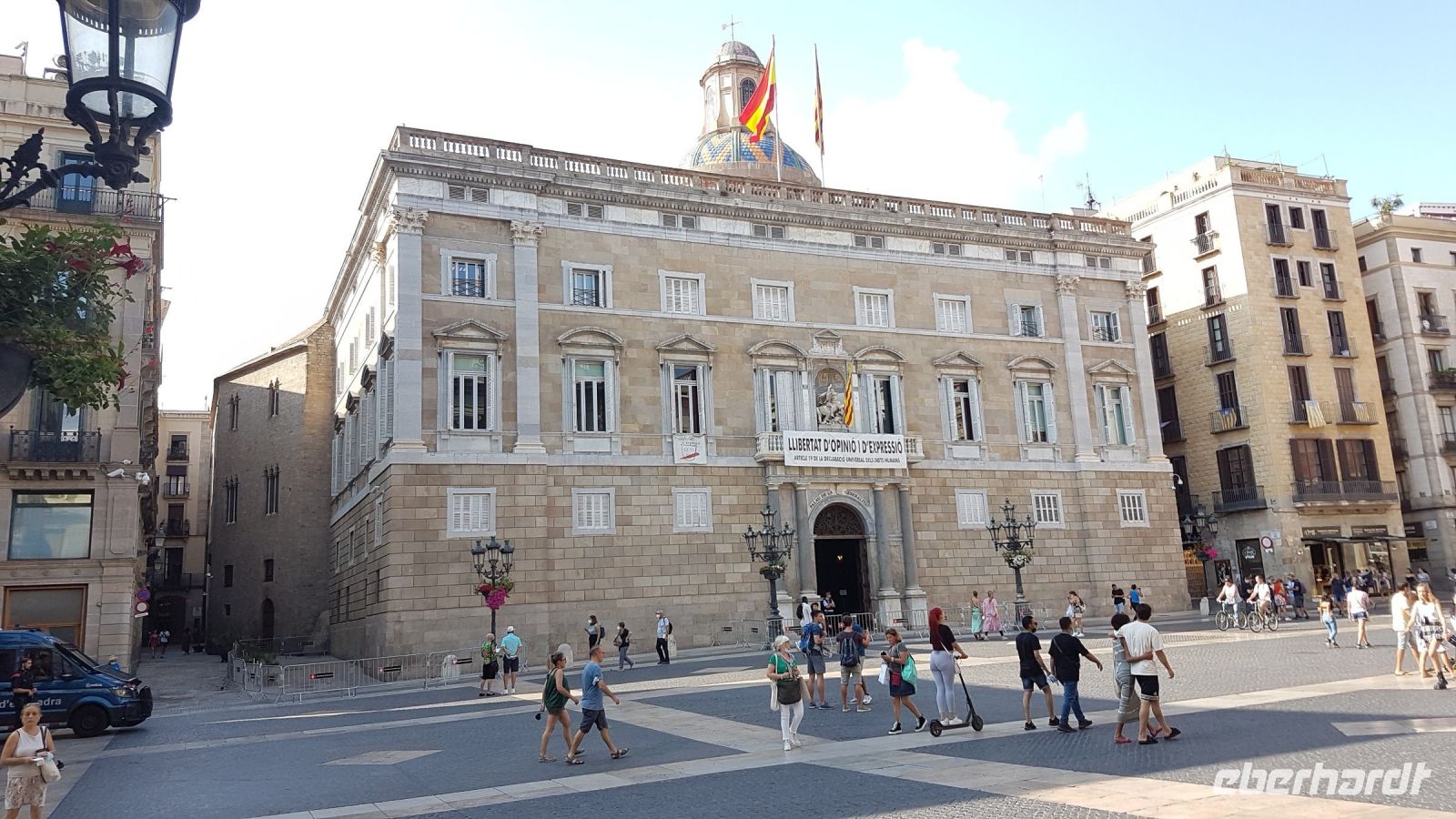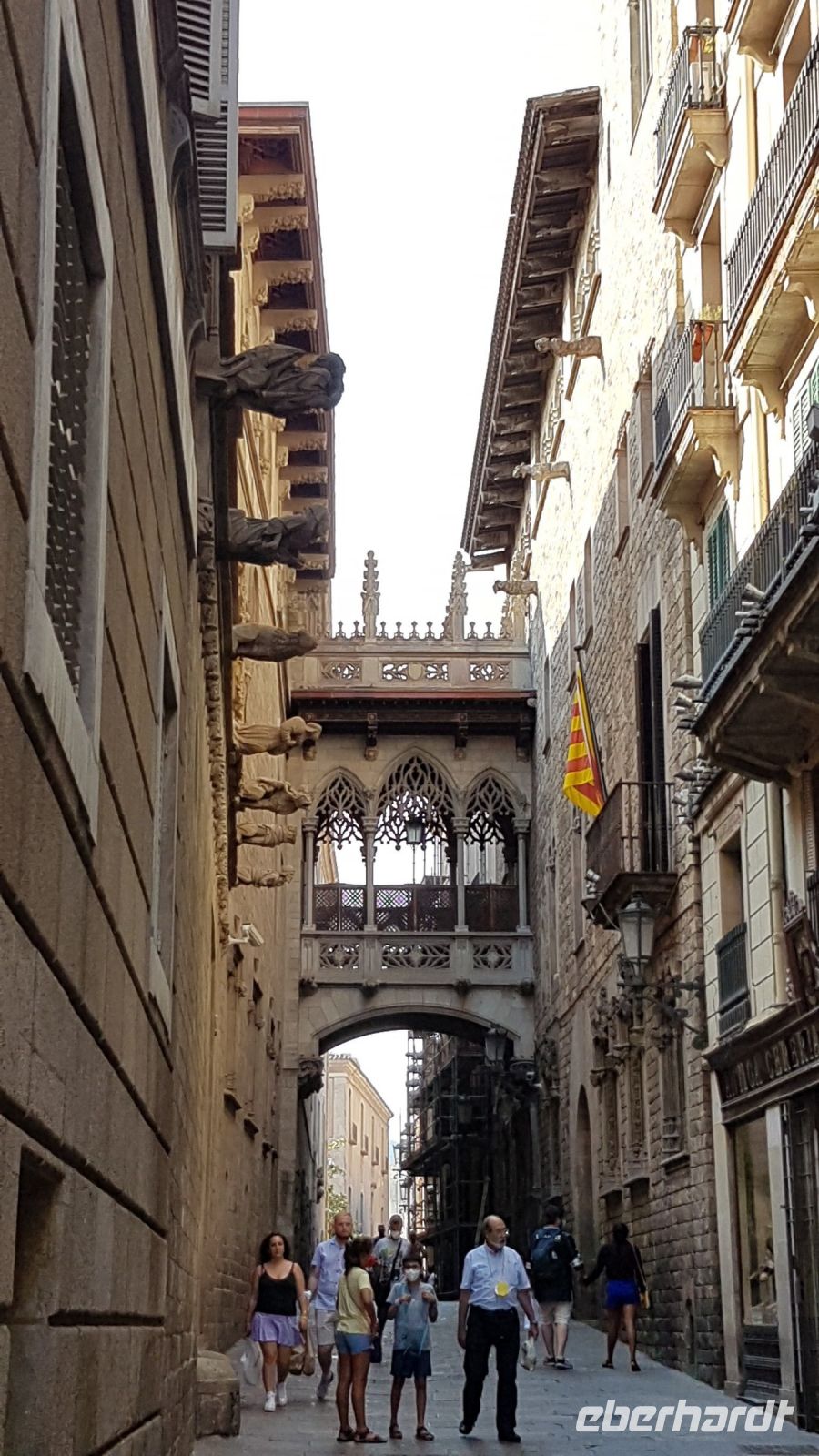 Die Besichtigung von Barcelona steht auf dem Programm, unsere nette und erfahrene Gästeführerin Stefanie bringt uns erst auf den Hügel von Montjuic, um einen schönen Panoramablick über die Stadt zu haben. Dann fahren wir zum Park Güell, eine der vielen Werken in Barcelona vom Architekt Antoni Gaudi. wo wir u.a. die Placa mit der wellenförmigen Sitzgelegenheit und die Pförtnerhäuser mit Zuckergussdächern bewundern können. Anschließend sehen wir die berühmte „Ramblas“, wo die Stadt pulsiert, und den „Barri Gotic“, die Altstadt mit ihren engen Gassen und historischen Gebäude wie z.B. die Kathedrale und der Palast der „Generalitat“ von Katalonien.