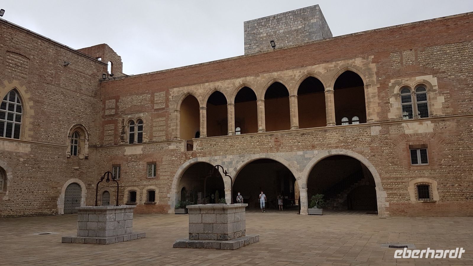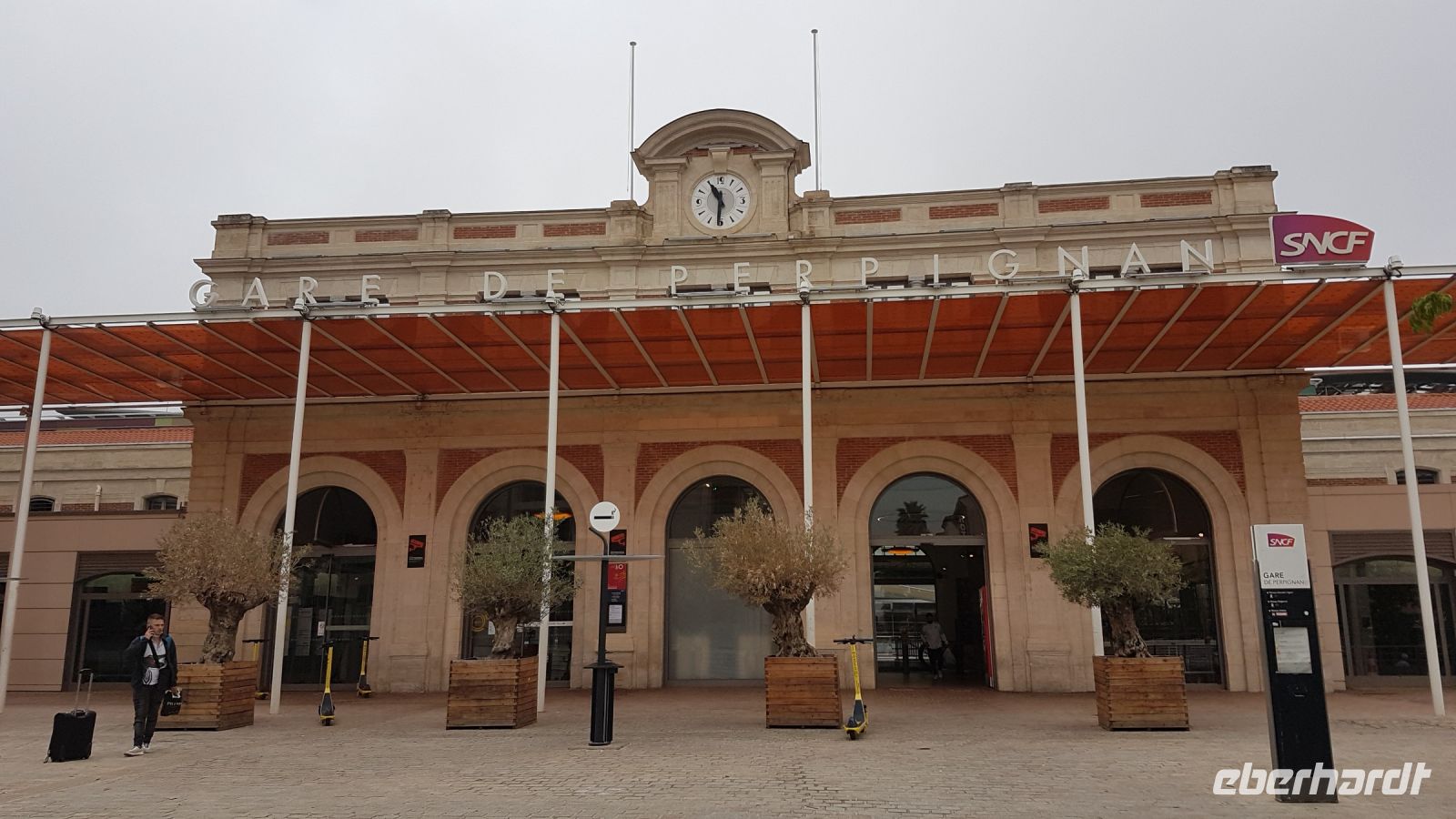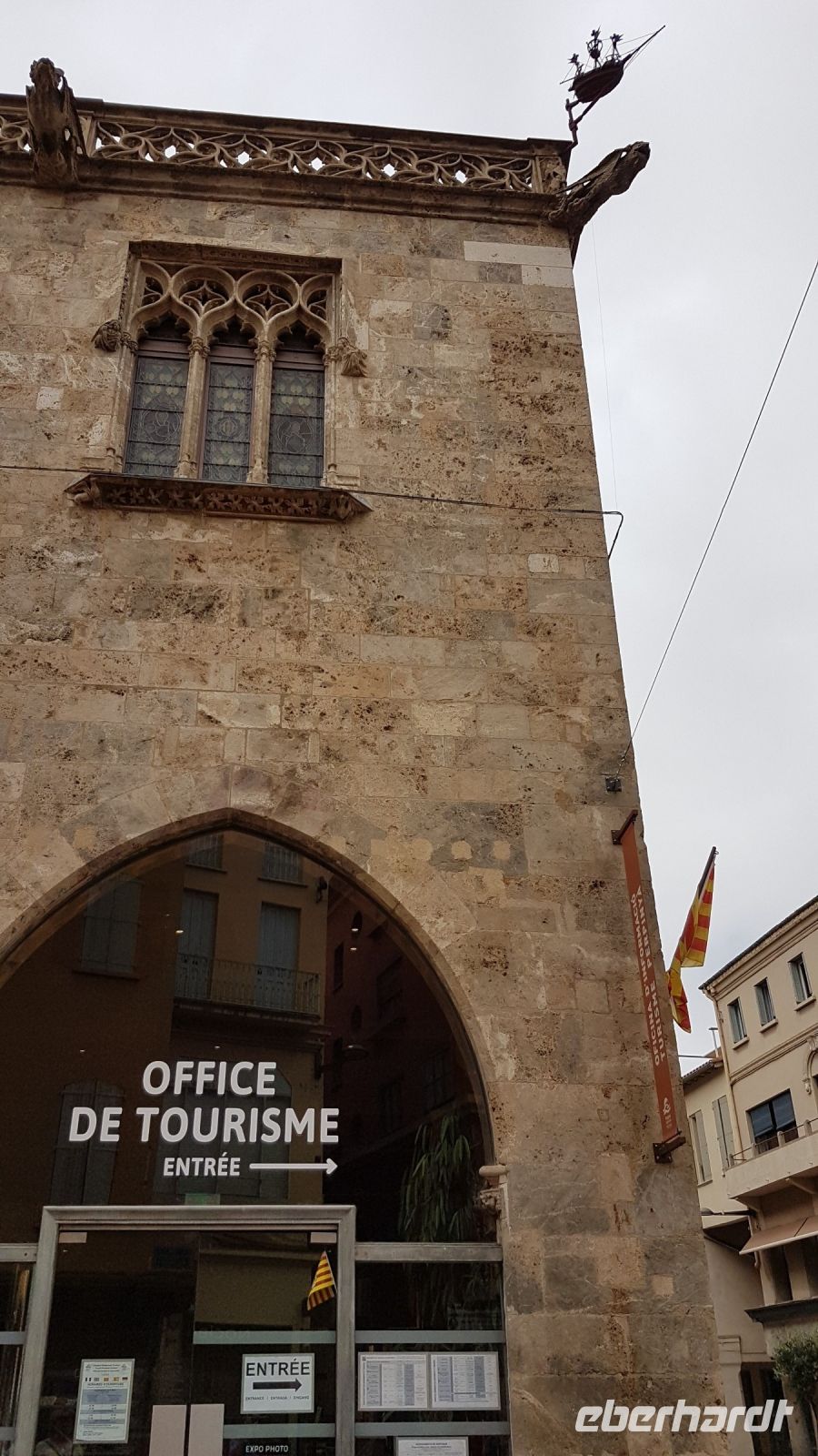 Perpignan, die Hauptstadt des französischen Kataloniens („Nord-Katalonien“, „Roussillon“ und département „Pyrénées-Orientales“), steht heute auf der Tagesordnung. Die Führung beginnt im Zentrum der Welt, für Salvador Dali handelt es sich nämlich um den Bahnhof von Perpignan, durch den er mit seiner Frau Gala und seinen Kunstwerken von seinem Haus in Spanien in die ganze Welt fuhr. Er hatte 1963 in einer kosmogonischen Ekstase die Vision von diesem Bahnhof als Zentrum der Welt und hat sogar ein entsprechendes Gemälde geschaffen. Danach sehen wir den Palast der Könige von Mallorca. An dem Tag ist der Eintritt frei, wir können also die beeindruckende aber jetzt relativ schlichte Anlage besichtigen, auch wenn Teile davon (obere Kapelle) wegen Corona/Umbau geschlossen sind. Unser Weg führt dann in die Altstadt mit Castillet (Stadttor), Kathedrale mit angrenzendem ehemaligen Friedhof Campo Santo (wegen Fotoausstellung geschlossen), Casa Xanxo (typisches mittelalterliches Haus eines Tuchhändlers, leider wegen Umbau geschlossen), Rathaus mit Statue „Mittelmeer“ des Bildhauers Maillol und Seegericht. Am Sonntagvormittag ist die Stadt ziemlich ruhig…...