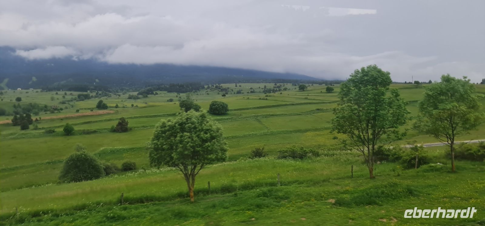 Wir begannen unsere Reise in einem offenen Wagen, aber an der zweiten Station fing es plötzlich an zu regnen. Wir schafften es umzusteigen, als plötzlich ein richtiger Wolkenbruch losging. Die Leute, die im entgegenkommenden Zug fuhren, waren bis auf die Haut nass, aber wir nicht.