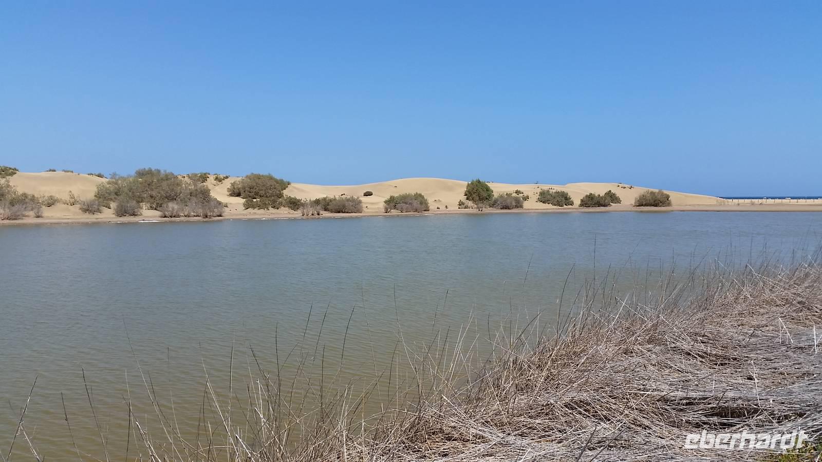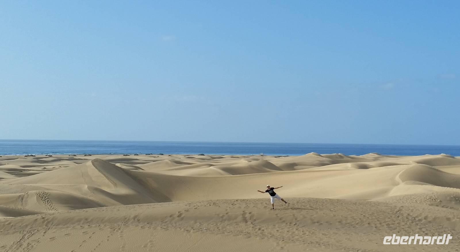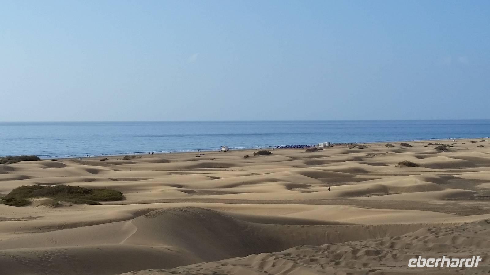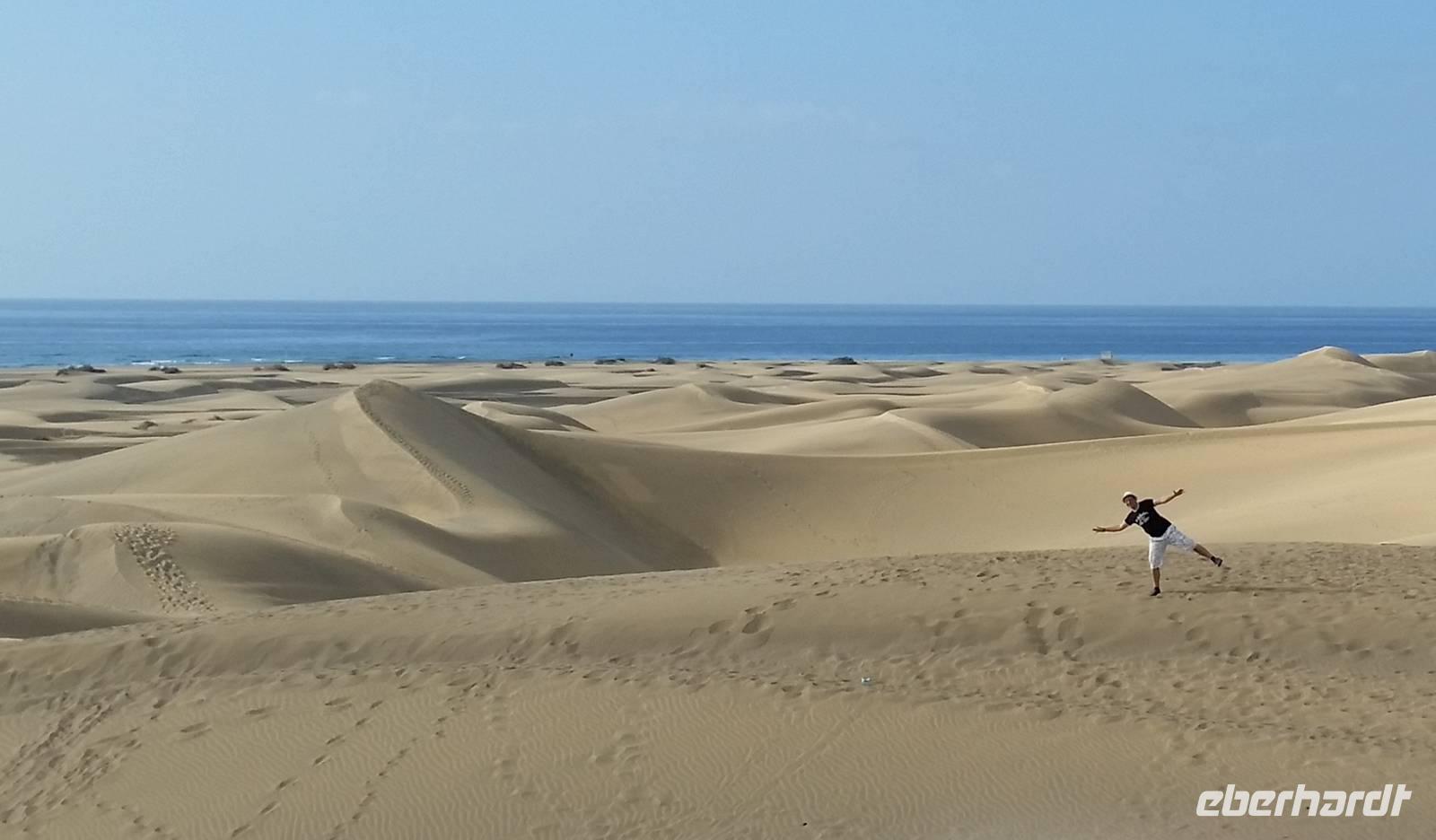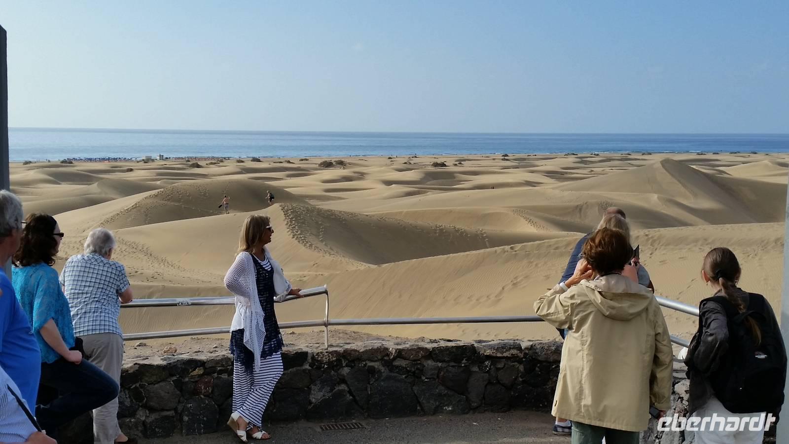 Ein großer Teil der Gruppe nahm heute an dem fakultativen Ausflug "Auf den Spuren der Ureinwohner" teil. Ein paar wenige Gäste blieben im Hotel, um einen ganzen Tag am Meer zu genießen, denn hier am Maspalomas Strand kann man kilometerlang zu Fuß am Meer entlang gehen. Als Überraschung für die ganze Gruppe machten wir einen Spaziergang entlang der Promenade an den Sand-Dünen. So eine Landschaft hatten wir sicher nicht erwartet. Es war wie in der Wüste mit dem Atlantik im Hintergrund. Wir gingen zum Aussichtspunkt von Las Dunas de Maspalomas, wo wir entlang dieser von wüstenähnlichen Dünengebieten geprägten Landschaft einen kleinen Spaziergang machten.