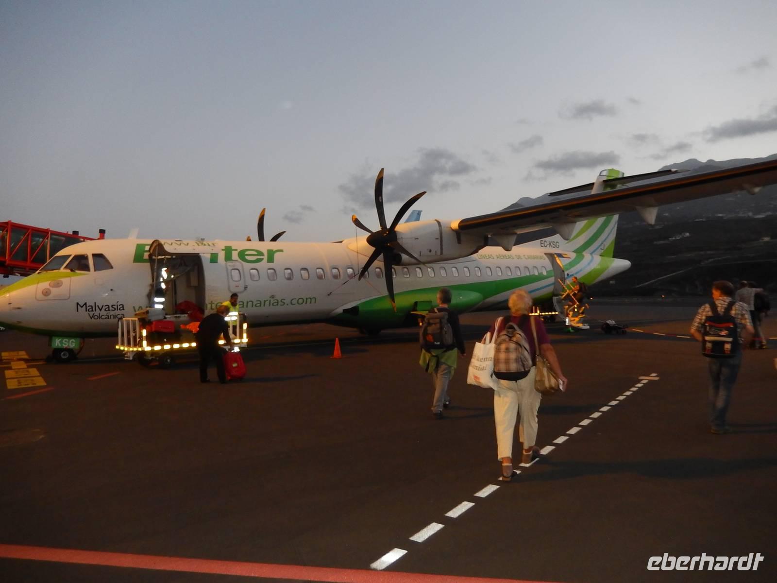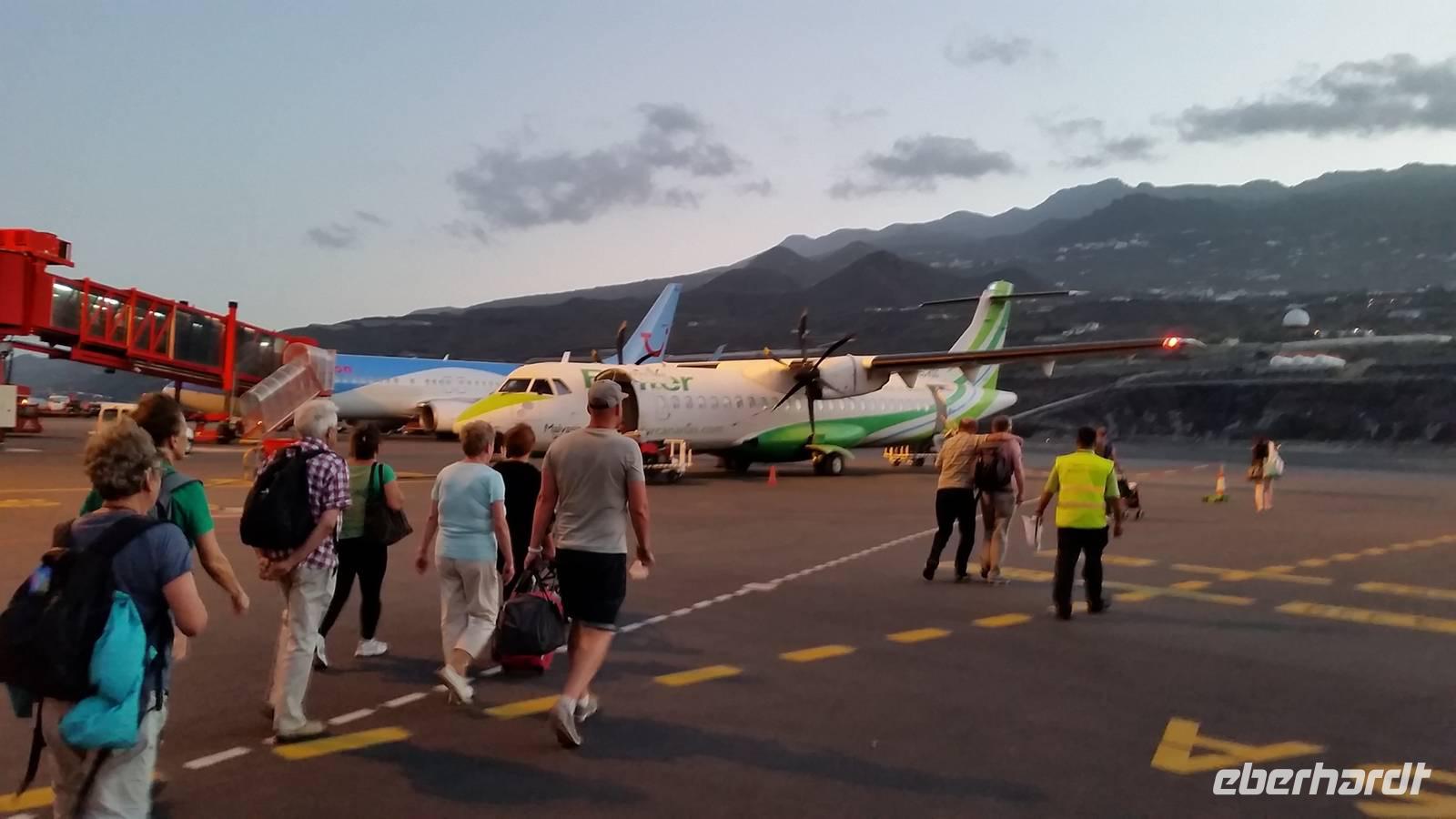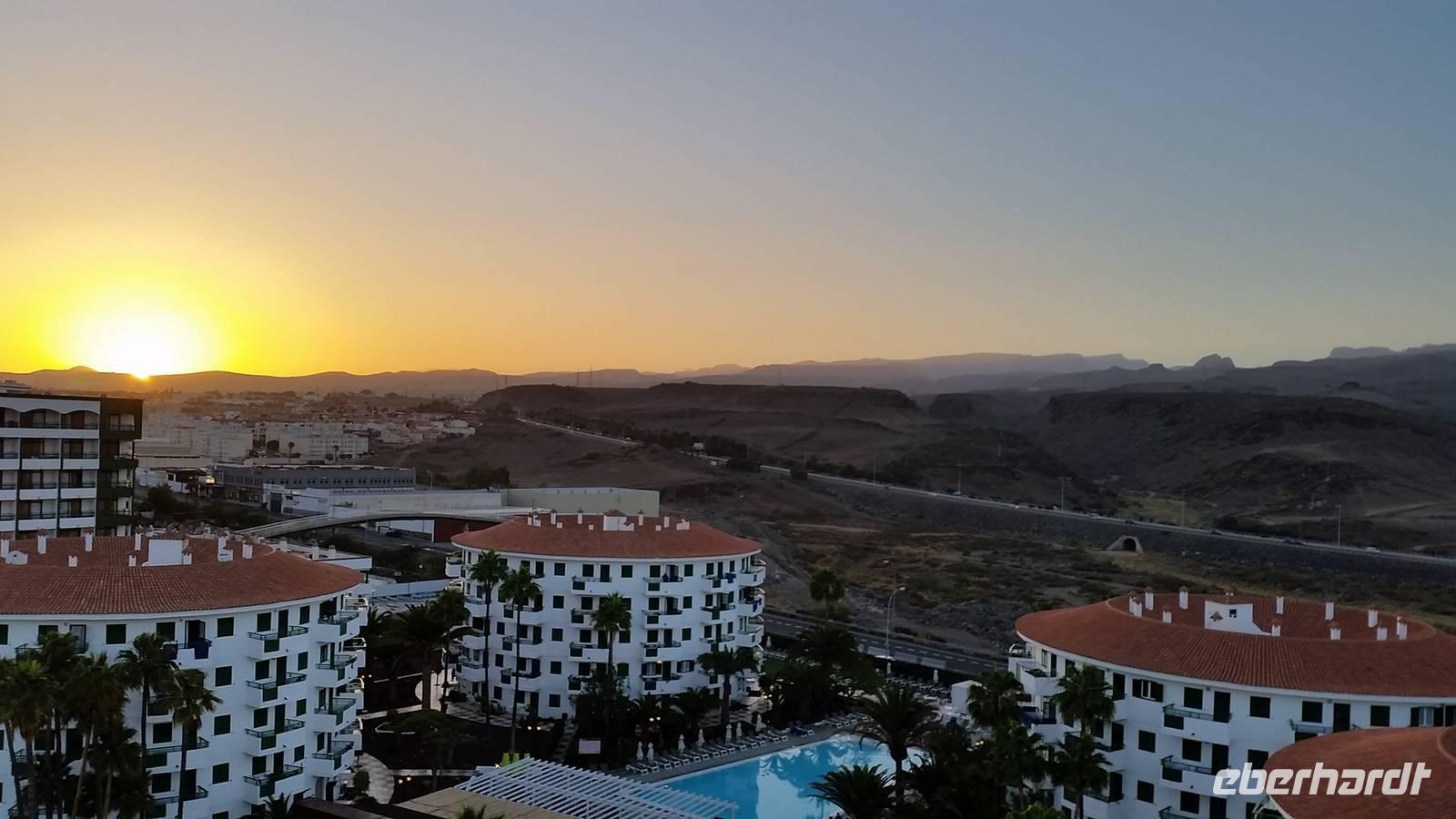 Am Abend genossen wir wieder ein Essen im Apparthotel "Las Olas", bevor wir zum Flughafen gebracht wurden und mit einer kleinen Propellermaschine von Binter Canarias nach Gran Canaria flogen. Begeistert von dieser grünen Insel verabschiedeten wir uns von La Isla Bonita ("Die schöne Insel"). Der Flug mit der Binter Propellermaschine war lustig und in weniger als 50 Minuten waren wir schon auf Gran Canaria. Nach der Landung wurden wir schon von unserem Bus erwartet und zum Hotel an der Playa del Inglés gefahren. Als wir am Flughafen auf unser Gepäck warteten, führten wir zum 4. Mal unser Inselhüpfen-Ritual durch, welches wir schon zu Beginn der Reise eingeführt hatten, wenn wir von einer Insel zu einer anderen „hüpfen". Da diese Reise „Inselhüpfen auf den Kanaren" heißt, begrüßten wir jede Insel, auf der wir gelandet sind, mit einem kleinen Hüpfen auf das Kommando „1,2,3". Alle anderen Passagiere, die auf ihr Gepäck warteten, waren sehr erstaunt, als sie plötzlich 28 Touristen hüpfen sahen, aber wir hatten unseren Spaß. Und wie. Im Zimmer vom Hotel wartete auf uns eine Flasche Wasser, die wir mit Dankbarkeit tranken.