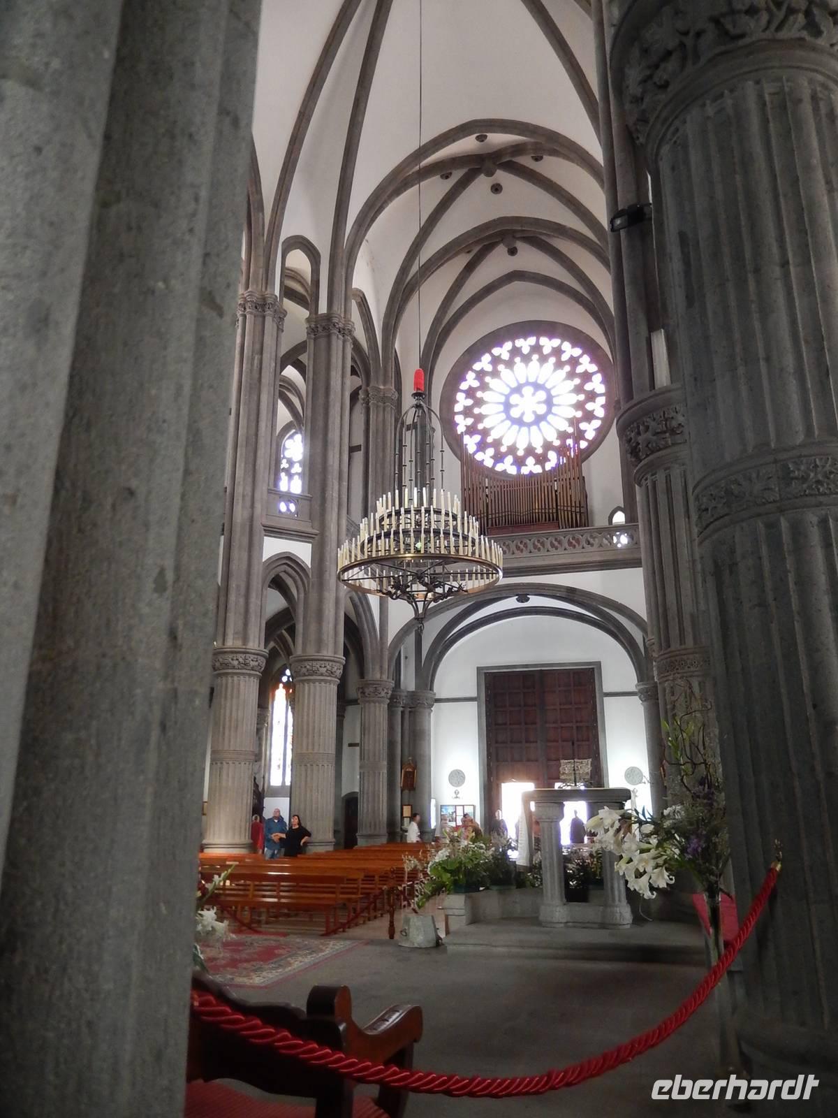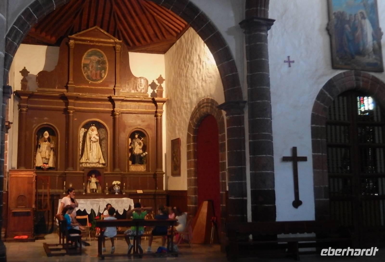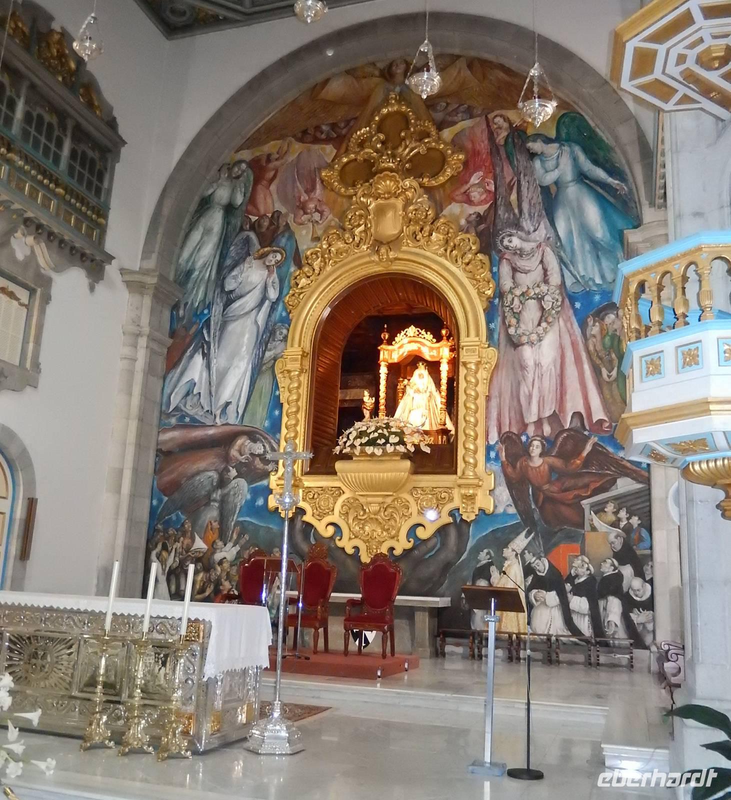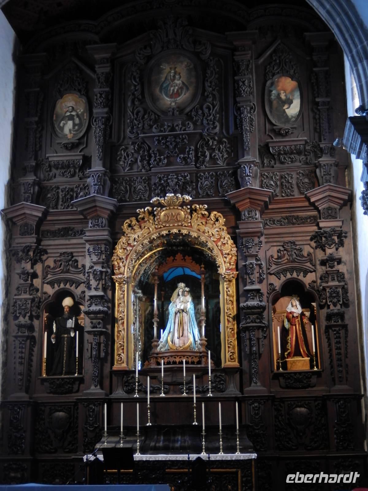 Nach dem Frühstück stand heute ein fakultativer Ausflug in den Norden der Insel auf dem Programm. Bevor wir hoch in die Berge fuhren, besichtigten wir die schöne kleine Haupstadt Santa Cruz de La Palma, mit ihrem Rathaus und dem Altmarkt. Des weiteren besuchten wir die Wallfahrtskirche der Virgen de las Nieves (Jungfrau vom Schnee) mit dem Bildnis der Schutzpatronin der Insel (14. Jahrhundert) und einem tonnenschweren Silber-Altar aus dem 17. Jahrhundert. Zum Mittwoch Morgen war hier fast niemand außer uns, sodass wir uns in Ruhe in die Bänke setzen. Alle fünf Jahre sowie nun in 2015 wird die kleine Madonna in einer großen Prozession nach Santa Cruz gebracht. Hochfest überhaupt.
