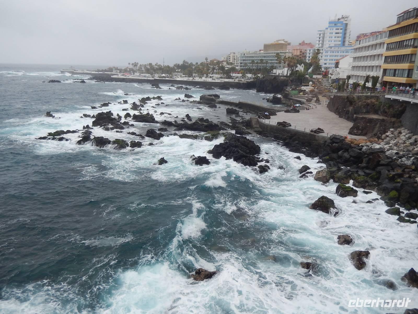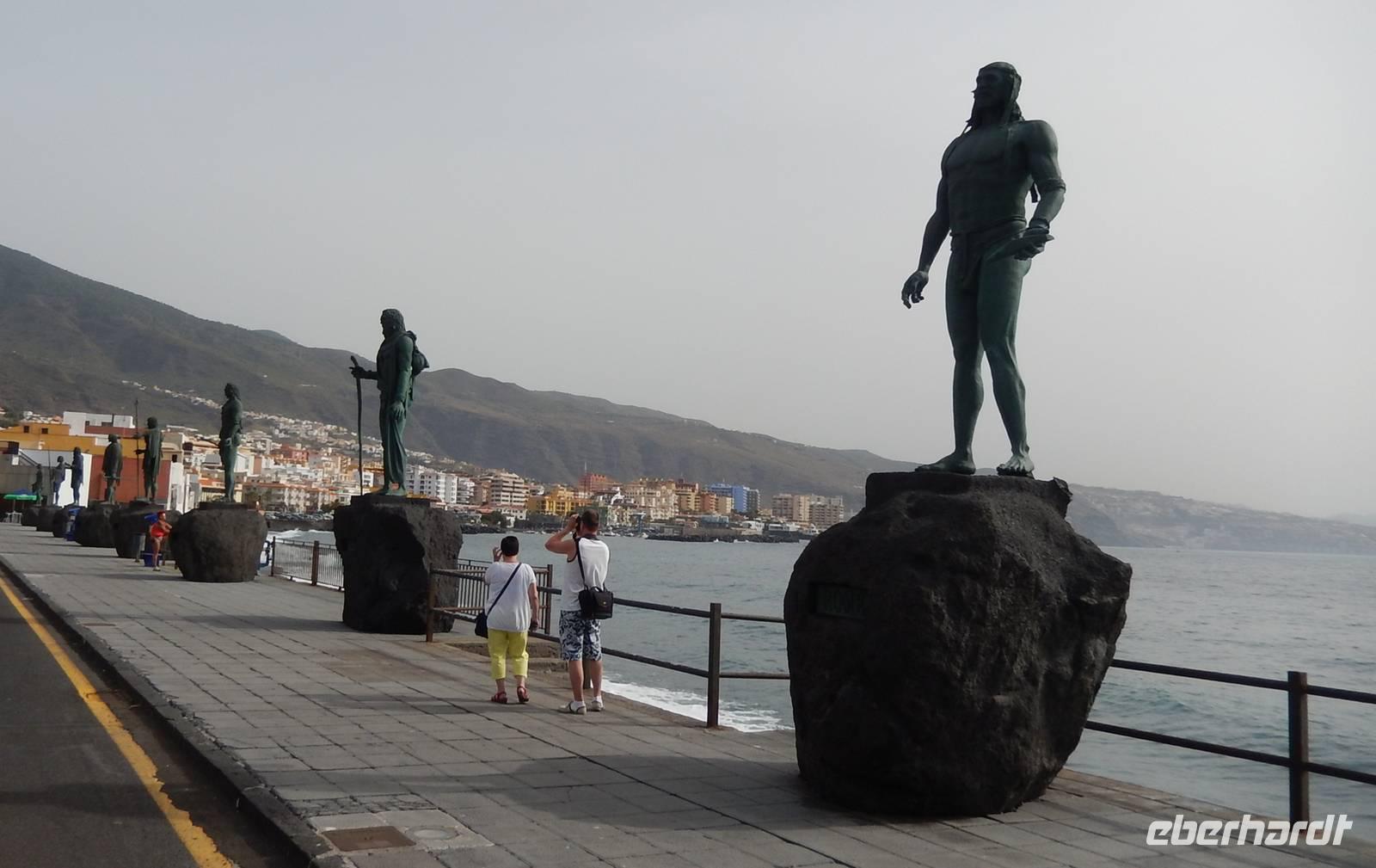 Schräg gegenüber der Kirche, an der Meeresseite des Volksplatzes, entdeckten wir neun überlebensgroße Statuen der bekanntesten Guanchenkönige, die Menceys genannt wurden. Hier boten sich uns die ersten tollen Fotomotive und wir lauschten dem Meeresrauschen, was uns auf den Kanaren willkommen hieß. Benjamin kaufte „Churros und Porras", ein längliches Fettgebäck aus frittiertem Brandteig, für alle, sodass wir die spanische Frühstücks-Spezialität verkosten konnten. Lecker.