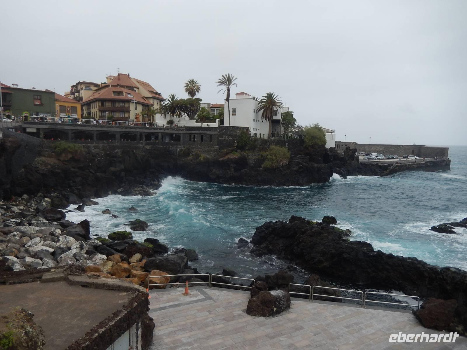 Anschließend reiste die Gruppe weiter nach Garachico. Hier waren wir am Vortag schon auf dem Aussichtspunkt (wo wir wegen Nebel gestern nichts sehen konnten) an der Anhöhe gewesen und hatten einen Überblick über den Ort, die Bucht und die "kleine Insel" im Meer. Der kleine Ort war vor über 500 Jahren von italienischen Kaufleuten gegründet worden und hatte sich zu einem blühenden Hafenstädtchen entwickelt. Der Zuckerrohr- und Weinanbau in der Umgebung von Garachico hatten die Entwicklung zum größten Handelsplatz zwischen den Kanaren, England, Holland und Amerika begünstigt. Lange Zeit war Garachico der wirtschaftlich bedeutendste Ort der Kanaren gewesen. Aus dieser Zeit stammen zahlreiche prächtige Stadthäuser und Klöster. Doch 1706 war das Dorf vom Ausbruch des Vulkans "Montana de Trebejo" überrascht wurden. Zwei rot glühende Lavaströme hatten sich durch das Dorf Garachico bis zum Meer gefressen, der Ort war in einen Dornröschenschlaf gesunken. Für das Ortsbild war dies ein Glücksfall gewesen, denn es wurde so regelrecht konserviert. Beim Bummeln sahen wir die von einer Festung und einem Kloster überragten engen Gassen und kunstvoll geschnitzten Holzbalkone.