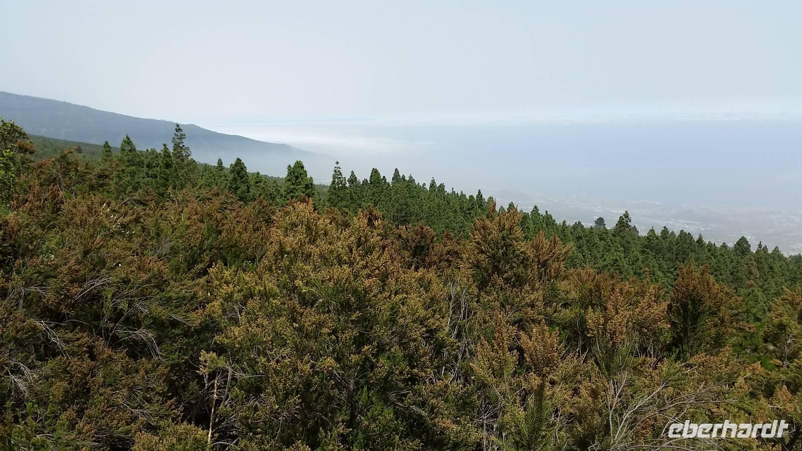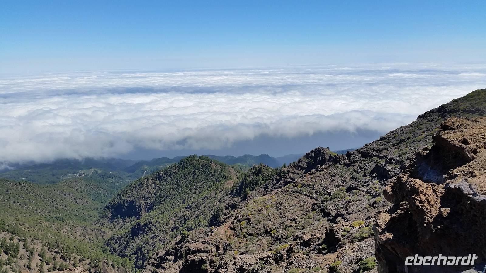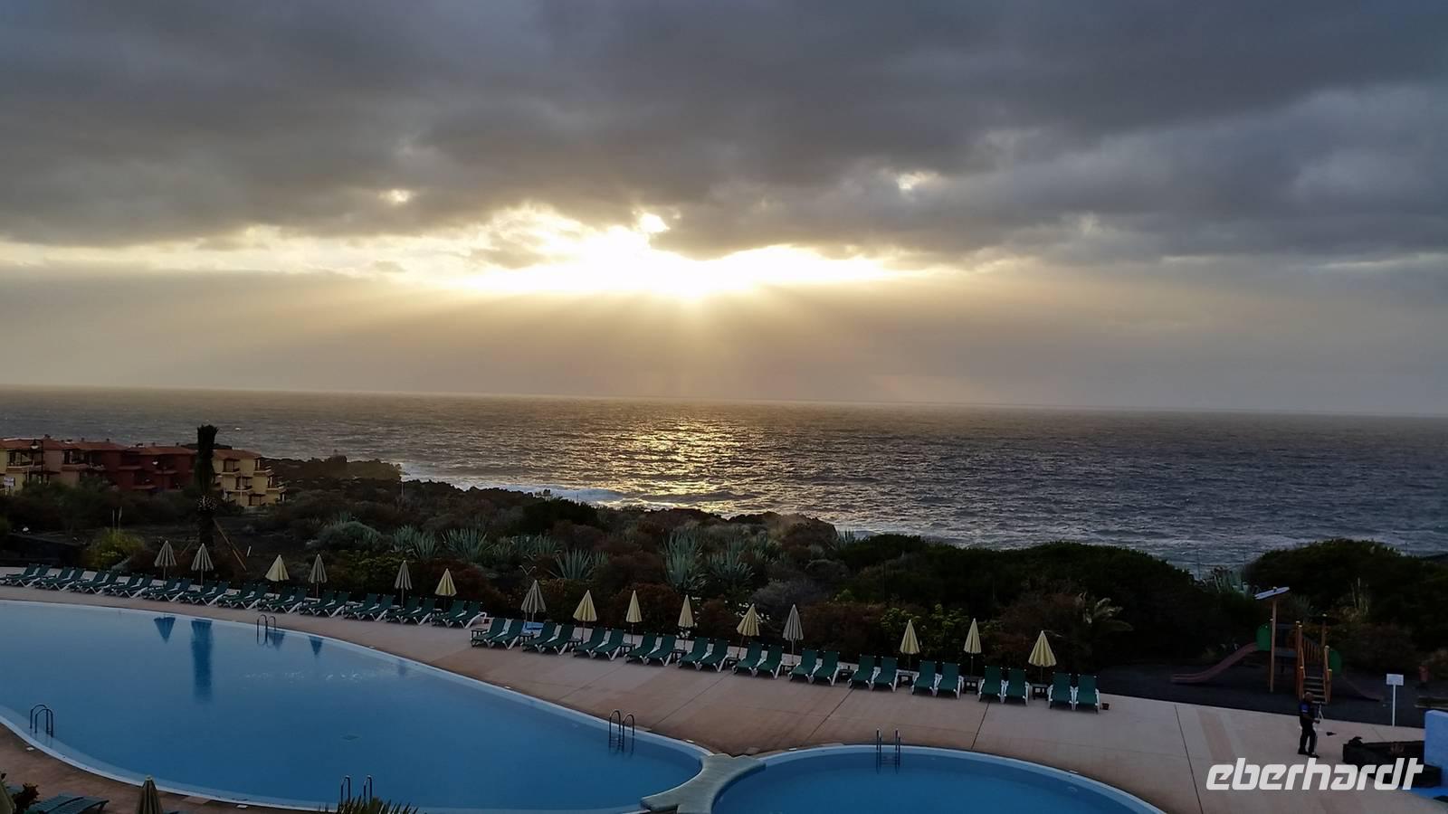 Auf dem Rückweg zum Hotel konnten wir beim Tima Aussichspunkt die so berühmten Passatwolken bestaunen, die vom Osten La Palmas in den Westen ziehen. Sie entstehen durch die Feuchtigkeitsaufnahme des extrem trockenen Grundpassats. Die Passatwolken zählen zu den sogenannten Schönwetterwolken und zeigen die Höhenlage der Passatinversion an. Typischerweise steigen die Passatwolken tagsüber bis auf eine Höhe von 1000 Metern auf. In den Staulagen der Gebirge können die Wolken auch höher aufsteigen, die Passatinversion begrenzt aber auch hier einen weiteren Aufstieg, so dass auch in diesem Fall bestenfalls ein leichter Sprühregen auftreten kann. Nachts lösen sich die Passatwolken wieder auf. Geheimnisse der Natur. Detlef wollte uns noch weiter überraschen und wir fuhren kurz zum Tazacorte wo man Eis bestellen könnten und Benjamin ging wieder schnell ab ins Wasser und schon war er wieder trocken.