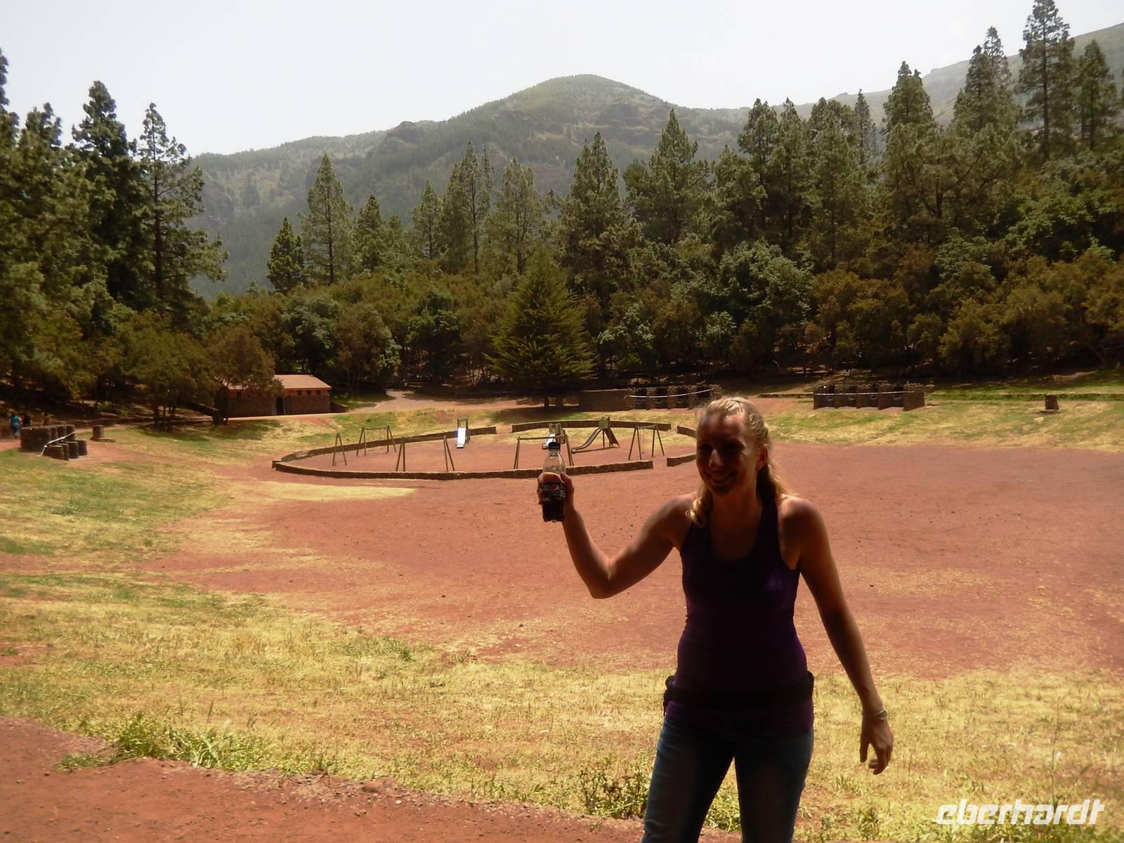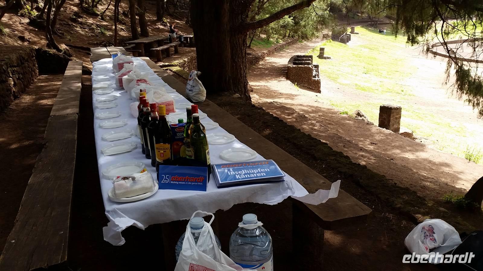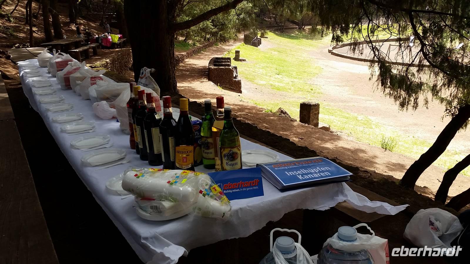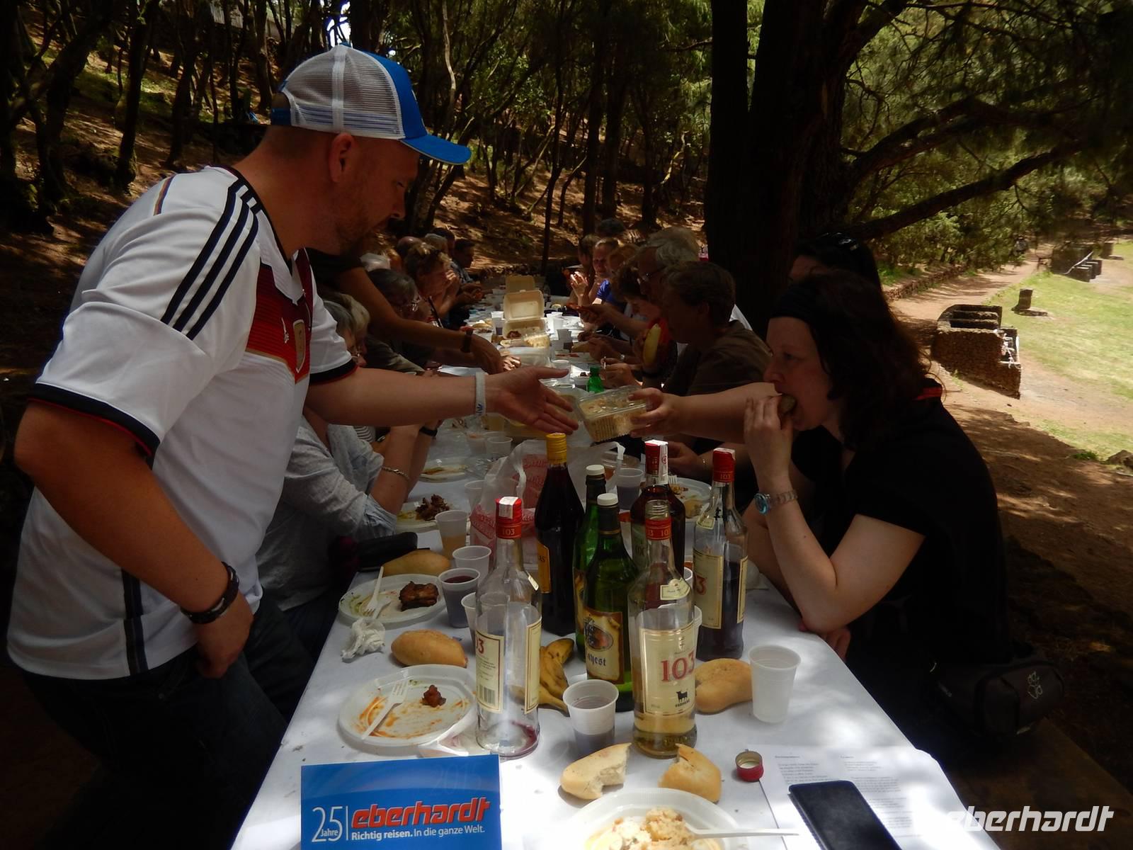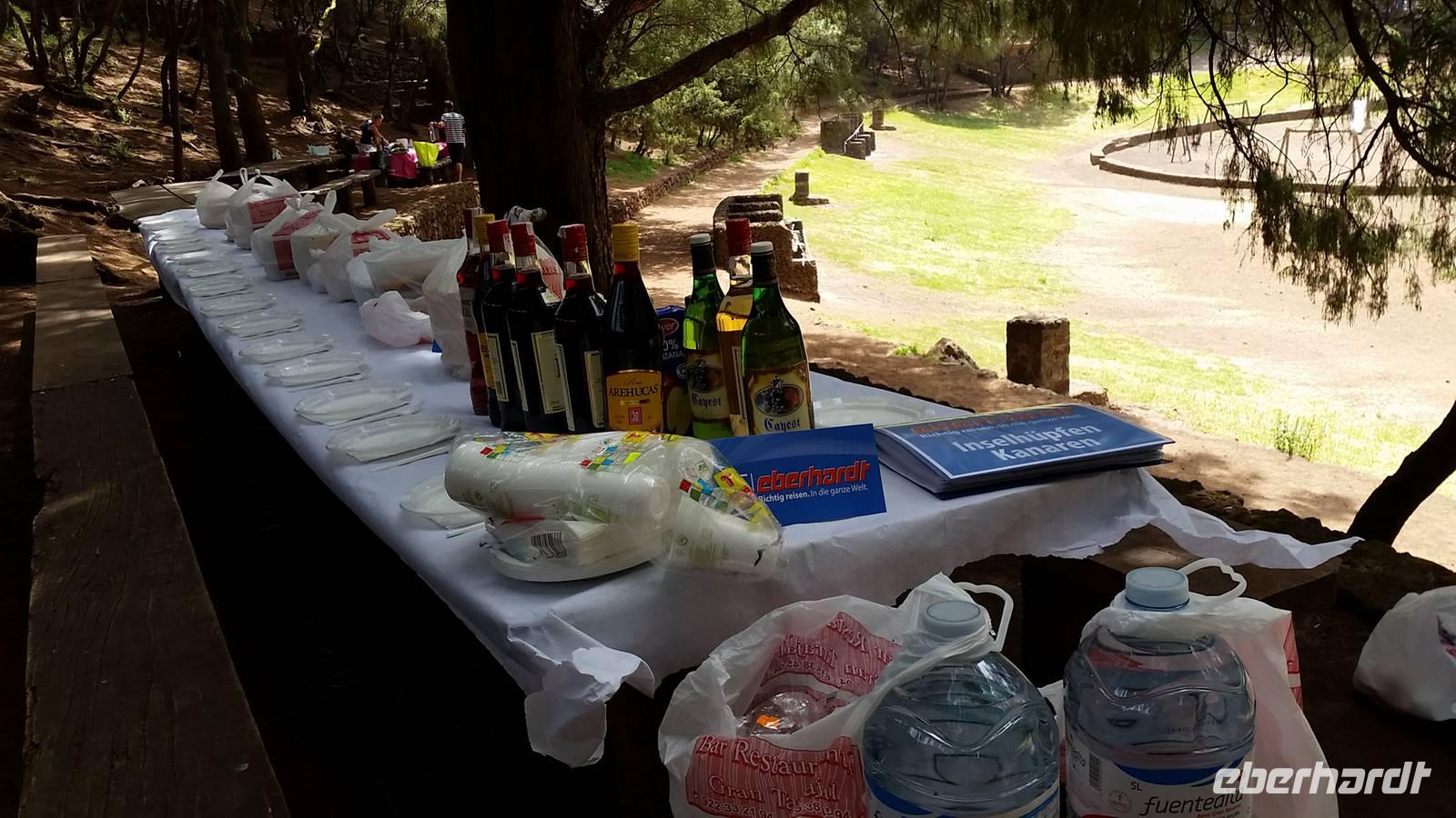 Wir befanden uns jetzt im Norden der Insel Teneriffa und hier oberhalb des Tals erwartete uns ein Überraschungs-Picknick von Eberhardt TRAVEL, welches Benjamin mit Rayco und seiner Familie liebevoll vorbereitet hatte. In einer Höhe von 1450 m hatten wir traumhafte Ausblicke auf Puerto de la Cruz, La Palma sowie den blauen Atlantik und es duftete nach frischem Grün der kanarischen Kiefer. Raycos Familie erwartete uns auf einem wunderschönen Picknickplatz, inmitten eines kleinen Vulkankraters La Caldera, wo sie uns zu hausgemachten Tapas einlud. Zum Beispiel Kanichen, Ziegekäse oder Ziegefleisch und Kicherbsen Eintopf. Alles war sehr sehr lecker und wir probierten, wie gut und gefährlich der einheimische Rotwein sein kann. Dazu sangen wir auf Deutsch, Sächsisch und Spanisch und es wurden einige Witze erzählt. Eine Dame aus Wien kannte einige, die waren ganz gut. Der Wein war so gut, dass auch im Bus noch weiter gesungen und gelacht wurde.
