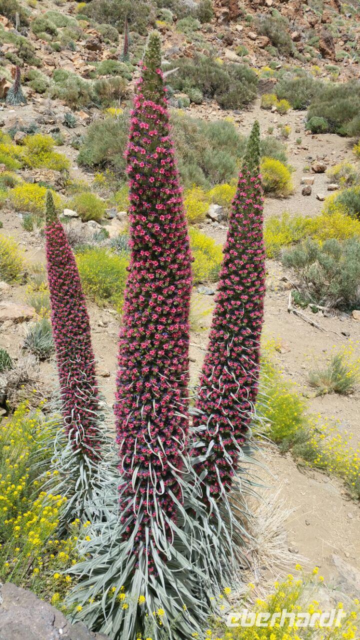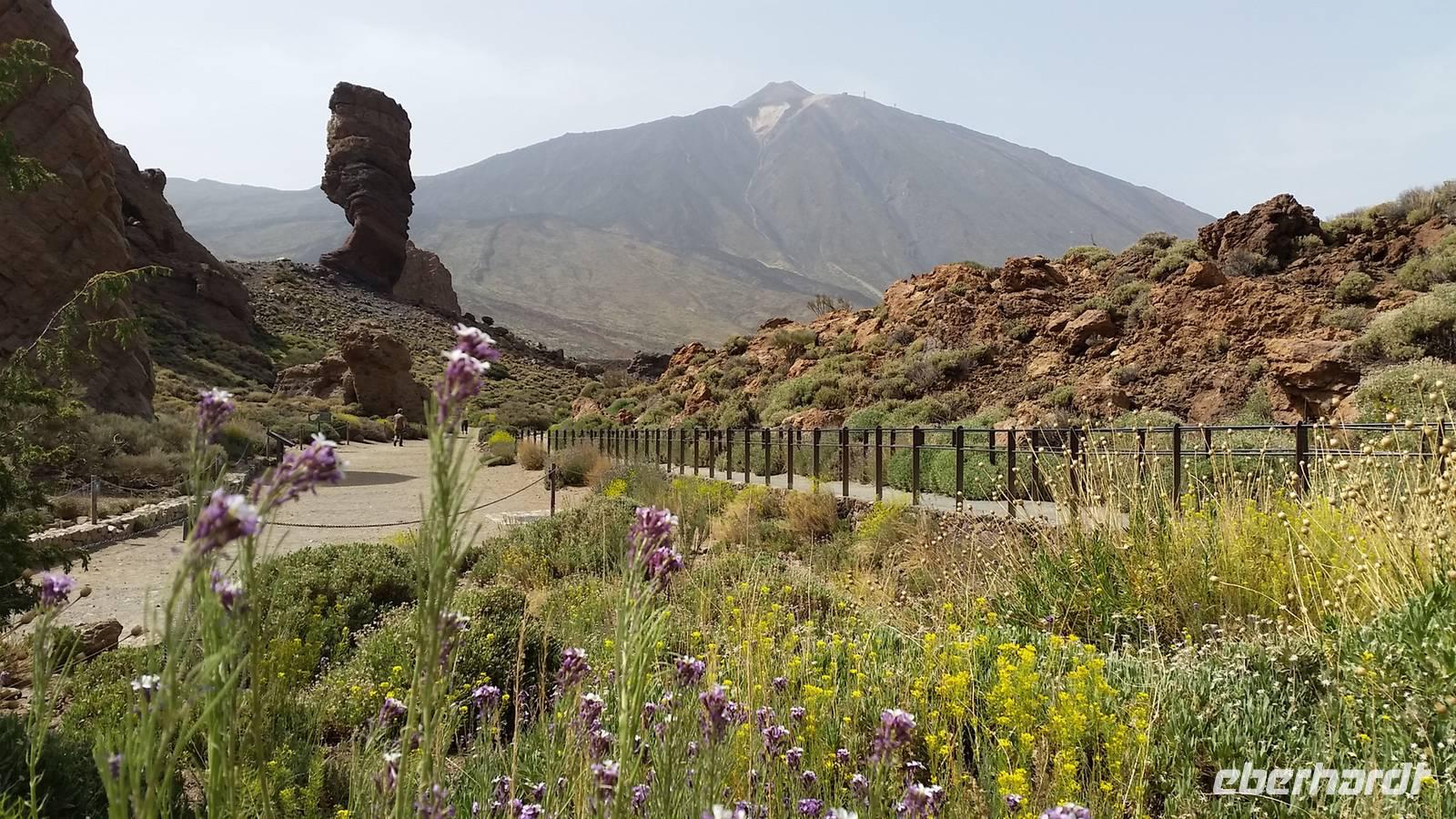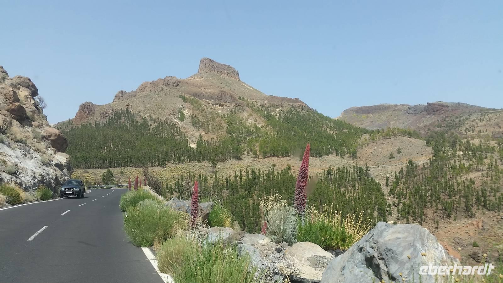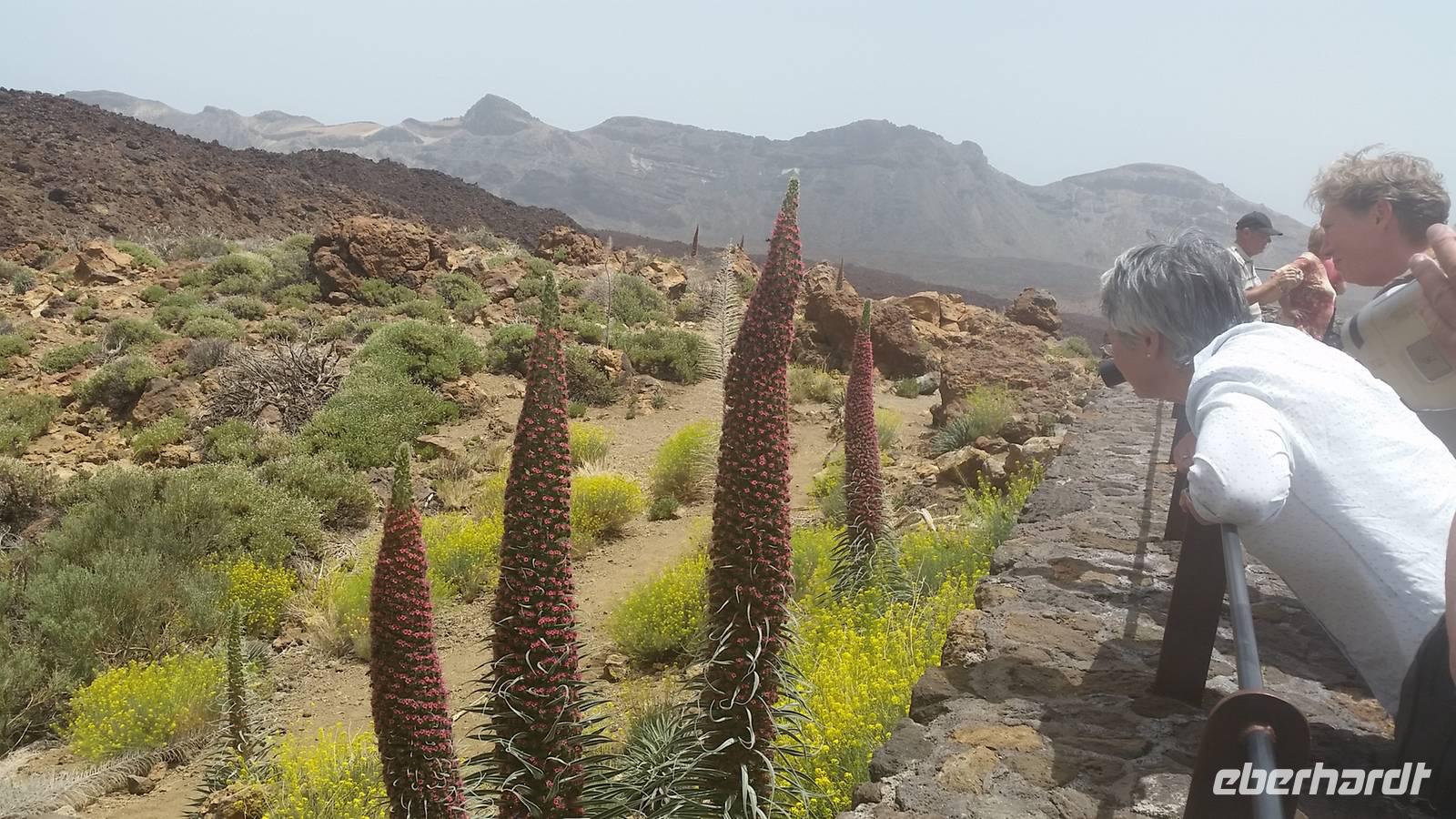 Anschließend fuhren wir zum National Park Teide durch die „Cañadas del Teide", einen ca. 17 Kilometer breiten Vulkankrater des Teide, auf rund 2.100 Meter Höhe. Dieser steht komplett unter Naturschutz. Wir waren alle begeistern von dem Natternkopf. Gerade nun im Mai ist es hier am schönsten!!! Herrlich. Die Seilbahn war heute offen: was für ein Glück! Manchmal wegen Wind oder Reparaturarbeit ist geschlossen. Von unten aber auch von oben konnte man den „Pico del Teide" gut bestaunen, der mit 3.718 Metern der höchste Berg Spaniens und der dritthöchste Inselvulkan der Welt ist. Wir unternahmen da oben einen kleinen Spaziergang und später unten von der Seilbahn durch den Nationalpark und besichtigten die Roques de Garcia, eine Felsformation unterhalb des Vulkans Teide.