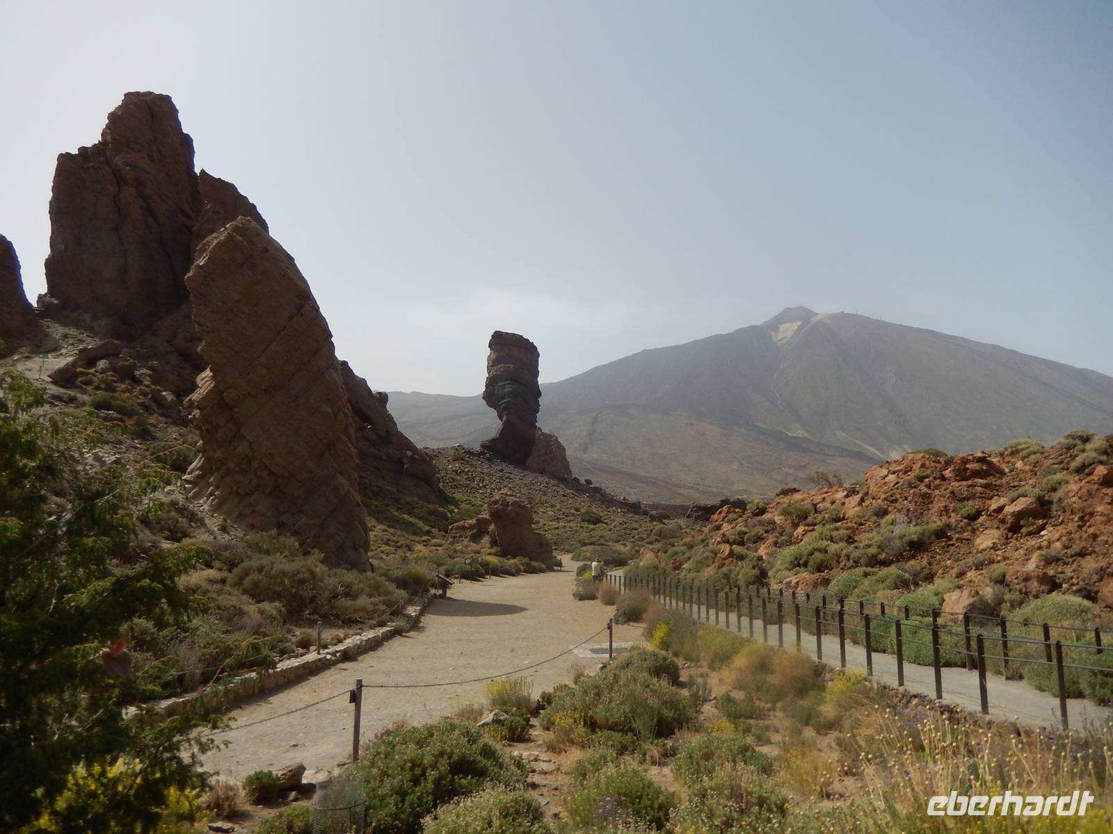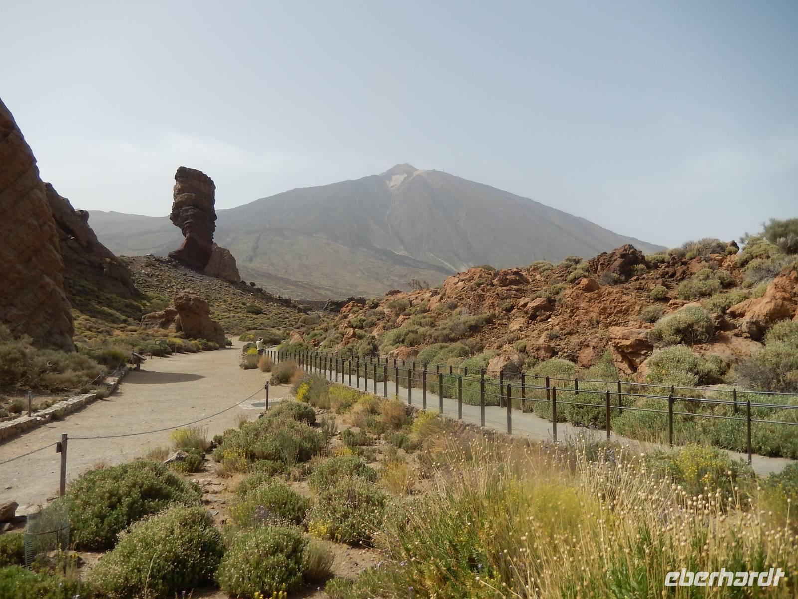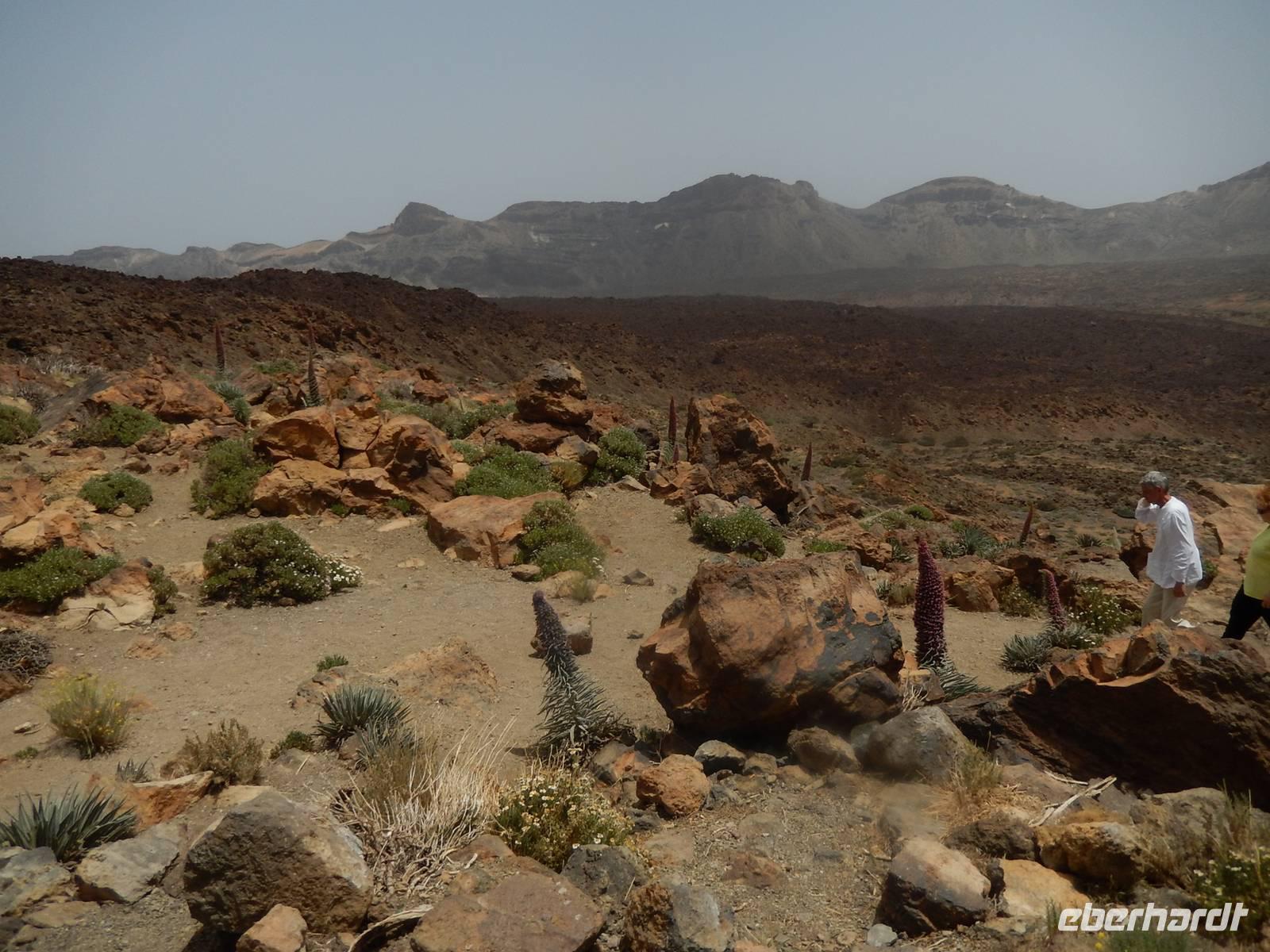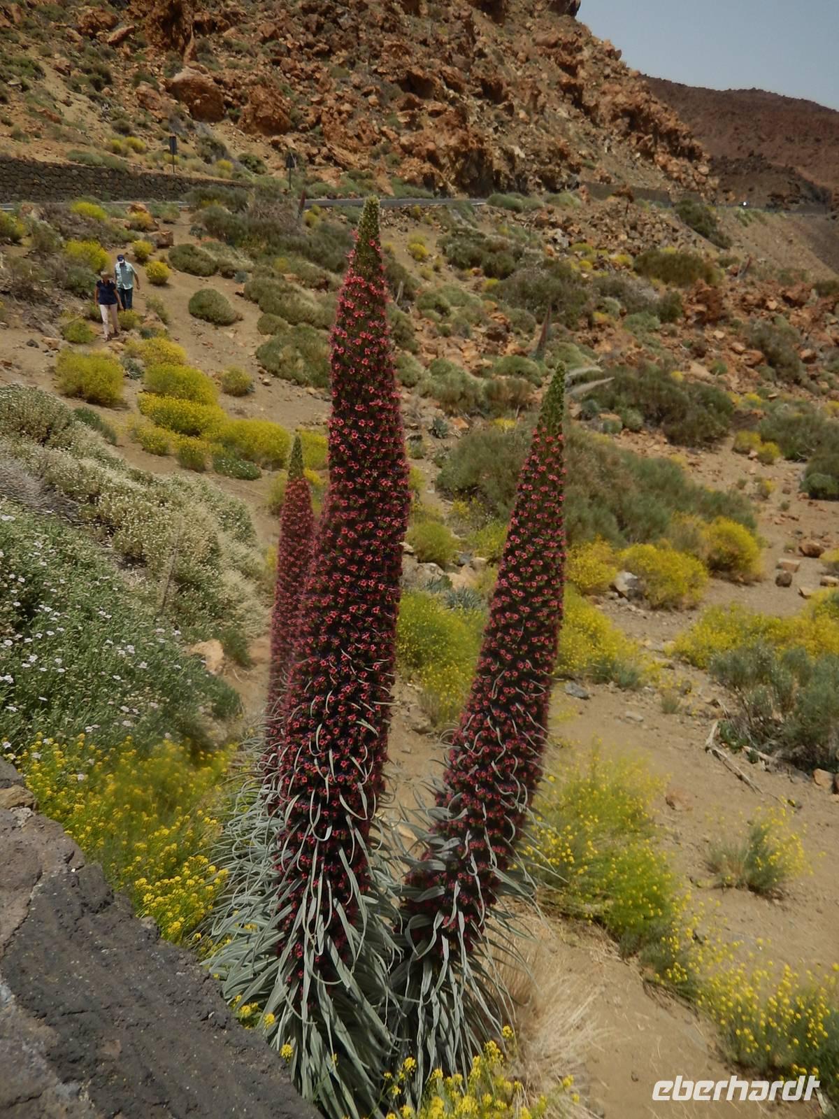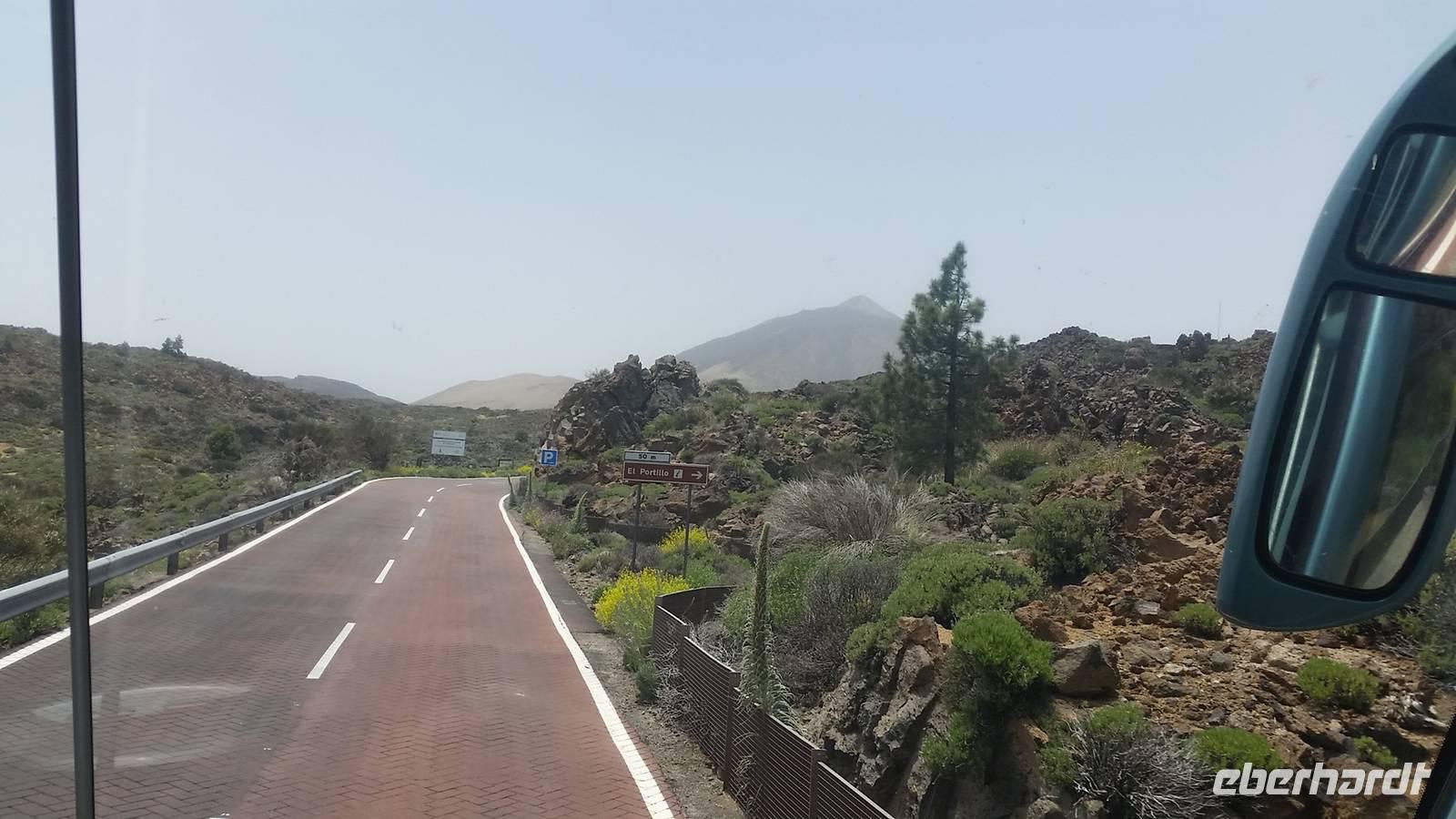 Anschließend fuhren wir zum National Park Teide durch die „Cañadas del Teide", einen ca. 17 Kilometer breiten Vulkankrater des Teide, auf rund 2.100 Meter Höhe. Dieser steht komplett unter Naturschutz. Wir waren alle begeistern von dem Natternkopf. Gerade nun im Mai ist es hier am schönsten!!! Herrlich. Die Seilbahn war heute offen: was für ein Glück! Manchmal wegen Wind oder Reparaturarbeit ist geschlossen. Von unten aber auch von oben konnte man den „Pico del Teide" gut bestaunen, der mit 3.718 Metern der höchste Berg Spaniens und der dritthöchste Inselvulkan der Welt ist. Wir unternahmen da oben einen kleinen Spaziergang und später unten von der Seilbahn durch den Nationalpark und besichtigten die Roques de Garcia, eine Felsformation unterhalb des Vulkans Teide.