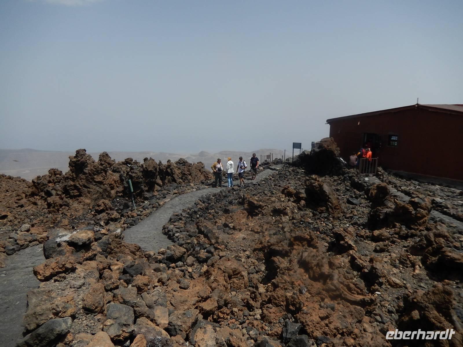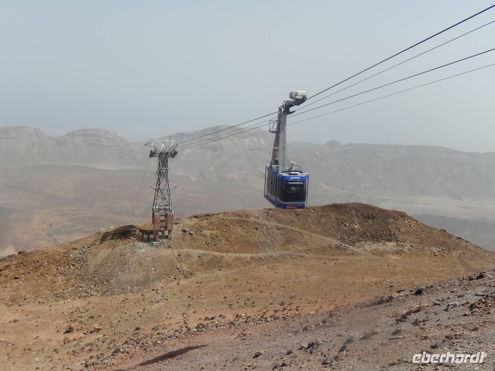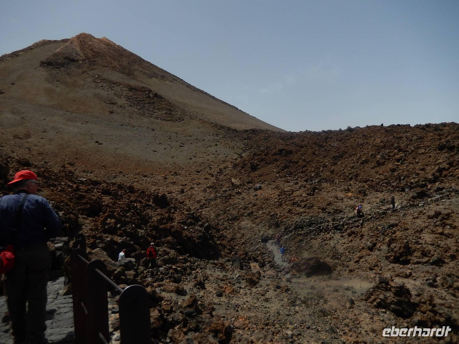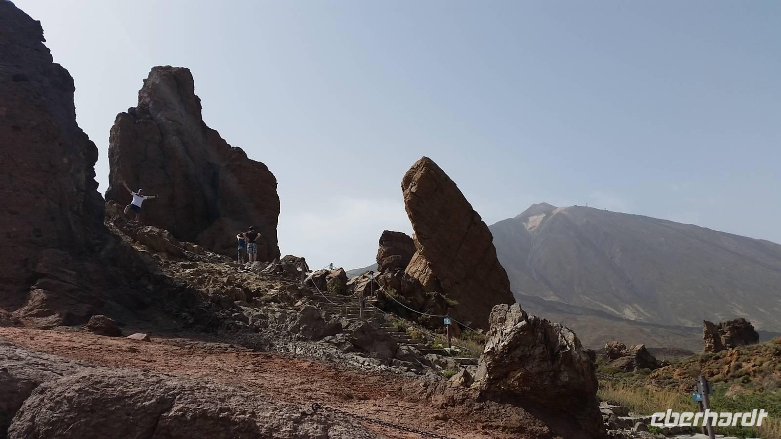 Anschließend fuhren wir zum National Park Teide durch die „Cañadas del Teide", einen ca. 17 Kilometer breiten Vulkankrater des Teide, auf rund 2.100 Meter Höhe. Dieser steht komplett unter Naturschutz. Wir waren alle begeistern von dem Natternkopf. Gerade nun im Mai ist es hier am schönsten!!! Herrlich. Die Seilbahn war heute offen: was für ein Glück! Manchmal wegen Wind oder Reparaturarbeit ist geschlossen. Von unten aber auch von oben konnte man den „Pico del Teide" gut bestaunen, der mit 3.718 Metern der höchste Berg Spaniens und der dritthöchste Inselvulkan der Welt ist. Wir unternahmen da oben einen kleinen Spaziergang und später unten von der Seilbahn durch den Nationalpark und besichtigten die Roques de Garcia, eine Felsformation unterhalb des Vulkans Teide.