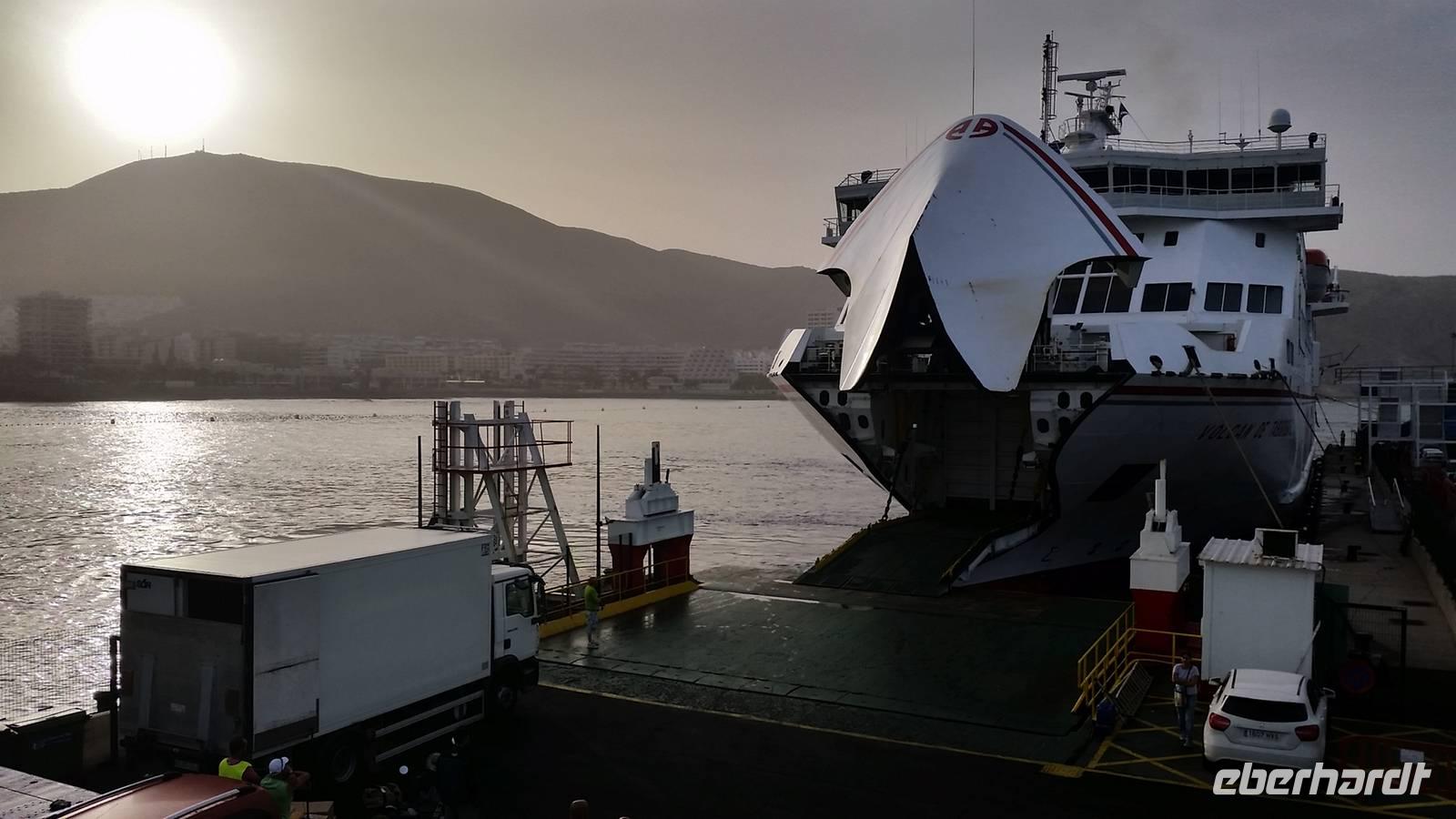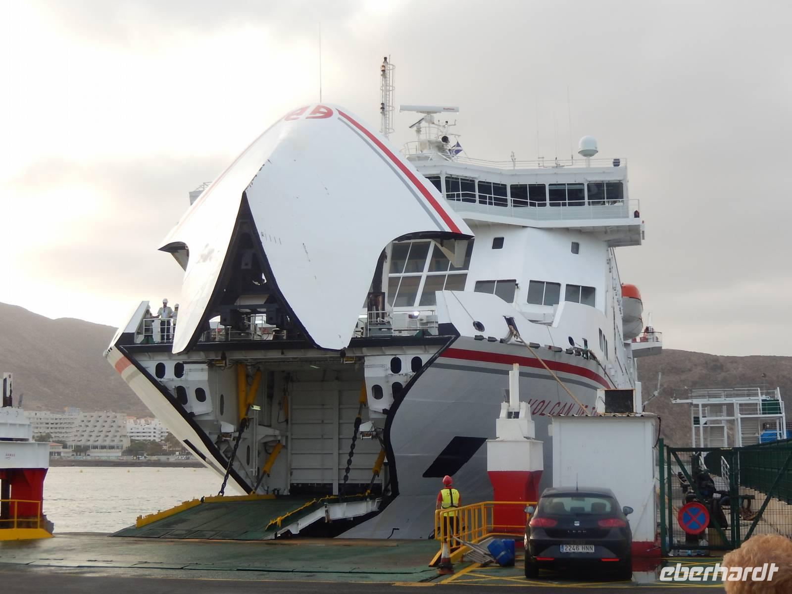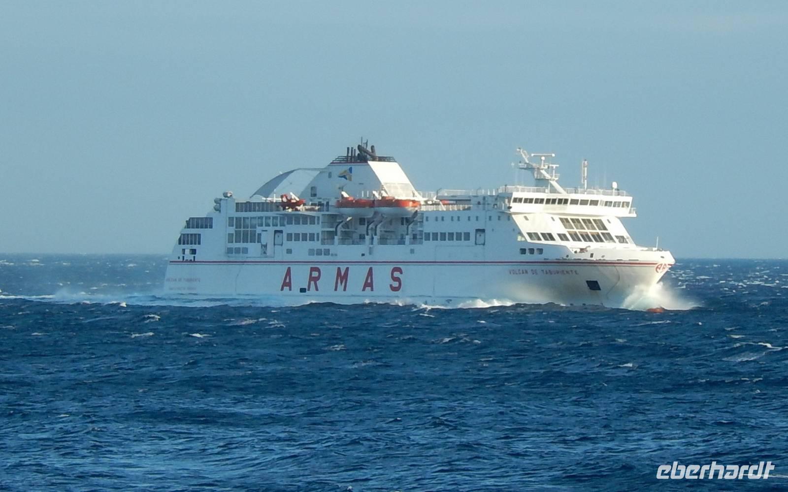 Um nicht seekrank zu werden, ist es besser, auf der Fähre nicht ganz vorn zu sitzen. Aber heute war das Meer nicht besonders ruhig und 2 von uns hatten kleine Schwierigkeiten. Die Fahrt war herrlich, vorbei an der Nordküste La Gomeras, mit Blick auf den Teide und die Steilküste von Los Gigantes und mit einem unvergesslichen Sonnenuntergang auf dem Meer. 2 Stunden später am Abend erreichten wir La Palma und wurden zu unserem wunderschönen Apparhotel Las Olas in Los Cancajos chauffiert. Wir waren schon müde und mit dem Lied „Sandmann, lieber Sandmann" gingen wir ins Bett.